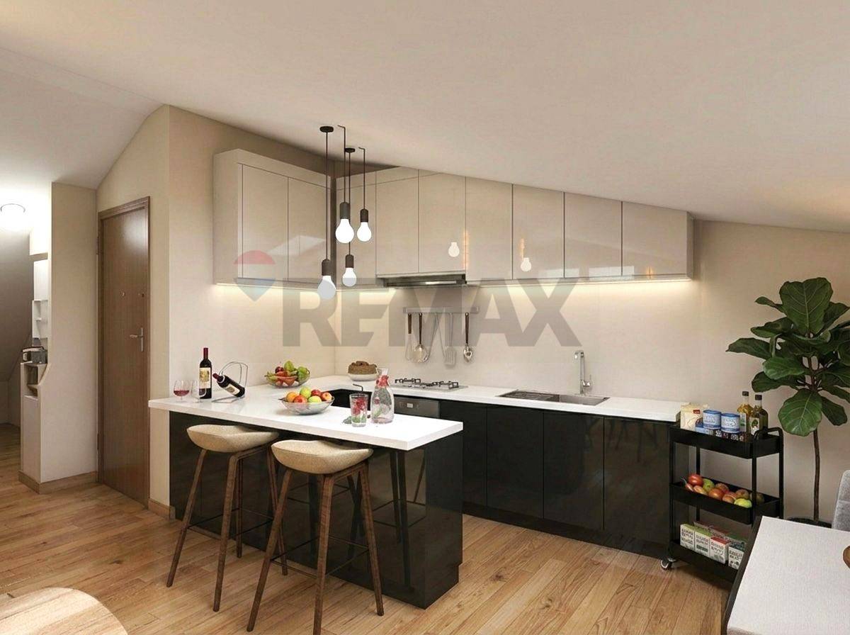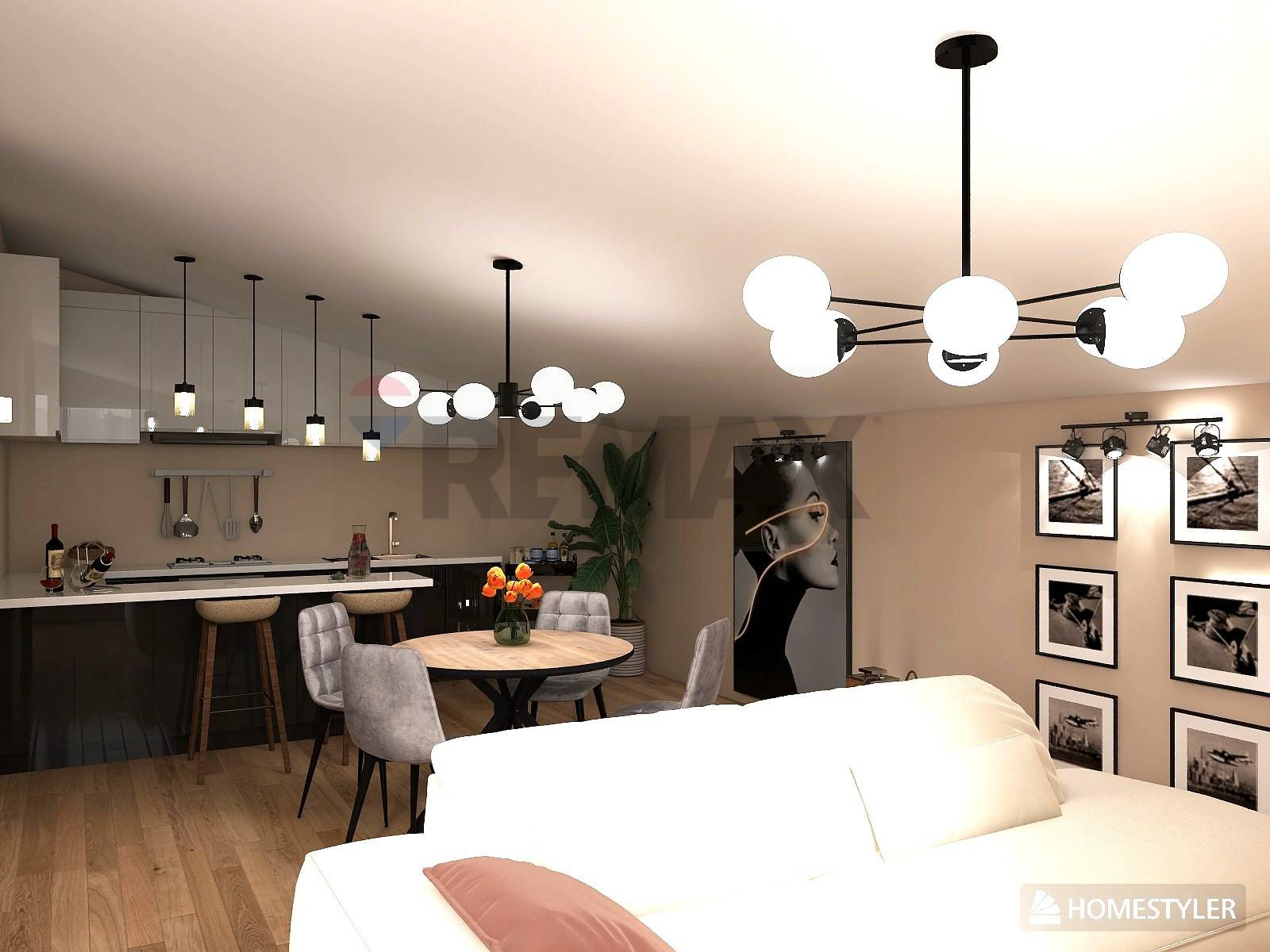 Il soggiorno si divide armoniosamente tra l'area relax e una moderna zona cottura completa di arredi all'avanguardia.