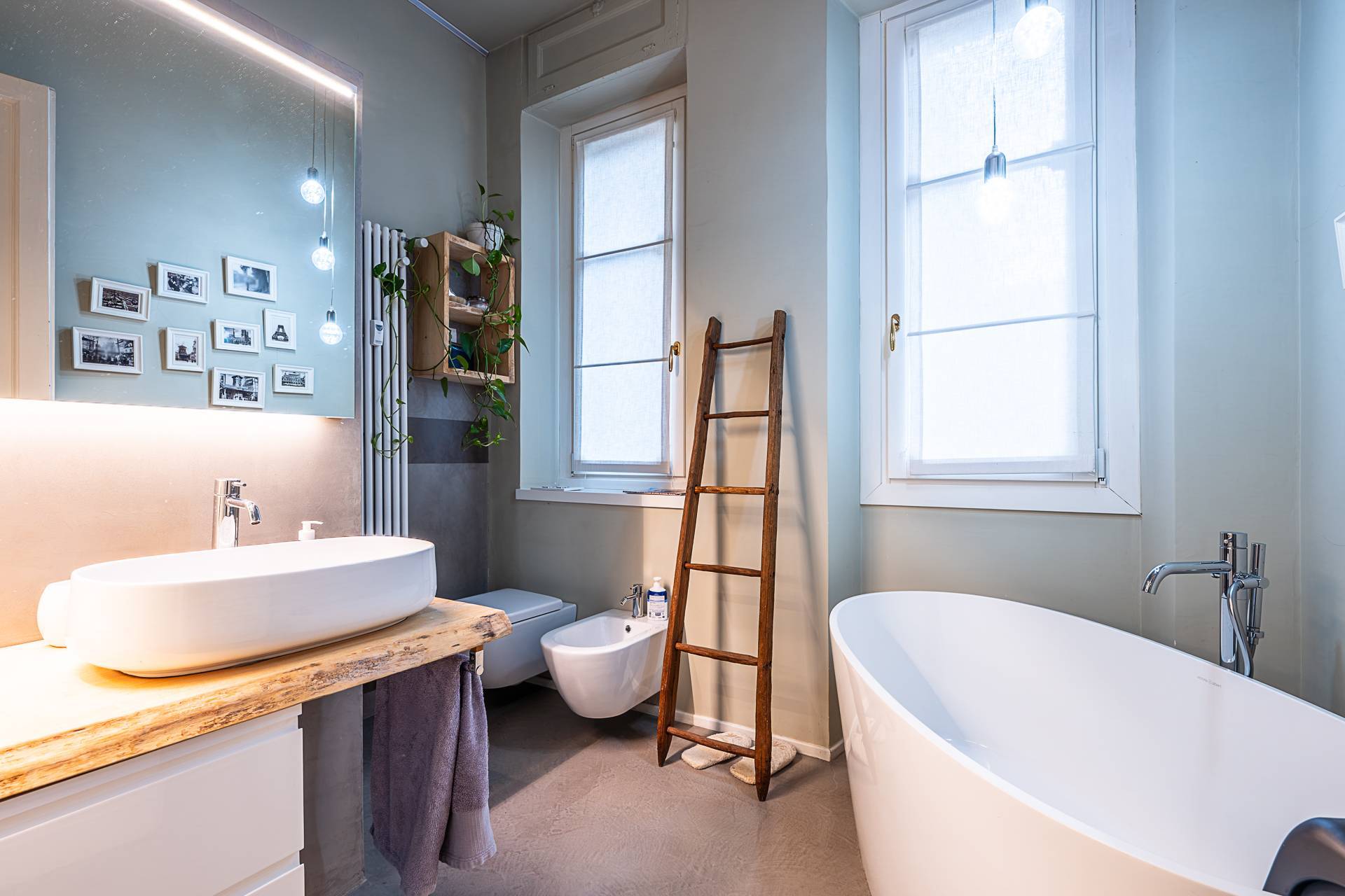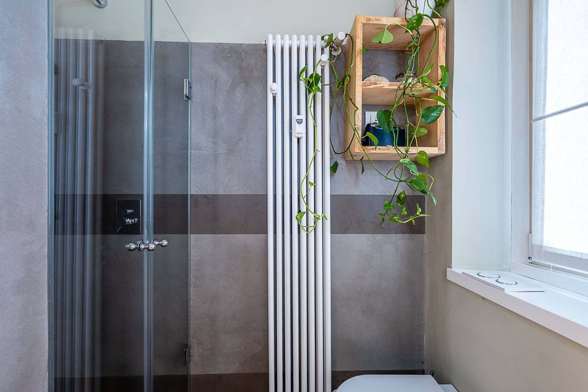 La sala da bagno ha la pavimentazione in resina.
