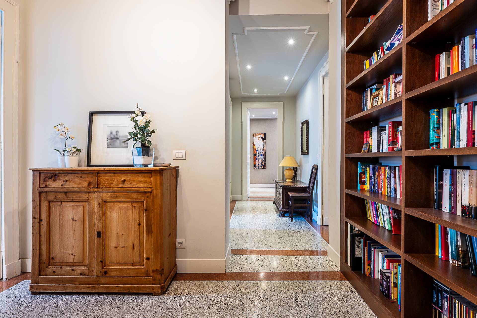 I soffitti di quasi tutti i locali hanno le decorazioni originali (stucchi in gesso interamente manutenuti). La pavimentazione delle camere in parquet rovere originale inchiodato (ed eccezione della camera pi piccola che ha il parquet nuovo), negli altri ambienti in seminato d'epoca con disegni in mosaico di marmo.