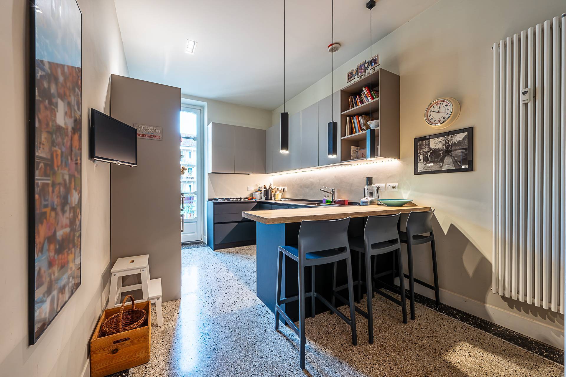 La cucina (Arredo3) ha il piano di lavoro in grs ed comprensiva di tutti gli elettrodomestici (frigo, forno, lavatrice, microonde, lavastoviglie). La libreria su misura, in legno.