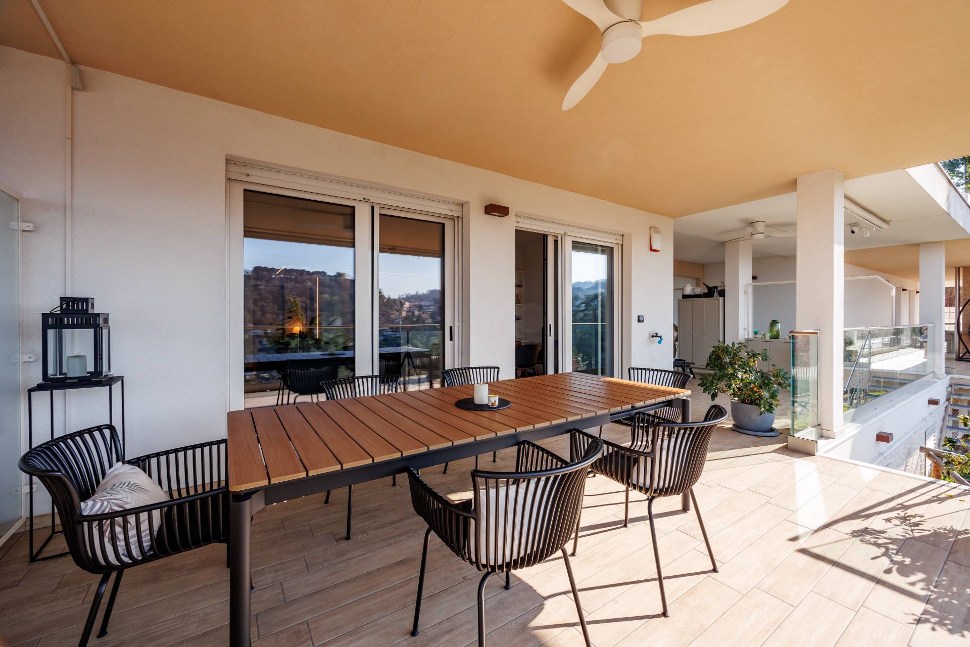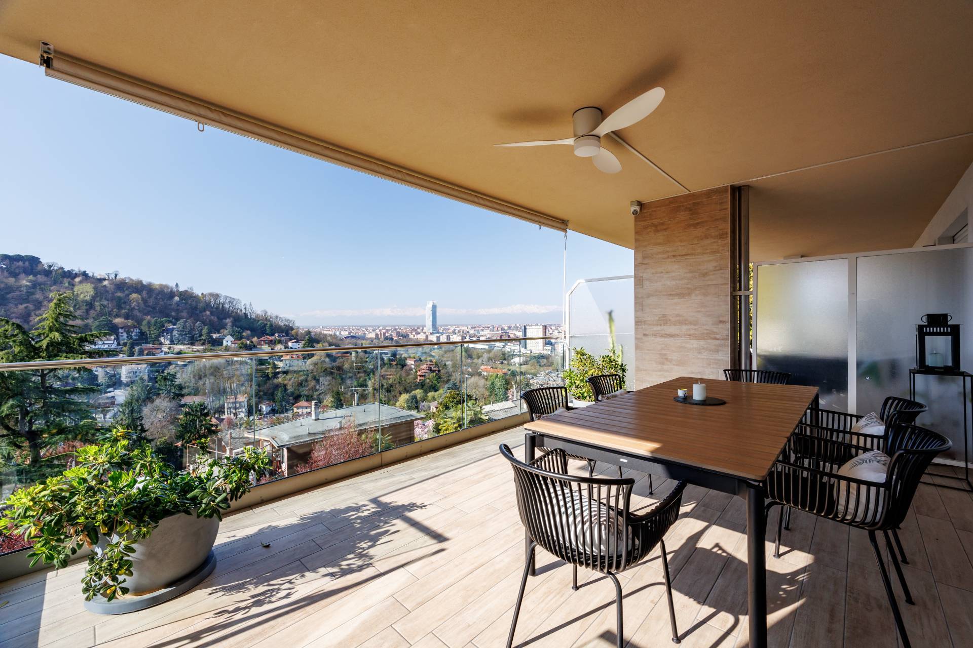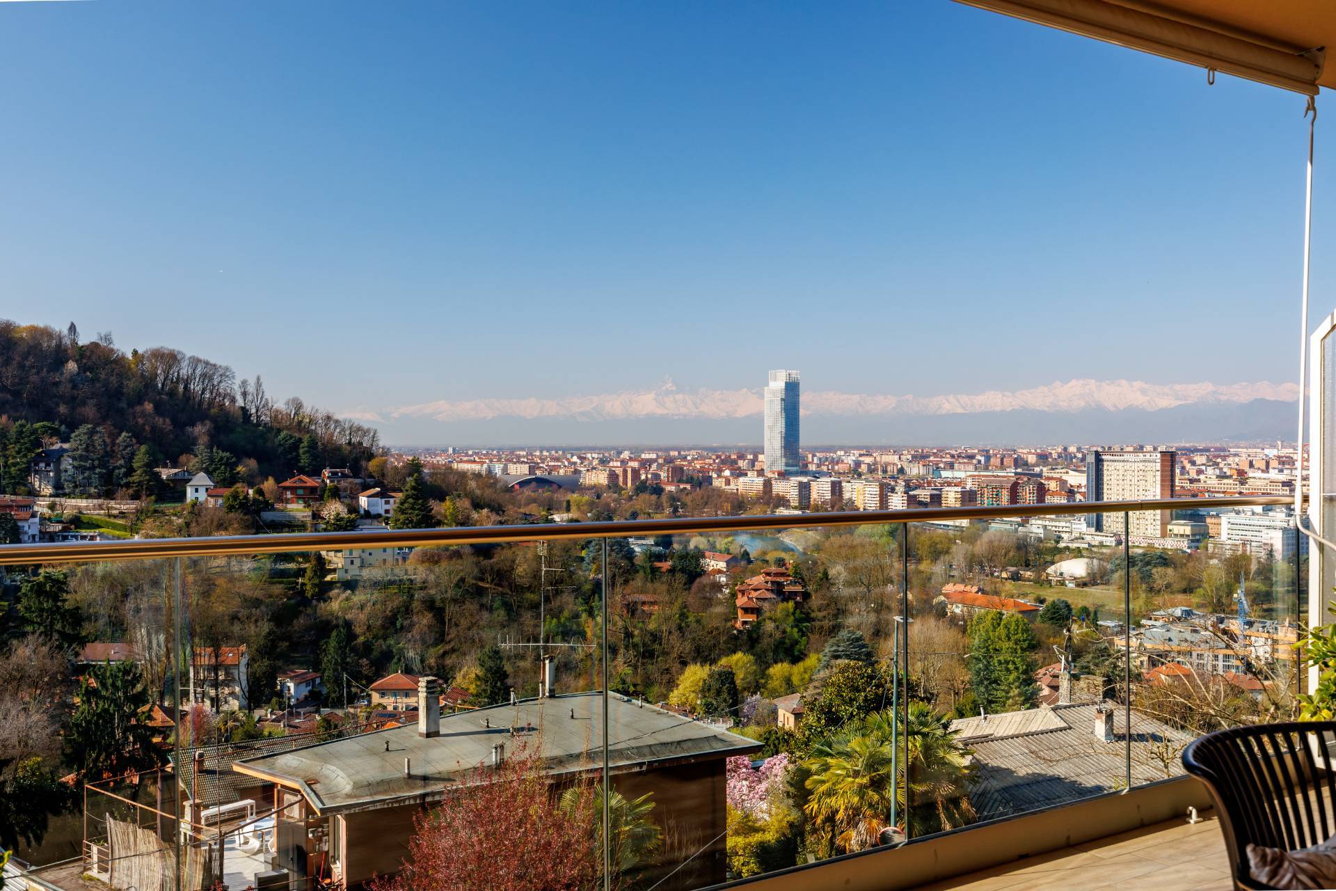 L'appartamento, luminoso e con finiture di pregio, cosi composto: ingresso su salone con cucina a vista e ampia vetrata su Torino con accesso al primo terrazzo panoramico, due camere da letto di cui una master-room con bagno en suite e accesso diretto al terrazzo con veranda bioclimatica in vetro apribile, ulteriore bagno ospiti, lavanderia e cantina.