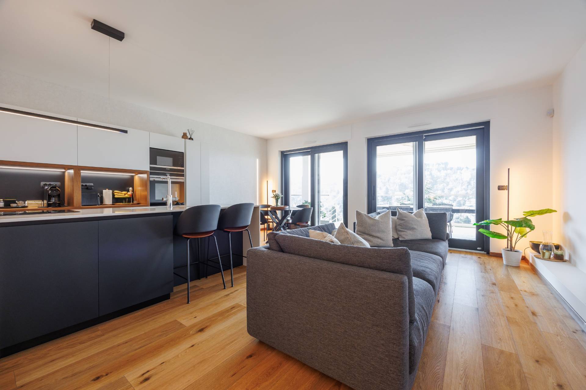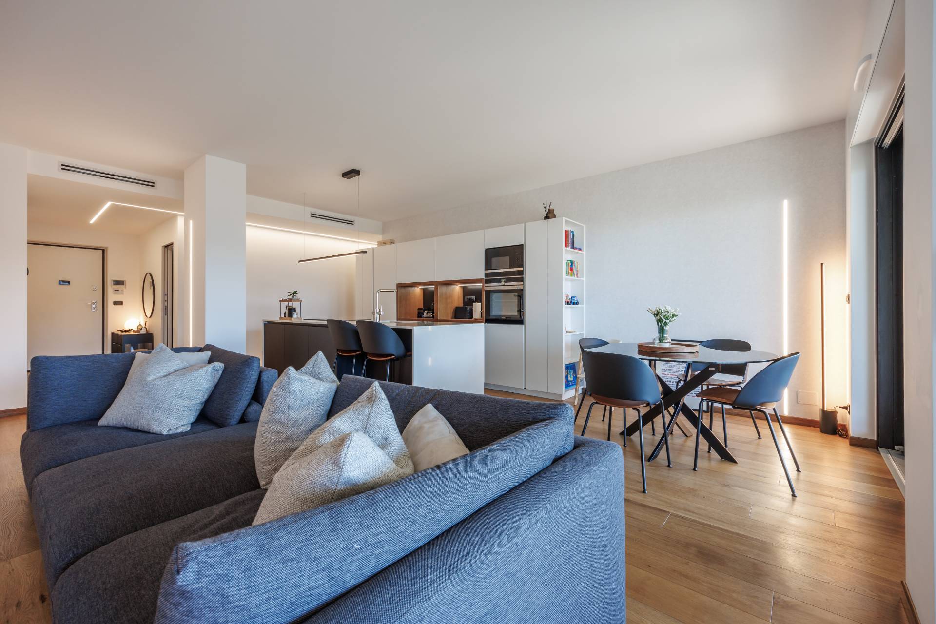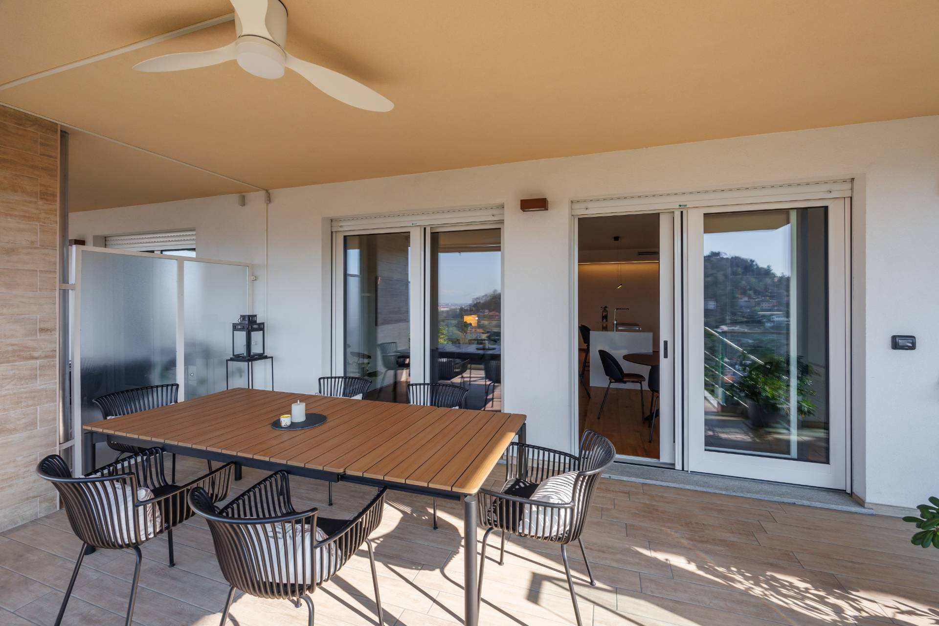 L'appartamento, luminoso e con finiture di pregio, cosi composto: ingresso su salone con cucina a vista e ampia vetrata su Torino con accesso al primo terrazzo panoramico, due camere da letto di cui una master-room con bagno en suite e accesso diretto al terrazzo con veranda bioclimatica in vetro apribile, ulteriore bagno ospiti, lavanderia e cantina.
