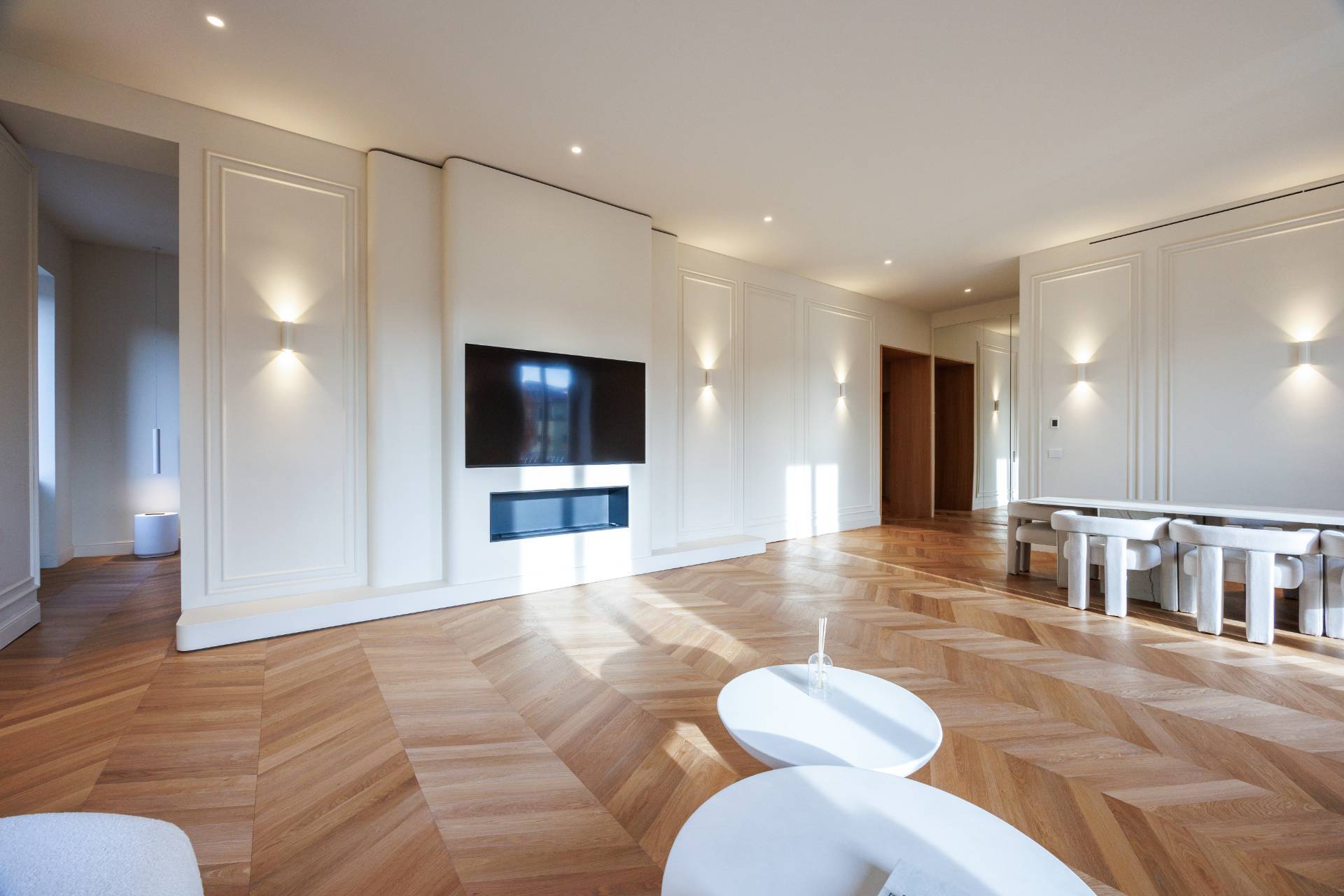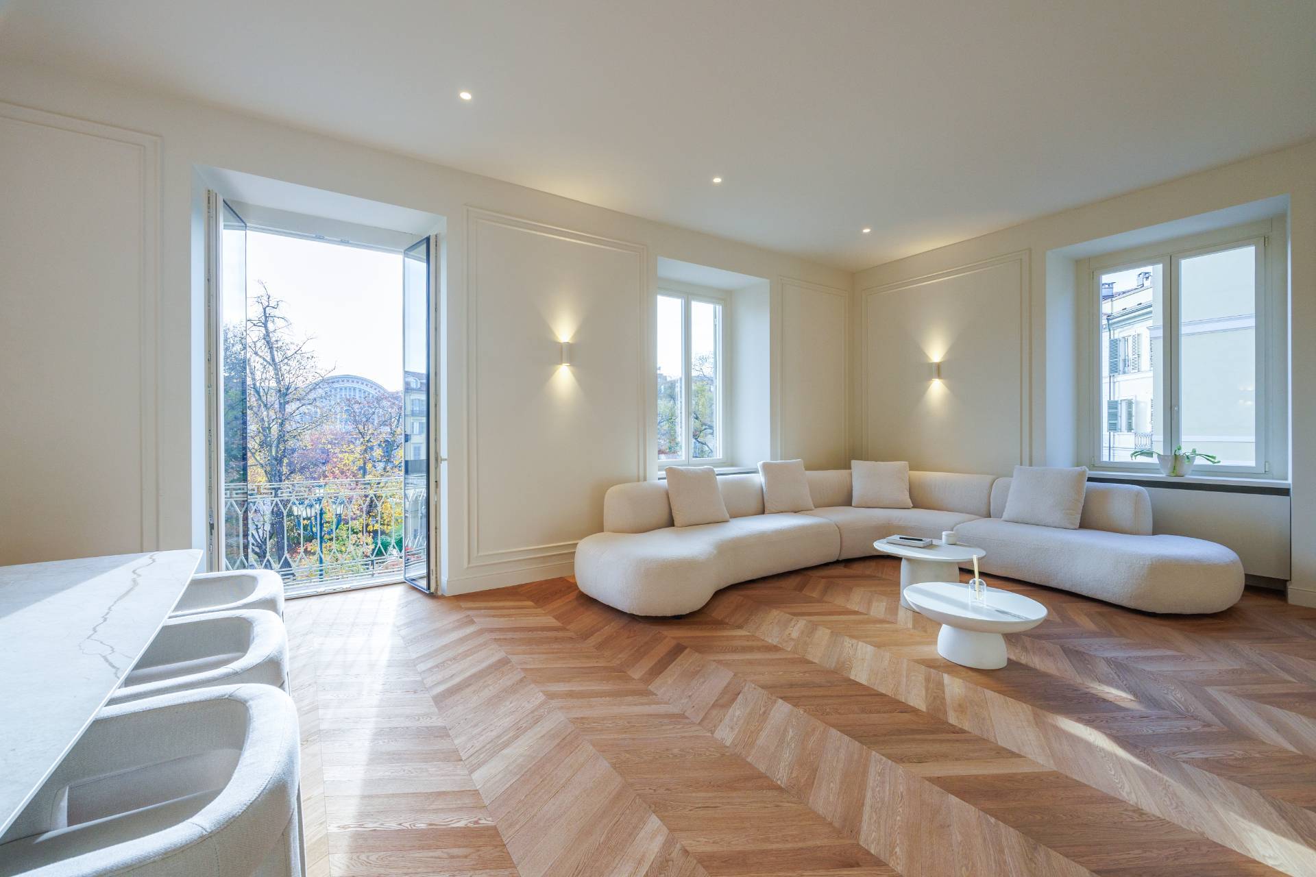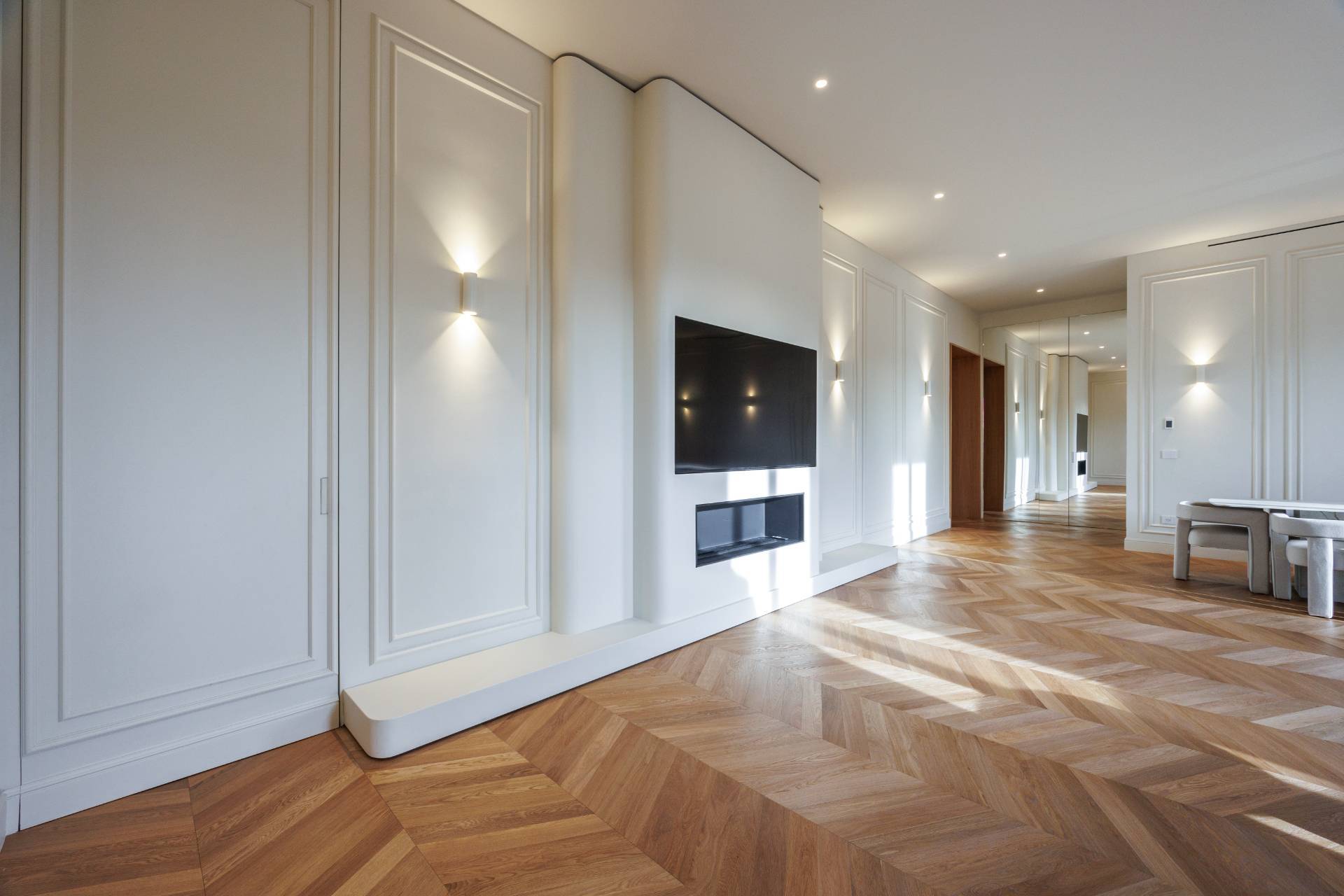 La propriet si distingue per un soggiorno doppio angolare di grande rappresentanza con balcone, caratterizzato da ampia luminosit naturale, parquet in rovere a spina ungherese di prima scelta, boiserie decorative e illuminazione architettonica studiata nei dettagli.