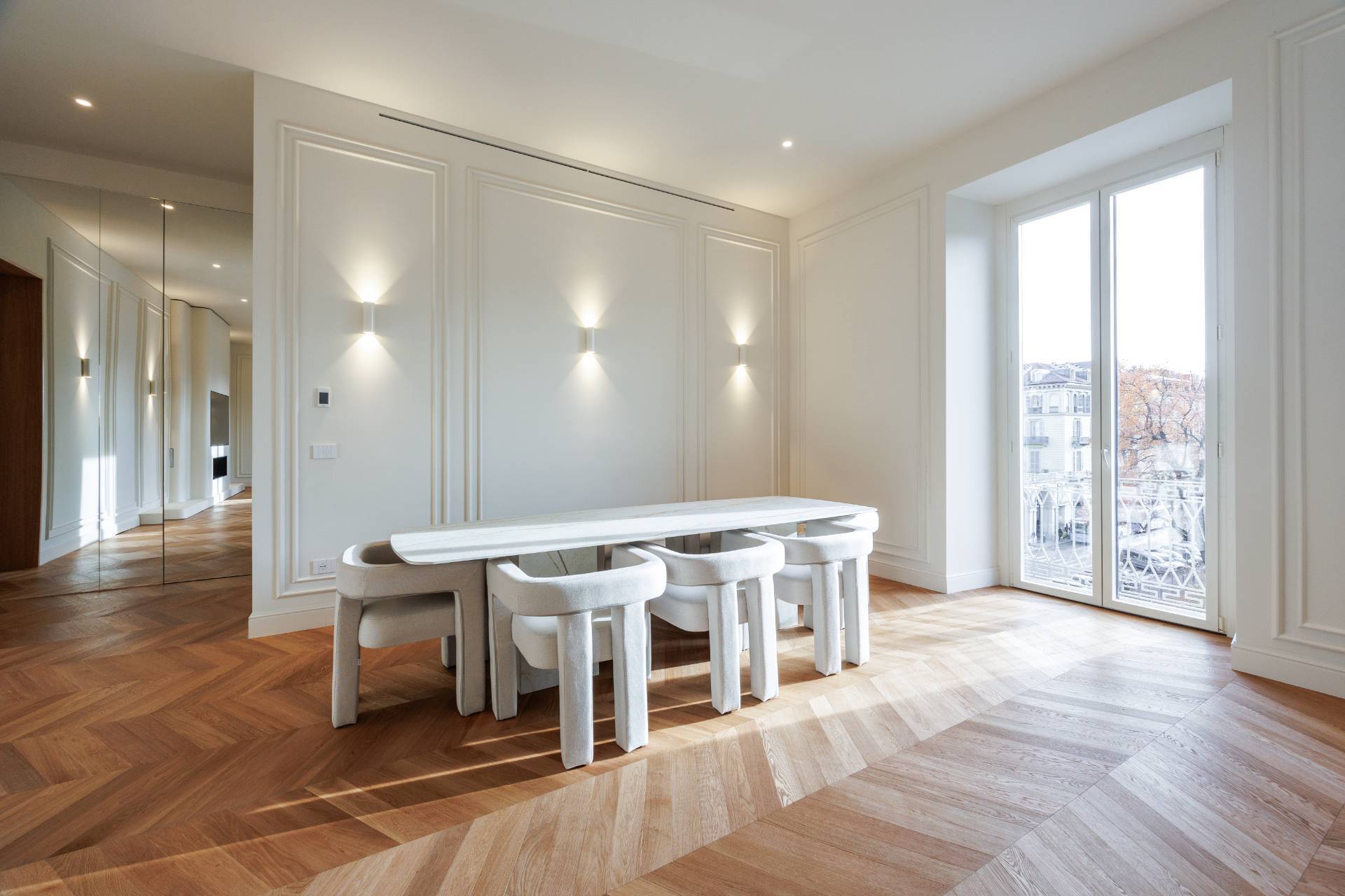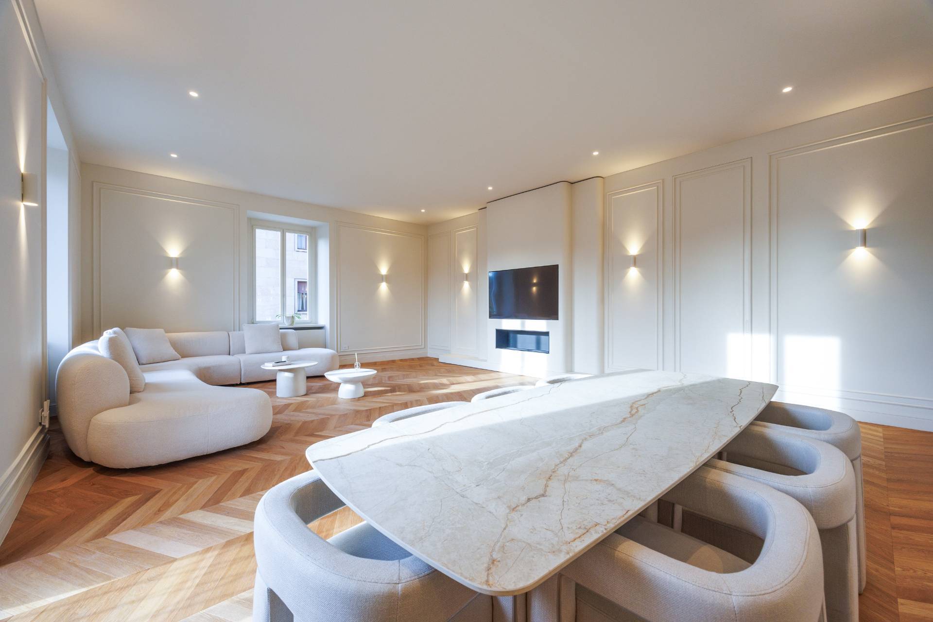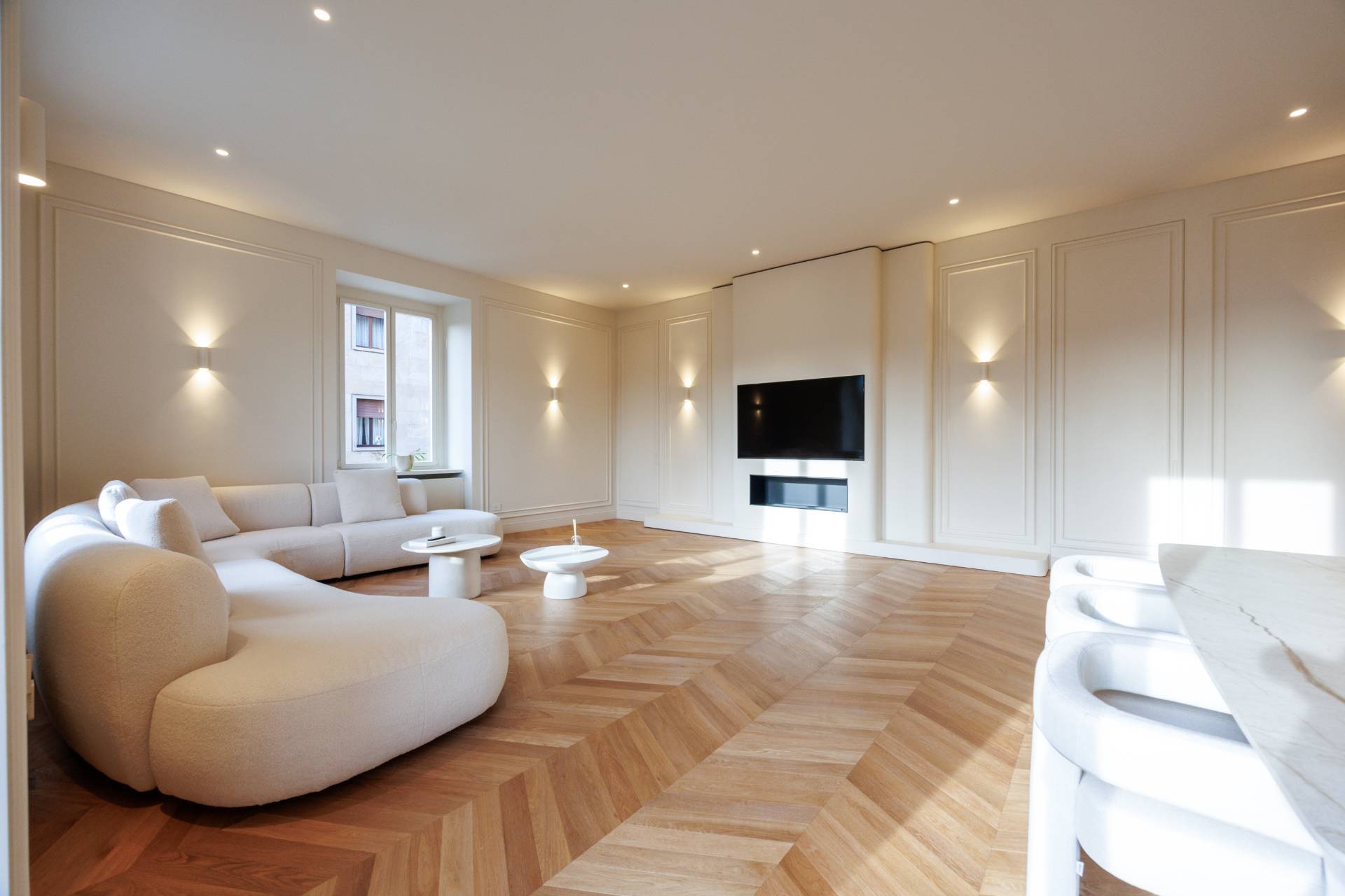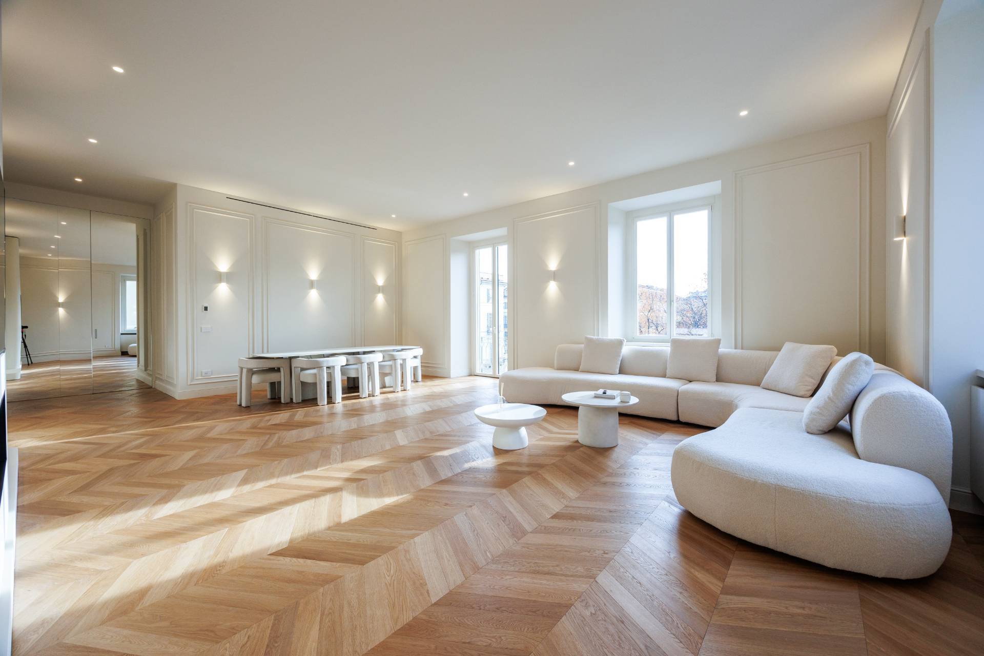 La propriet si distingue per un soggiorno doppio angolare di grande rappresentanza con balcone, caratterizzato da ampia luminosit naturale, parquet in rovere a spina ungherese di prima scelta, boiserie decorative e illuminazione architettonica studiata nei dettagli.