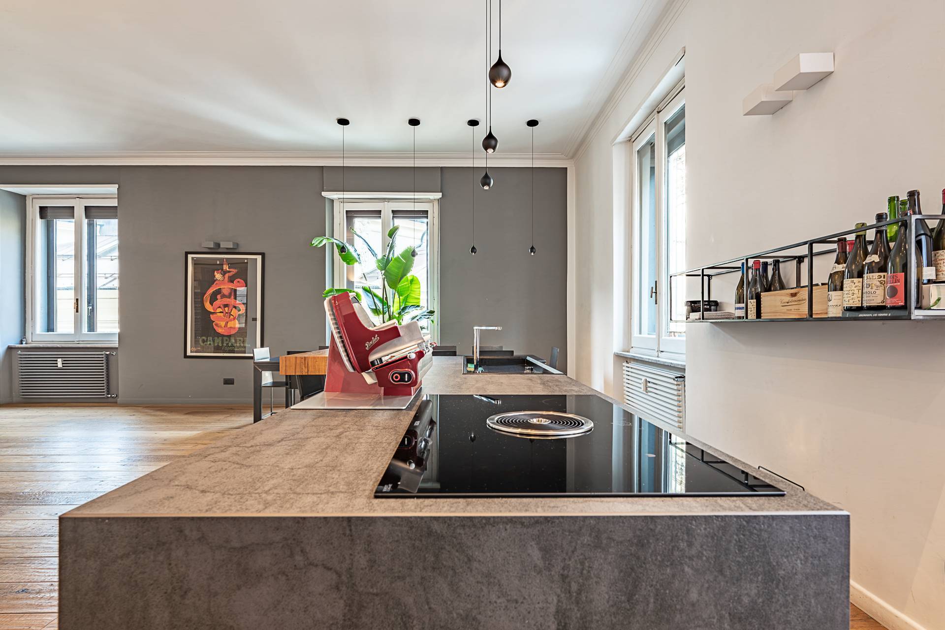 La cucina, moderna ed essenziale, organizzata con isola centrale e arredi su misura, perfettamente integrati nello spazio.