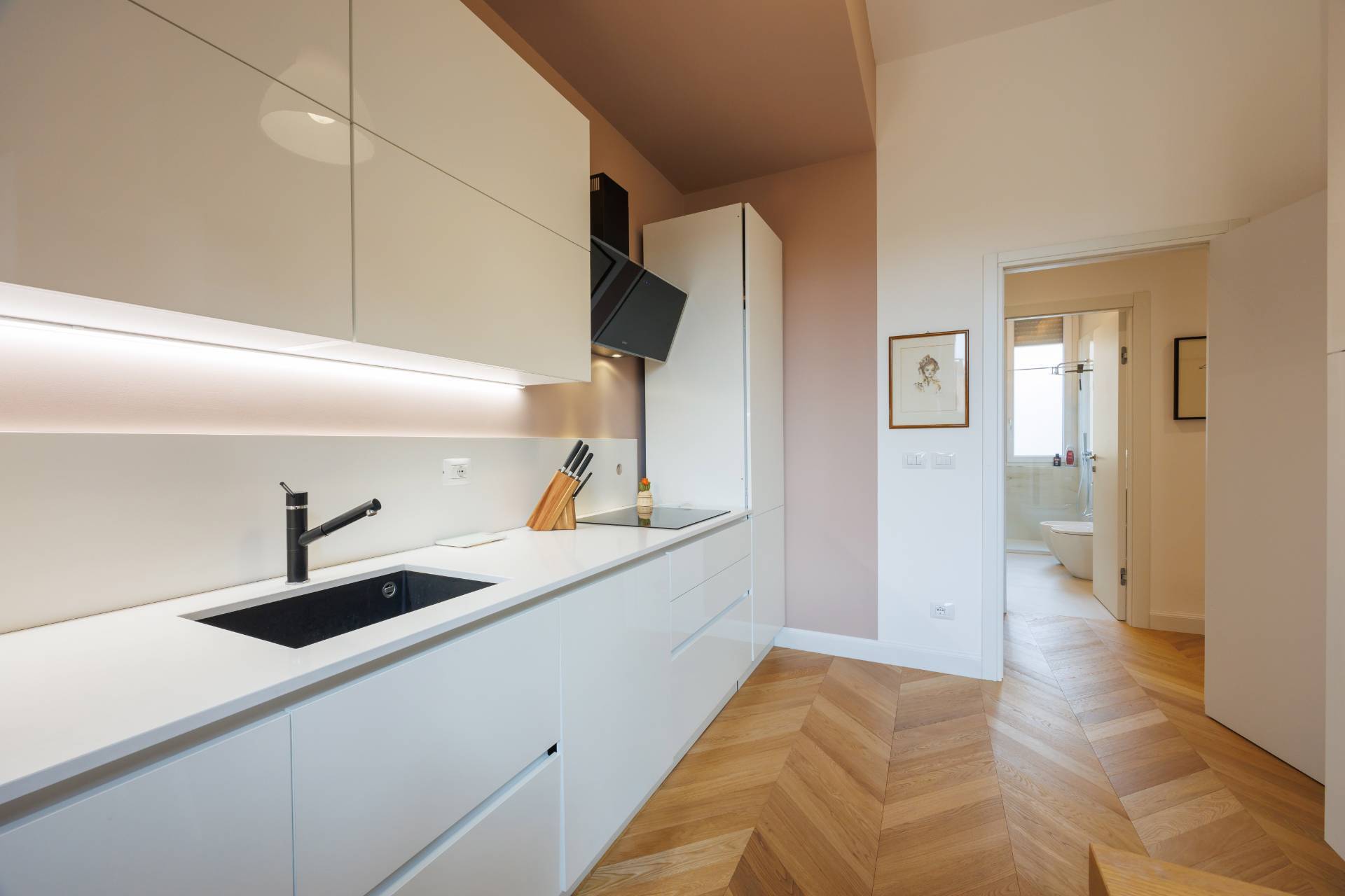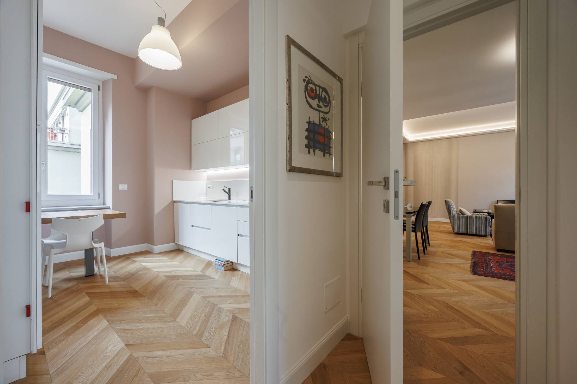 Lappartamento si distingue per la qualit della ristrutturazione, i colori ricercati delle pareti, lilluminazione studiata e lelegante parquet presente in tutti gli ambienti principali.