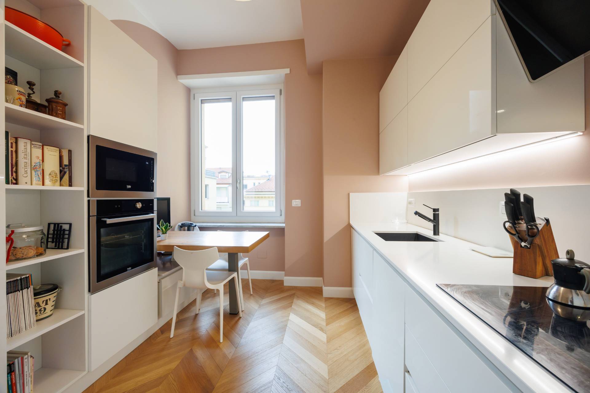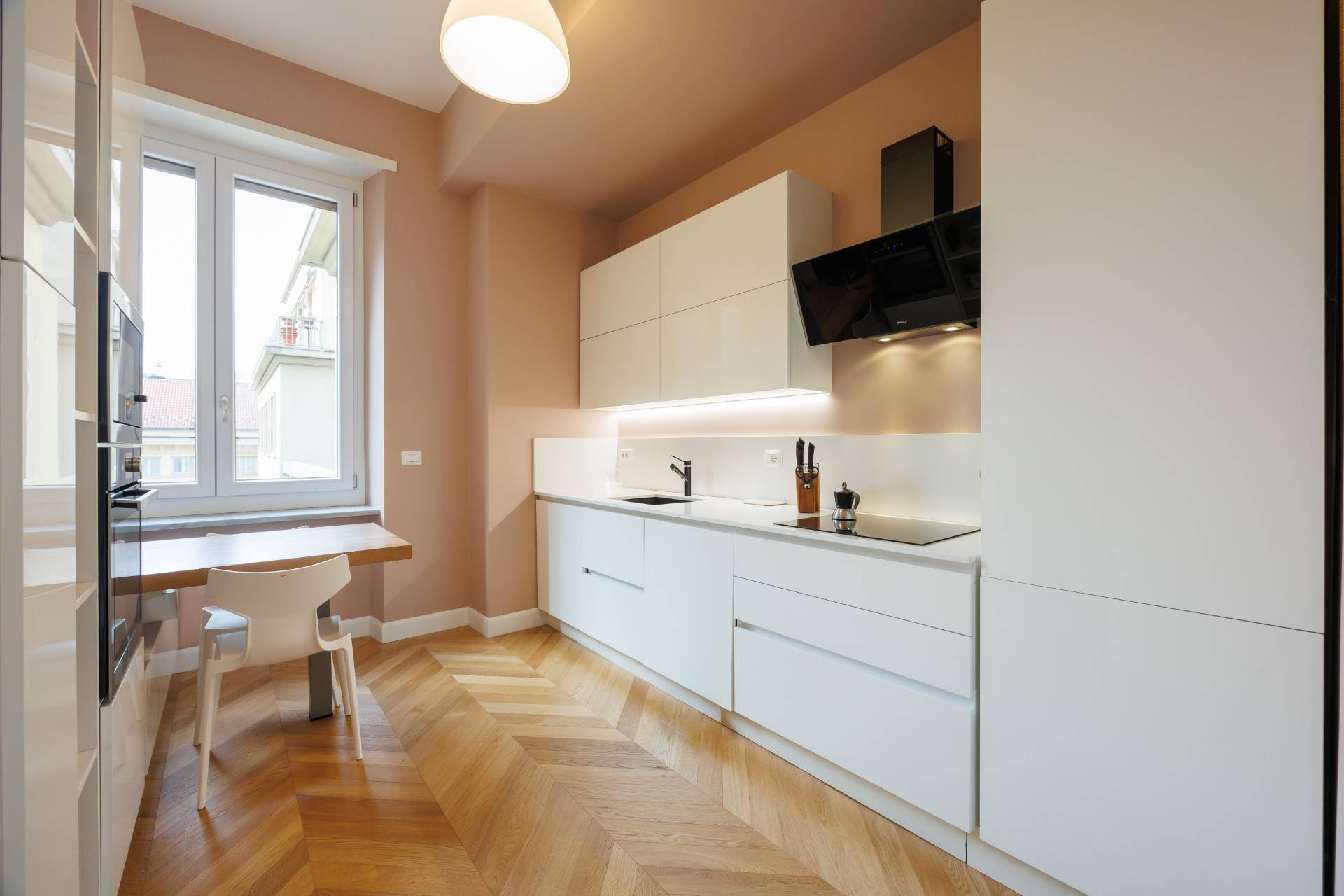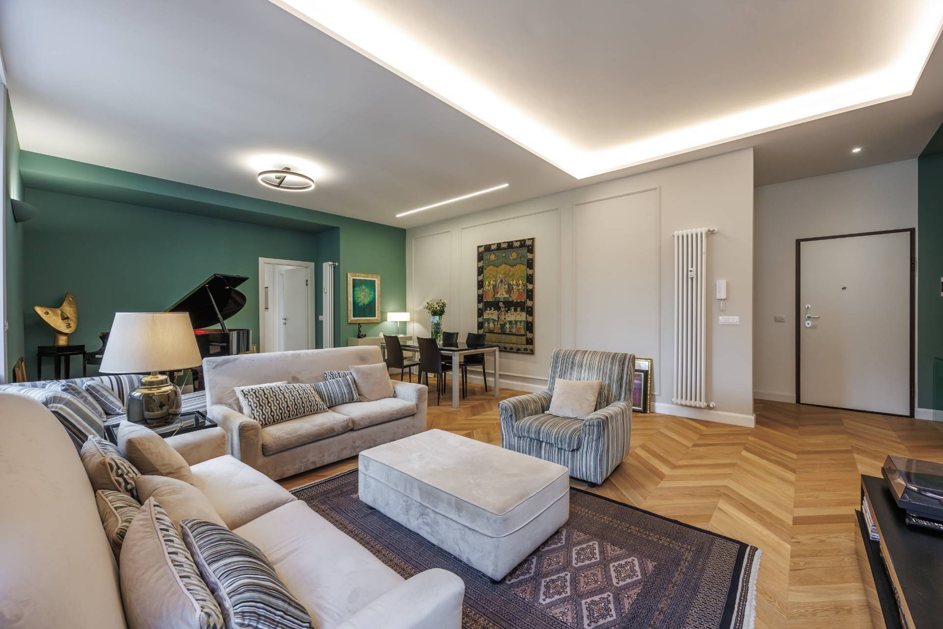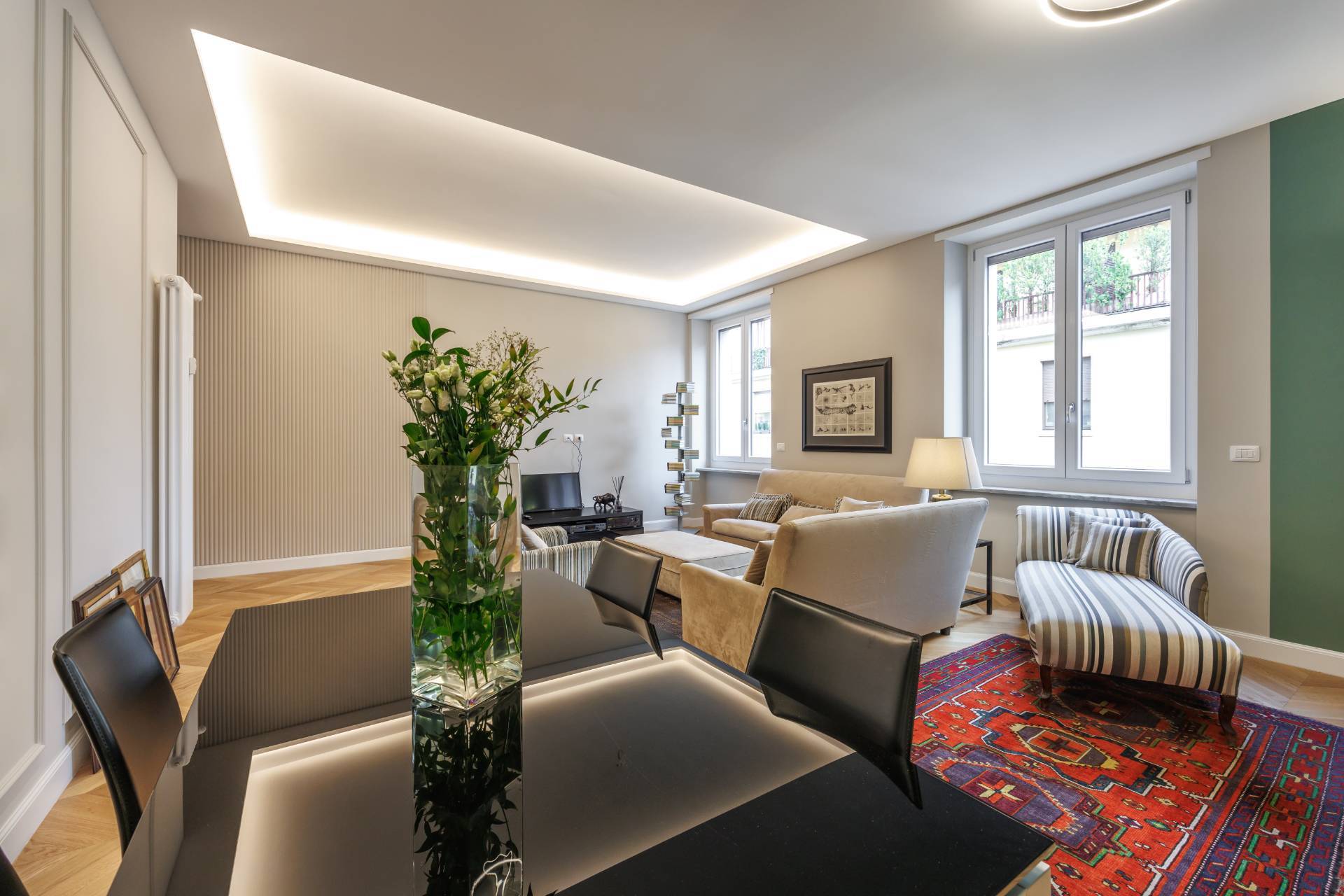 Lambiente, impreziosito da grandi finestre e da un caldo parquet posato a spina di pesce, offre spazi ideali per ricevere e vivere la casa con comfort ed eleganza.