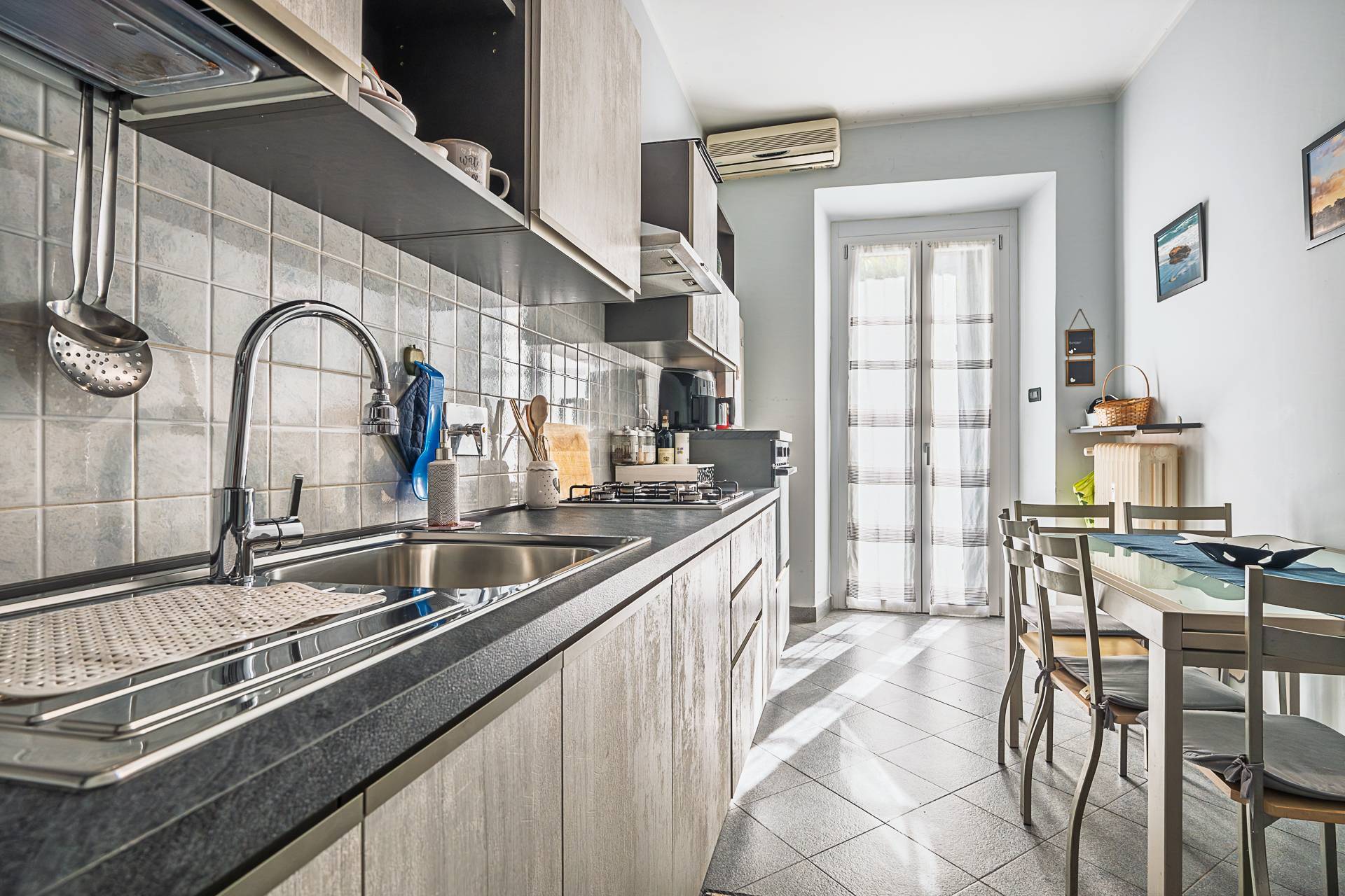 C' l'impianto di aria condizionata (uno split in soggiorno Mitsubishi Climaveneta). Gli infissi hanno il doppio vetro (gas argon) antieffrazione ed isolante (termico e acustico). La cucina Arredia.