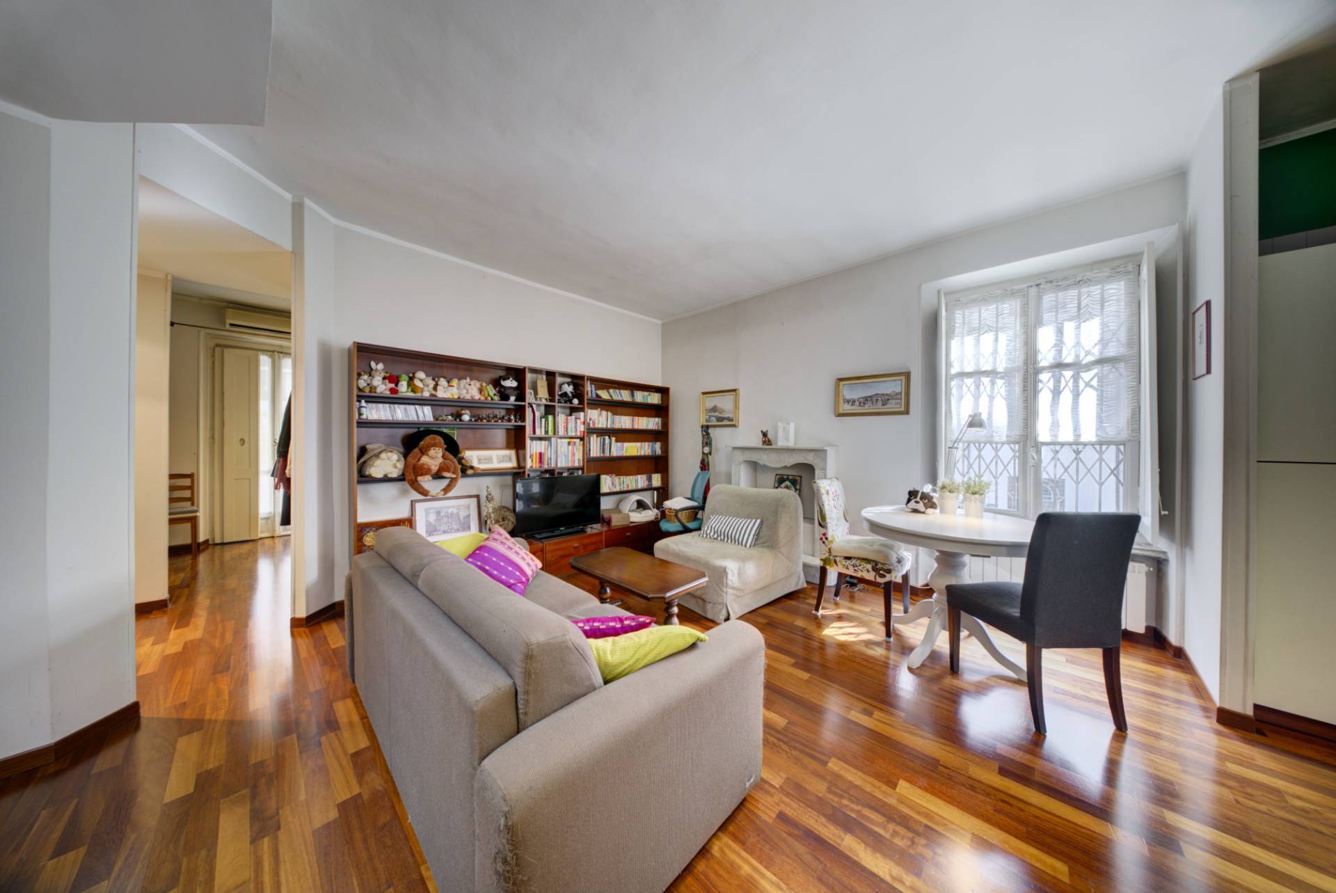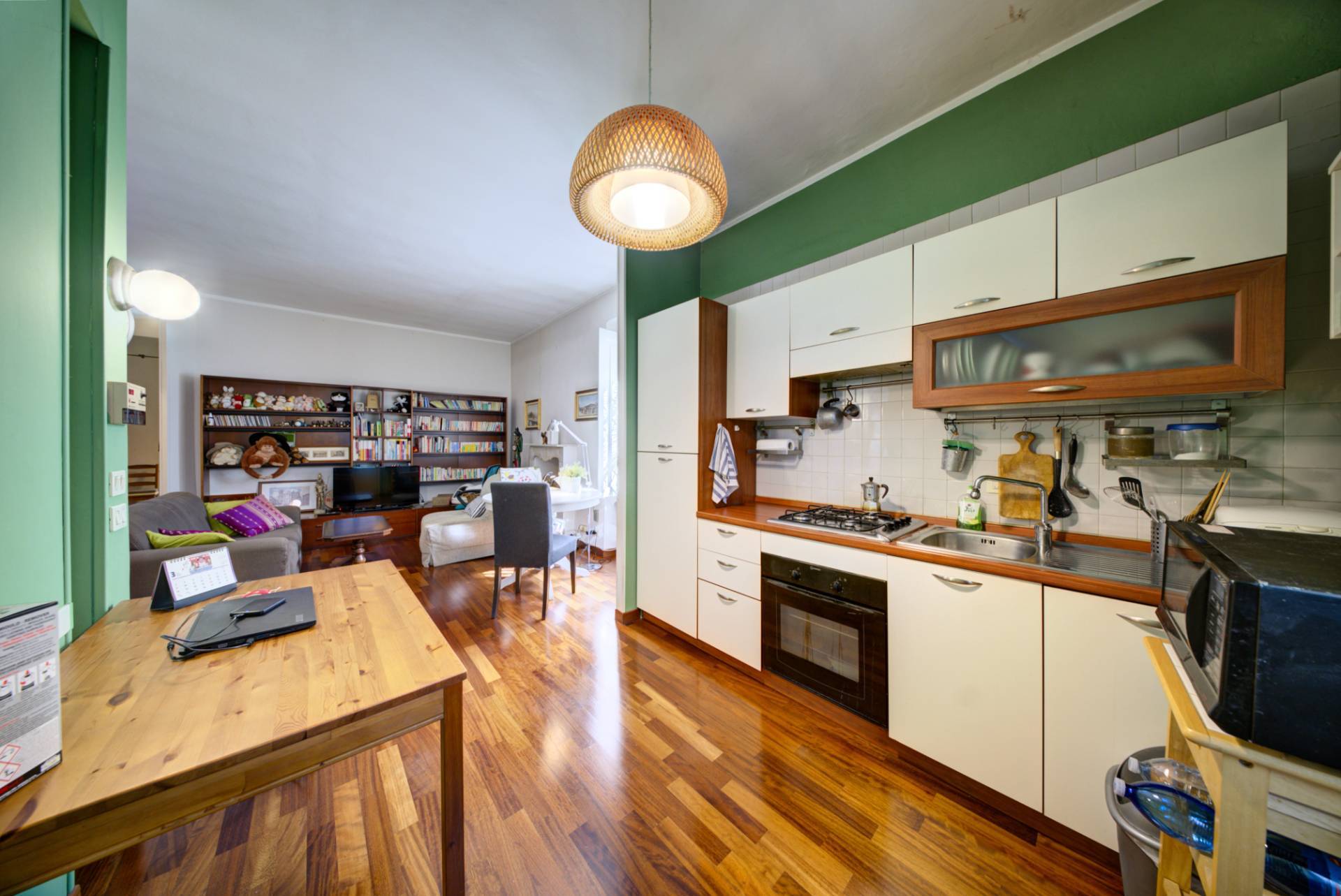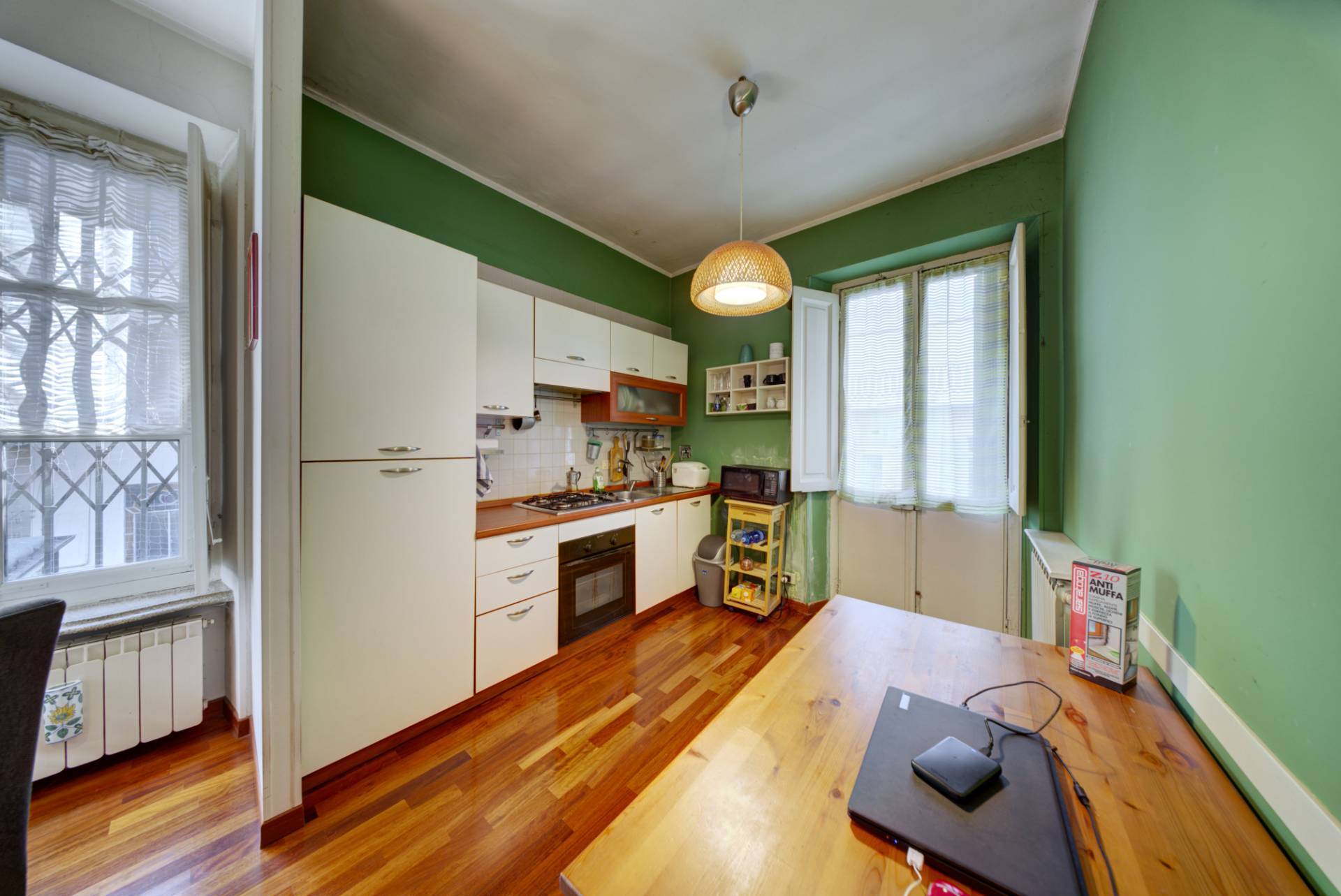 Limmobile composto da ingresso living su ampia sala con camino in marmo, cucina abitabile, una camera da letto, angolo scrivania, bagno, ripostiglio e due balconi, di cui uno con l'affaccio sull'interno cortile e l'altro su via Piffetti.