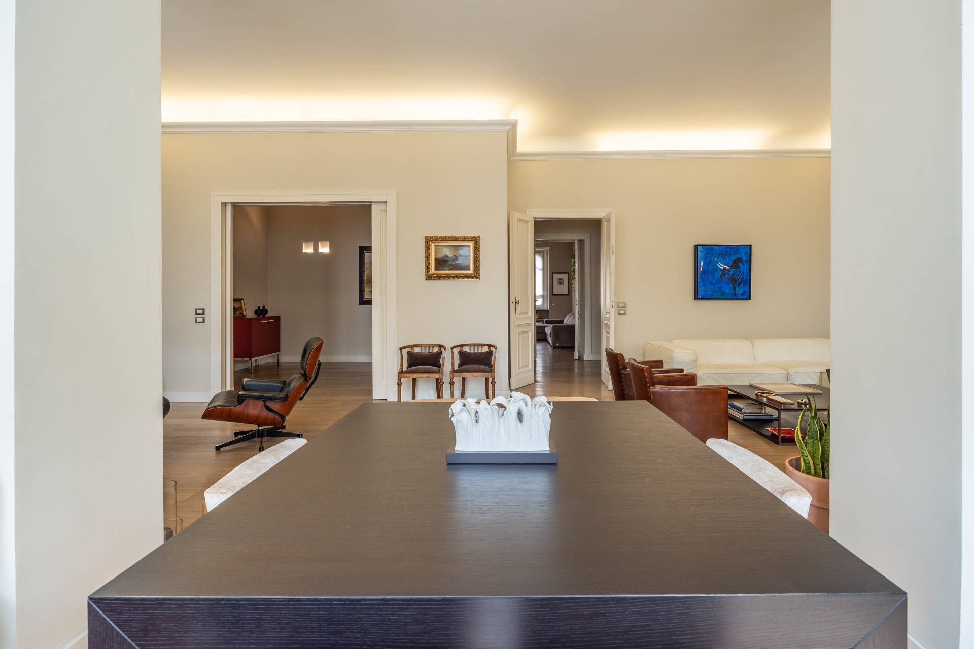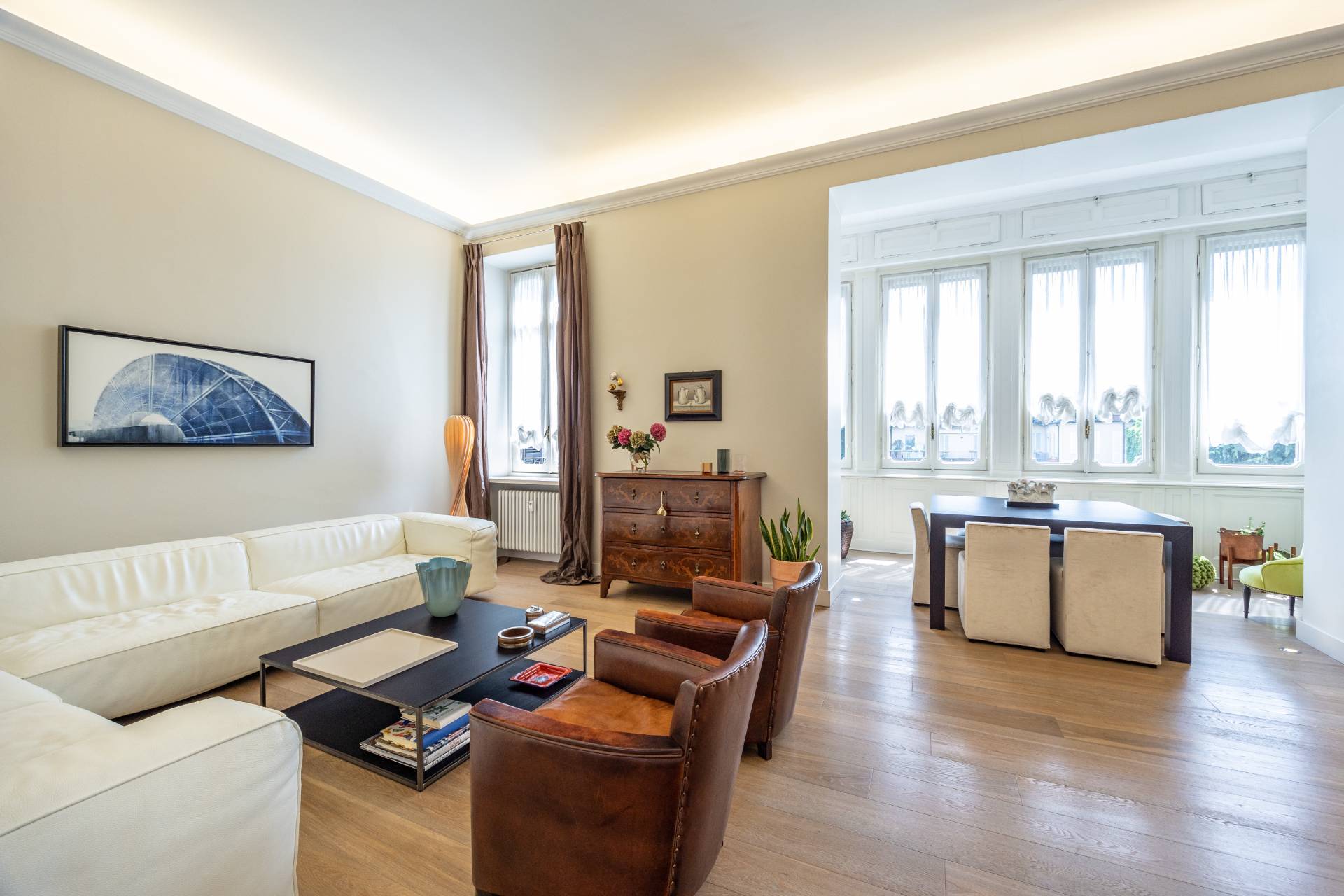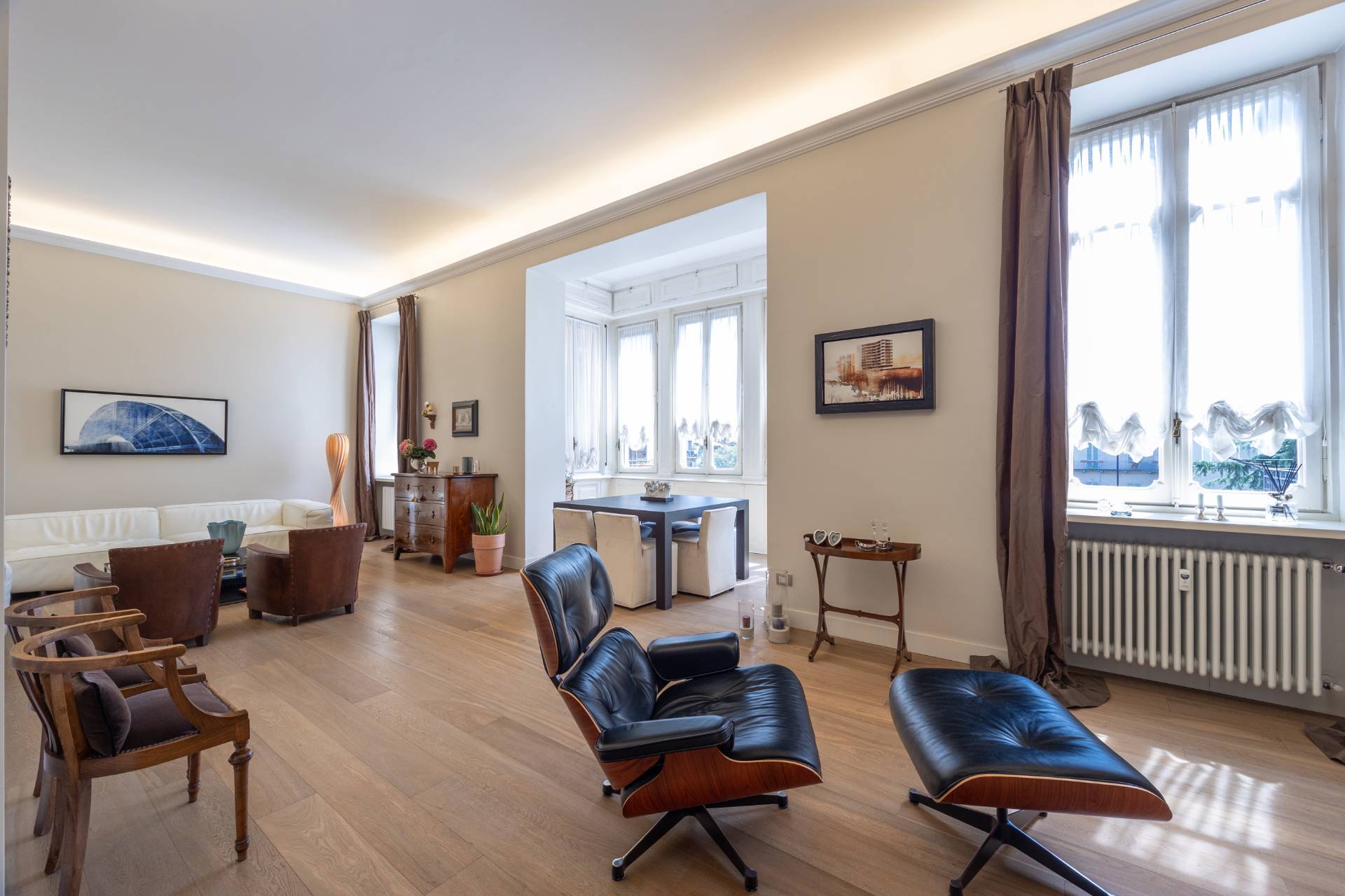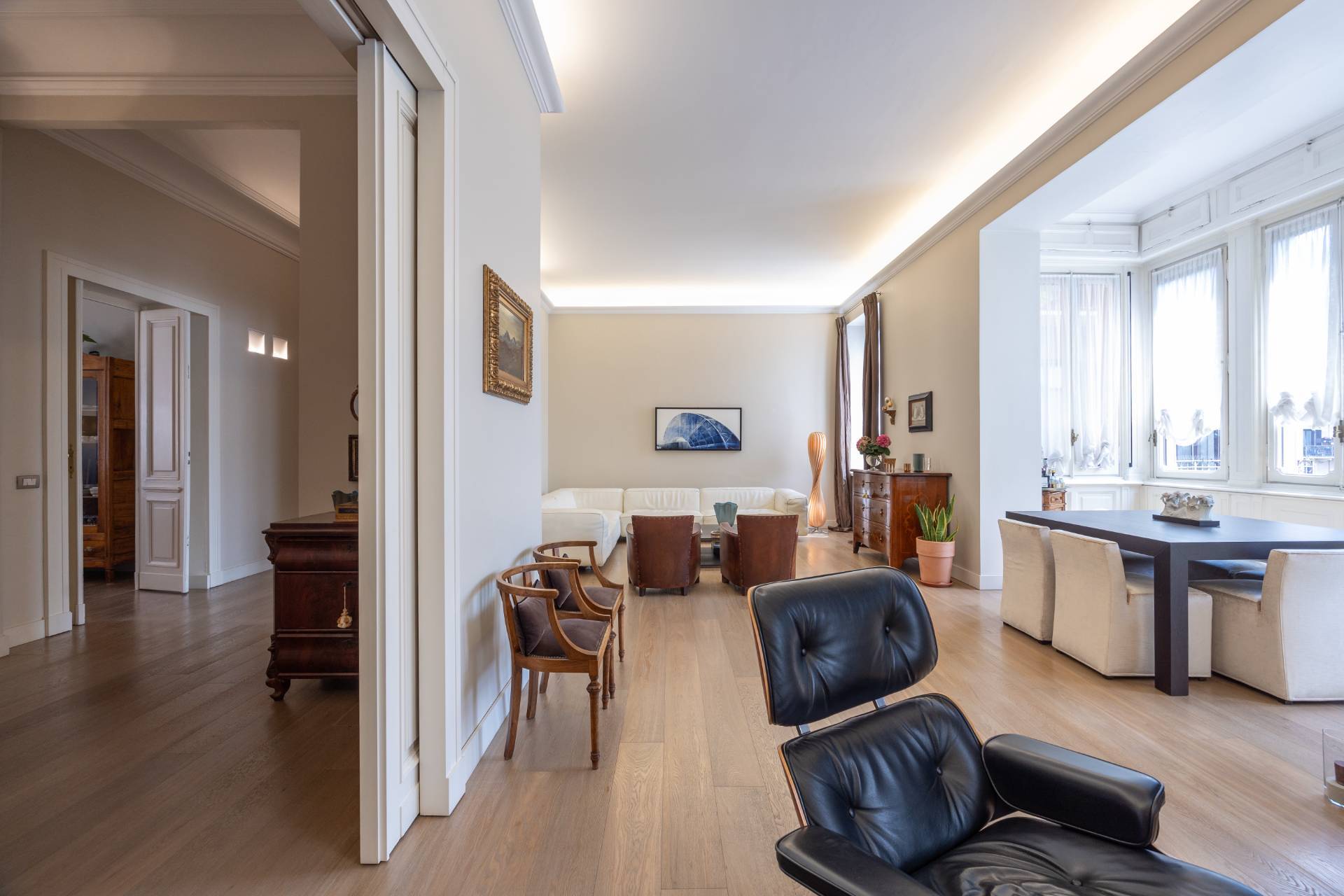 In splendido stabile d'epoca, in Via Lamarmora, nel tratto compreso tra Via Valeggio e Via Governolo, esclusivo appartamento al terzo piano con ascensore completamente ristrutturato composto da ingresso, luminosissimo salone doppio con bow window, cucina abitabile con isola e zona pranzo, tre camere molto ampie di cui una attualmente adibita a studio, una doppia con zona notte, cabina armadio e bagno privato e suite matrimoniale con bow window e vasca di design a vista, zona armadi, cabina armadio e bagno privato, terzo bagno ospiti tre bagni, lavanderia e ripostiglio e appendiabiti.