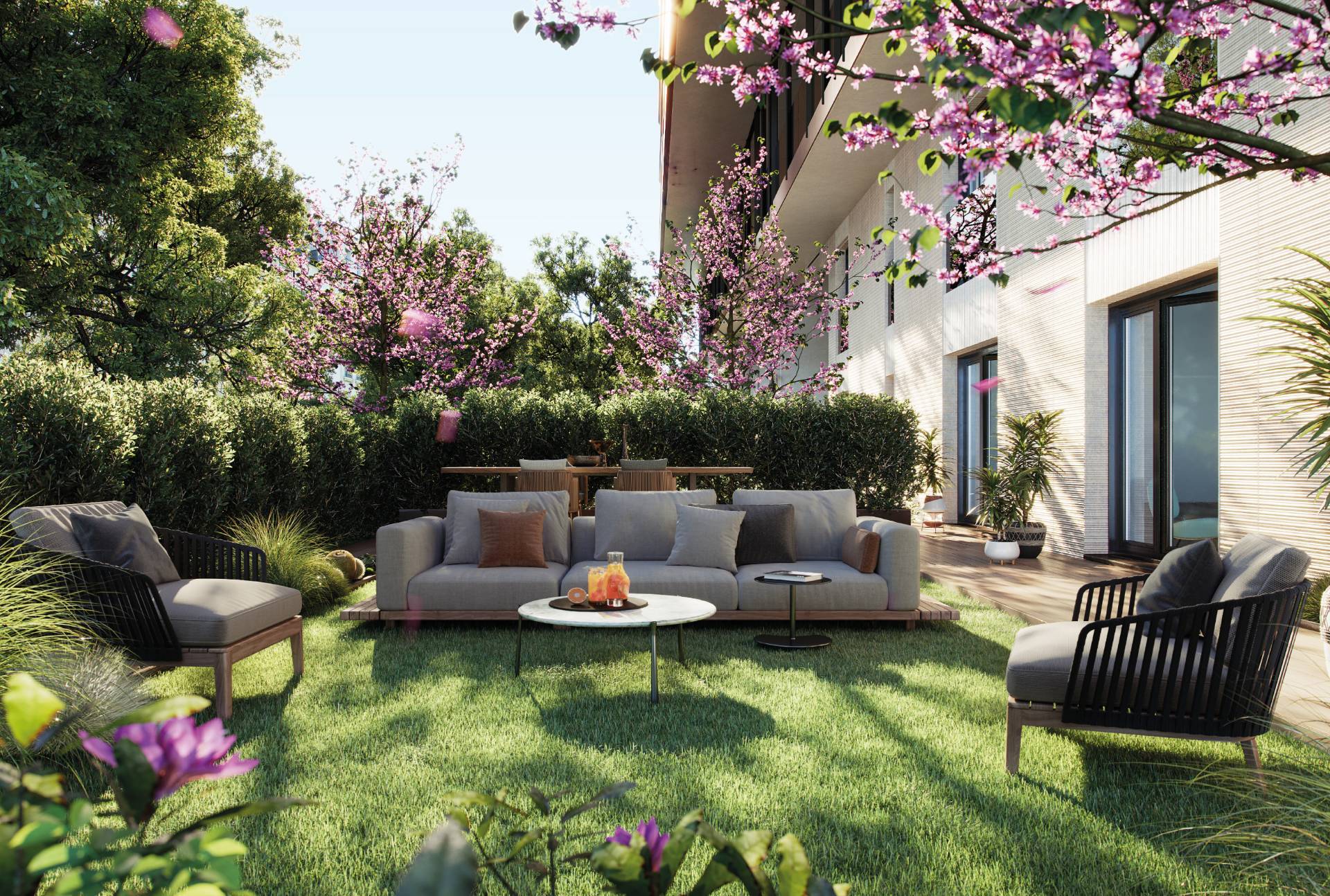 L'unit situata al piano terra con ampio giardino privato di 106 mq. Il progetto prevede la suddivisione in ingresso su disimpegno, ampia zona giorno con cucina a vista, una camera da letto matrimoniale con bagno privato, secondo bagno di servizio.