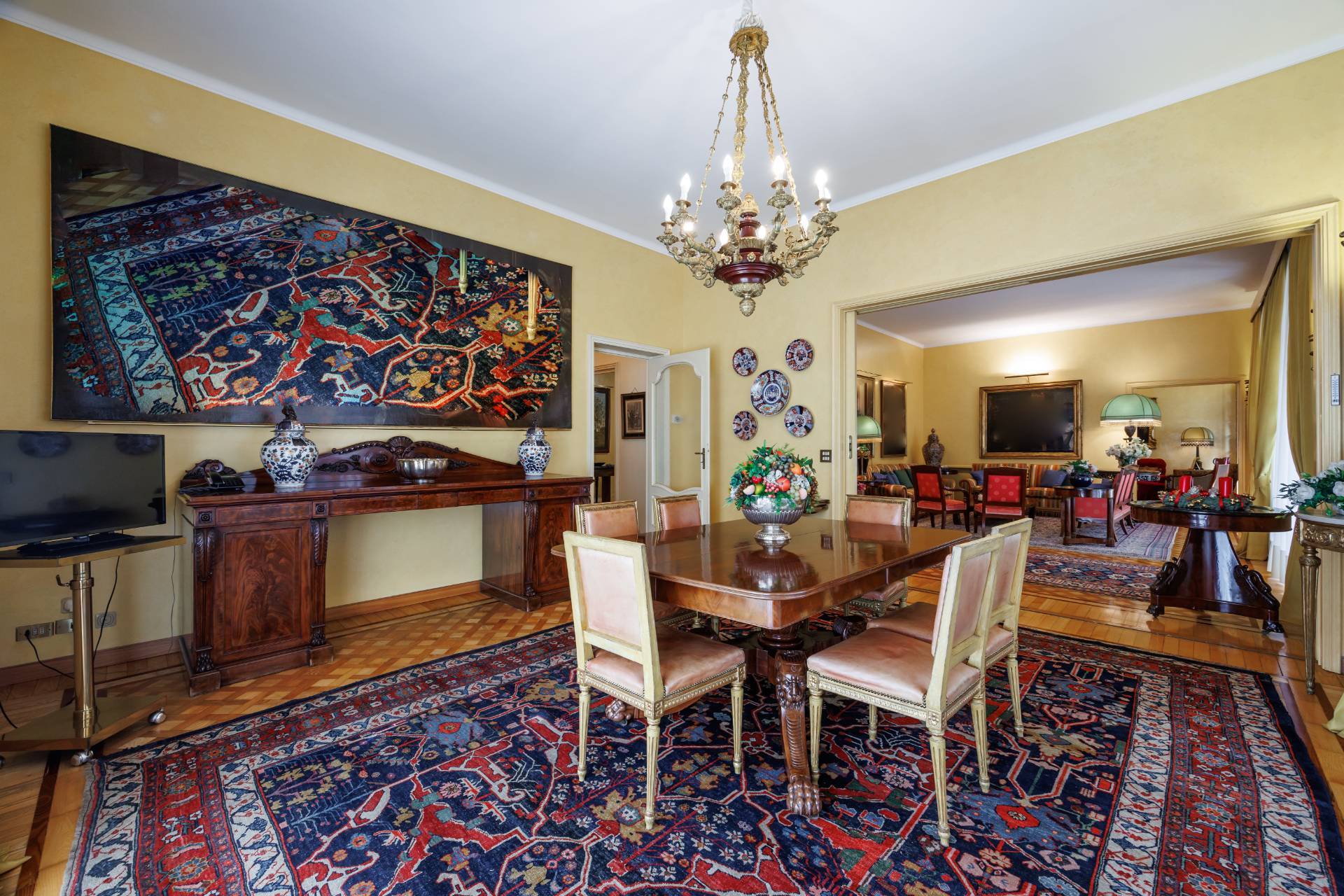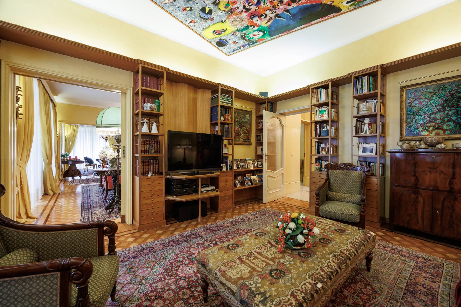 L'immobile, di ampia metratura, si divide in due grandi zone; a destra dell'ingresso ci si immerge in una prestigiosa zona giorno rappresentata da doppio salone con sala da pranzo che affaccia su via Cantore tramite un fruibile terrazzo, una prima camera con bagno privato all'interno, un bagno di servizio, cucina abitabile con un piccolo terrazzo sull'interno cortile ed infine un corridoio dotato di armadiatura che collega la seconda zona dell'appartamento.