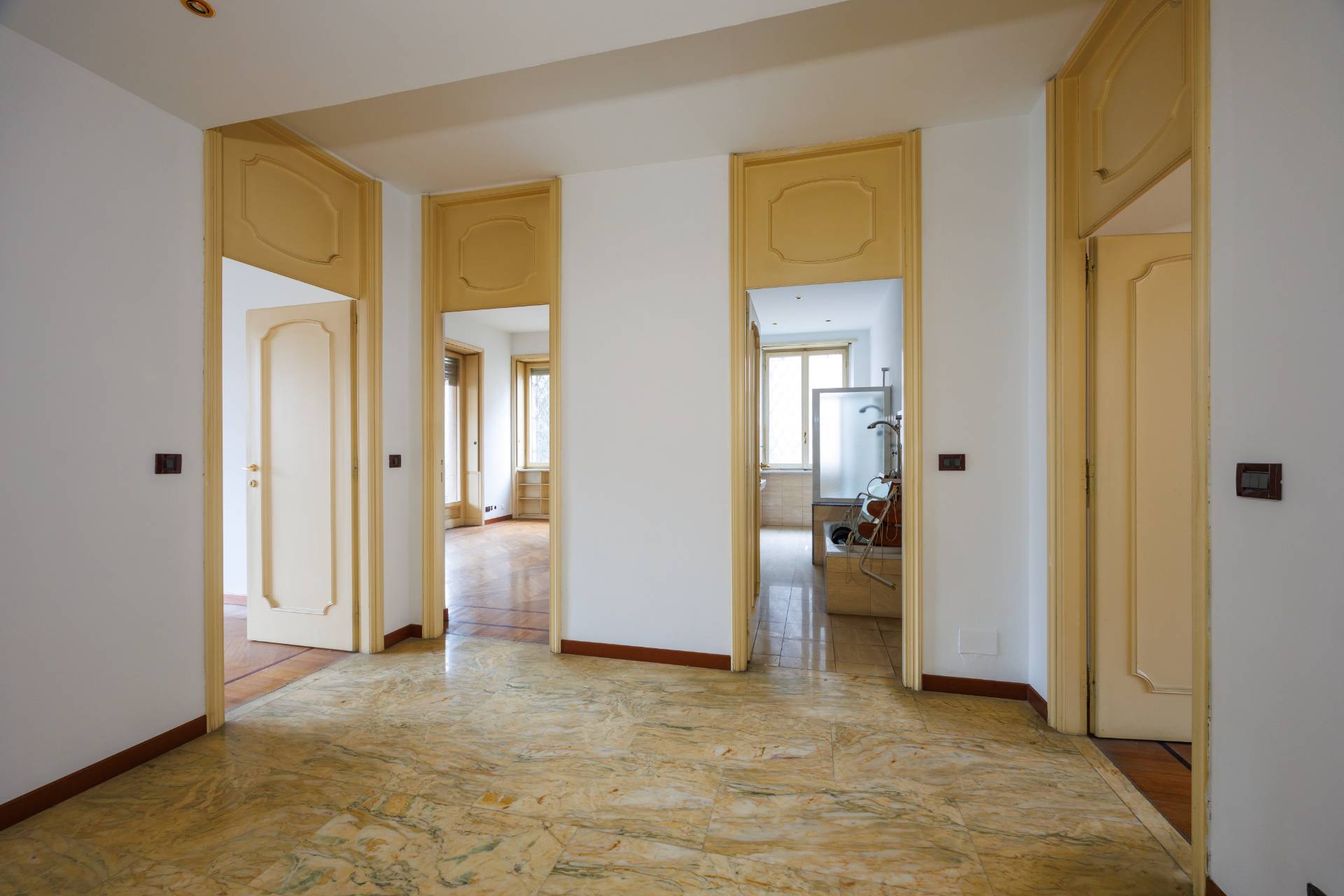 L'ingresso principale da porta blindata imponente, con androne con boiserie e ulteriore porta di servizio dalle scale.