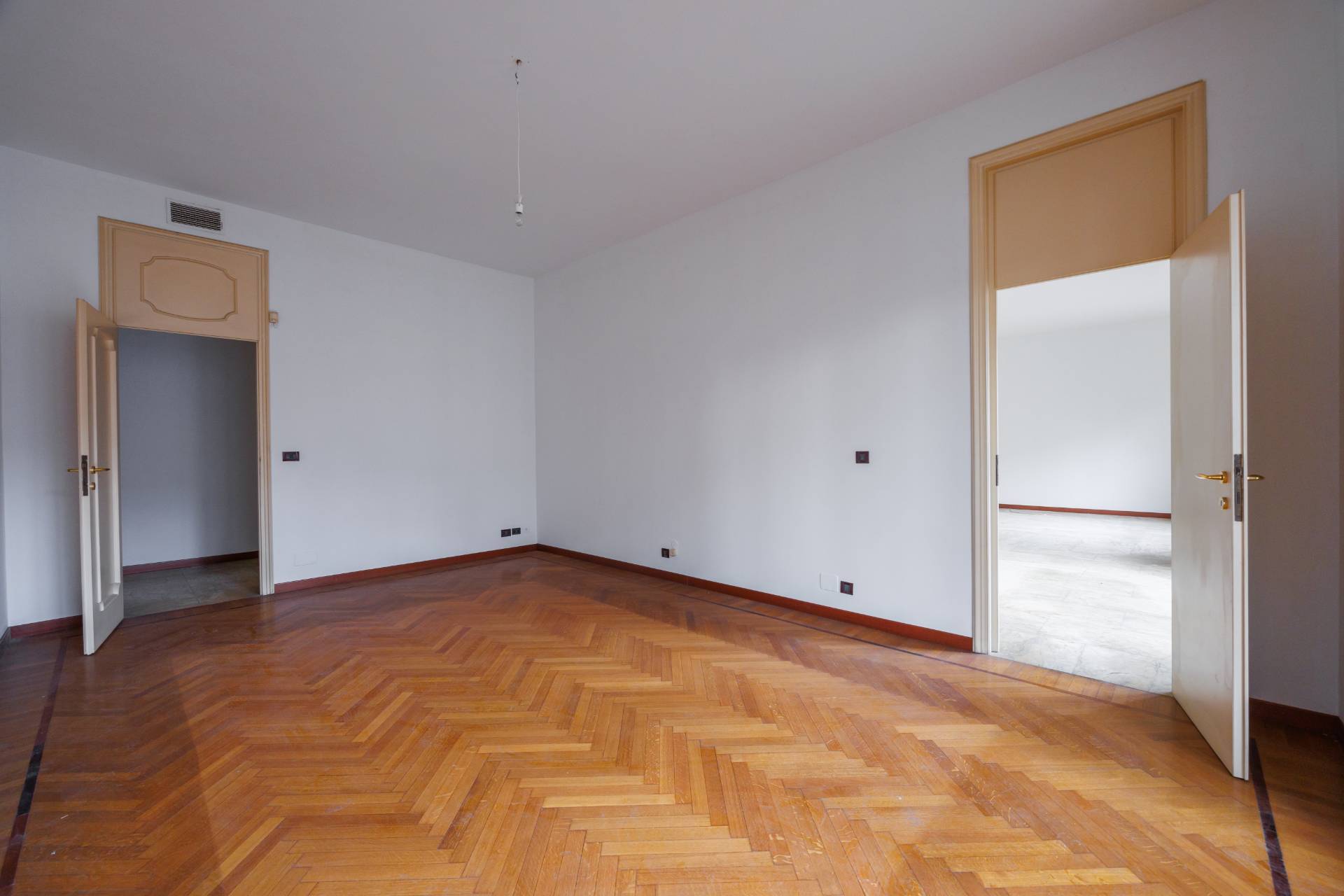 L'appartamento attualmente diviso in una zona di lavoro con cucina abitabile, ampia dispensa, camera e bagno di servizio, e una zona di rappresentanza con doppio salone e ripostigli.