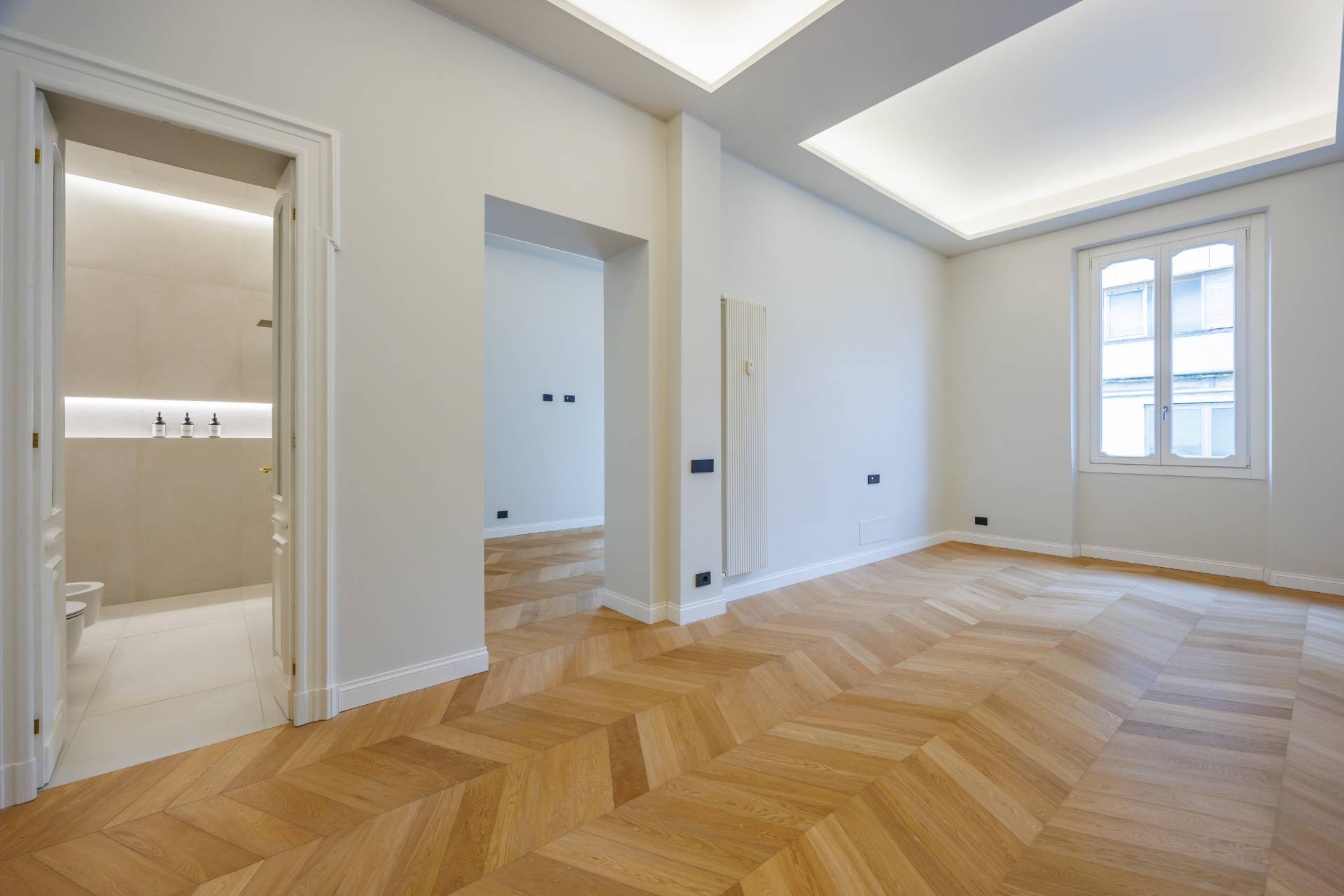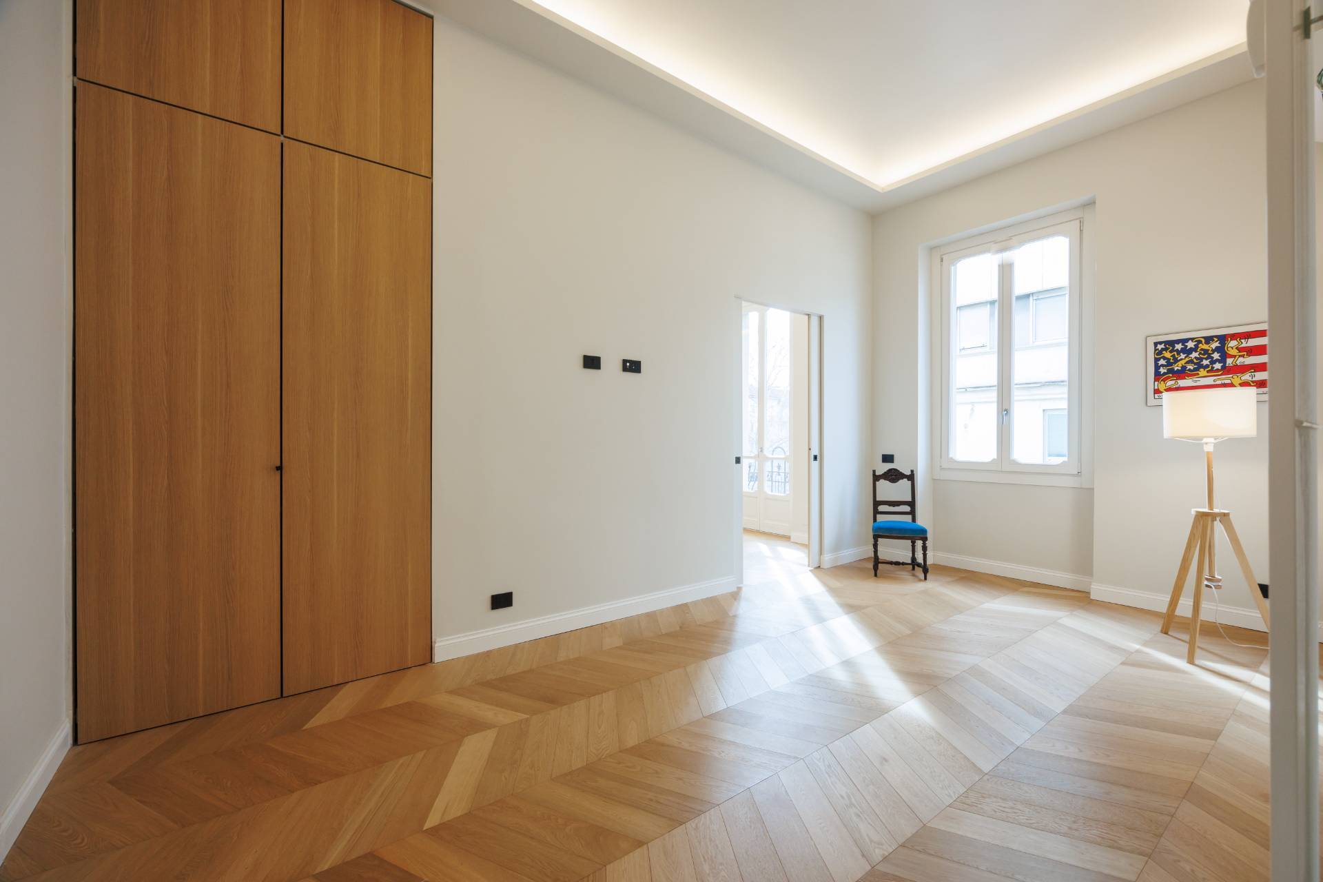 Il parquet in legno posato a spina di pesce dona calore e raffinatezza agli ambienti, mentre i controsoffitti con illuminazione a LED integrata creano unatmosfera elegante e moderna.
