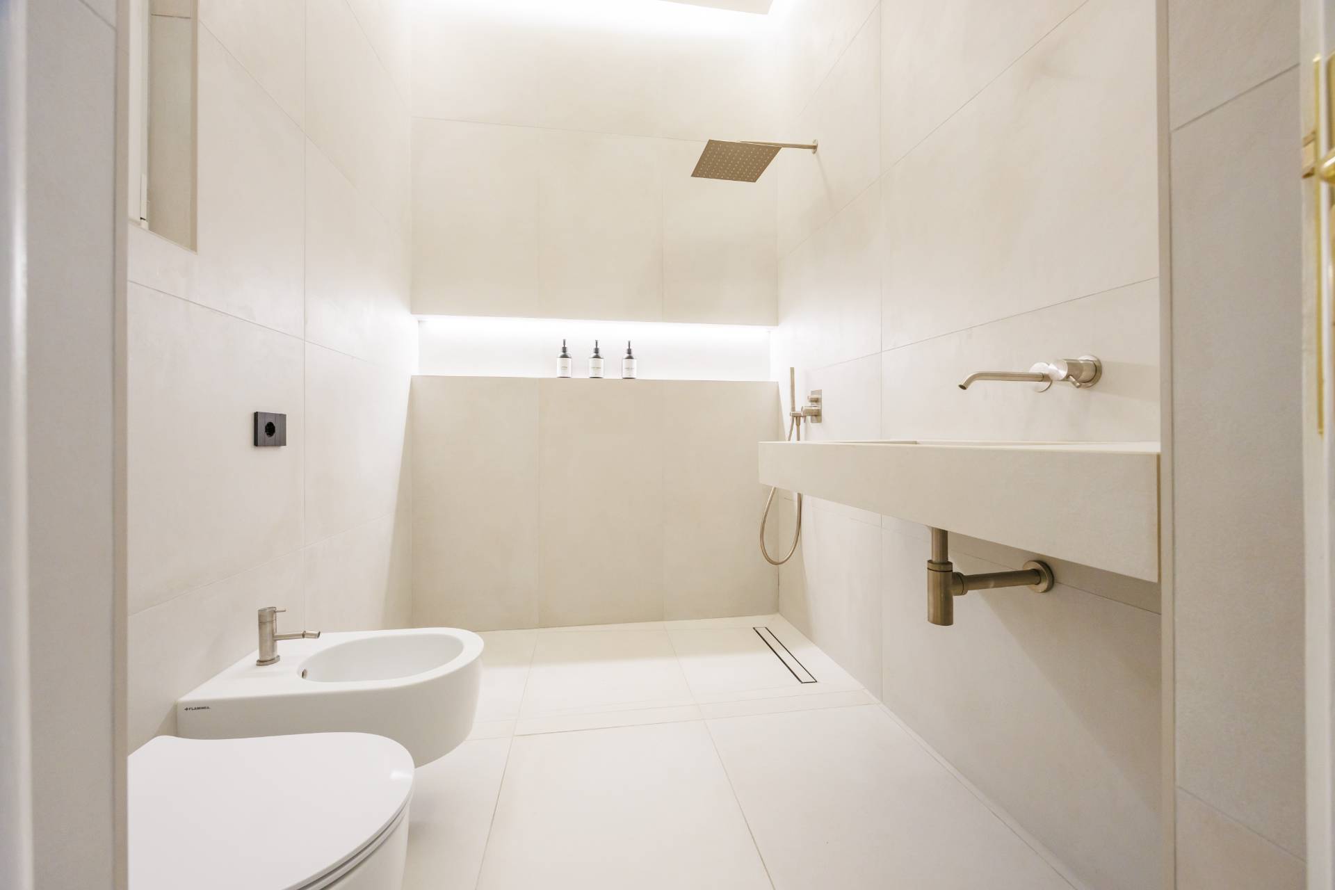 Il bagno, rifinito in tonalit chiare e materiali di pregio, presenta un design essenziale e moderno: ampia doccia walk-in, sanitari dalle linee pulite e lavabo sospeso.