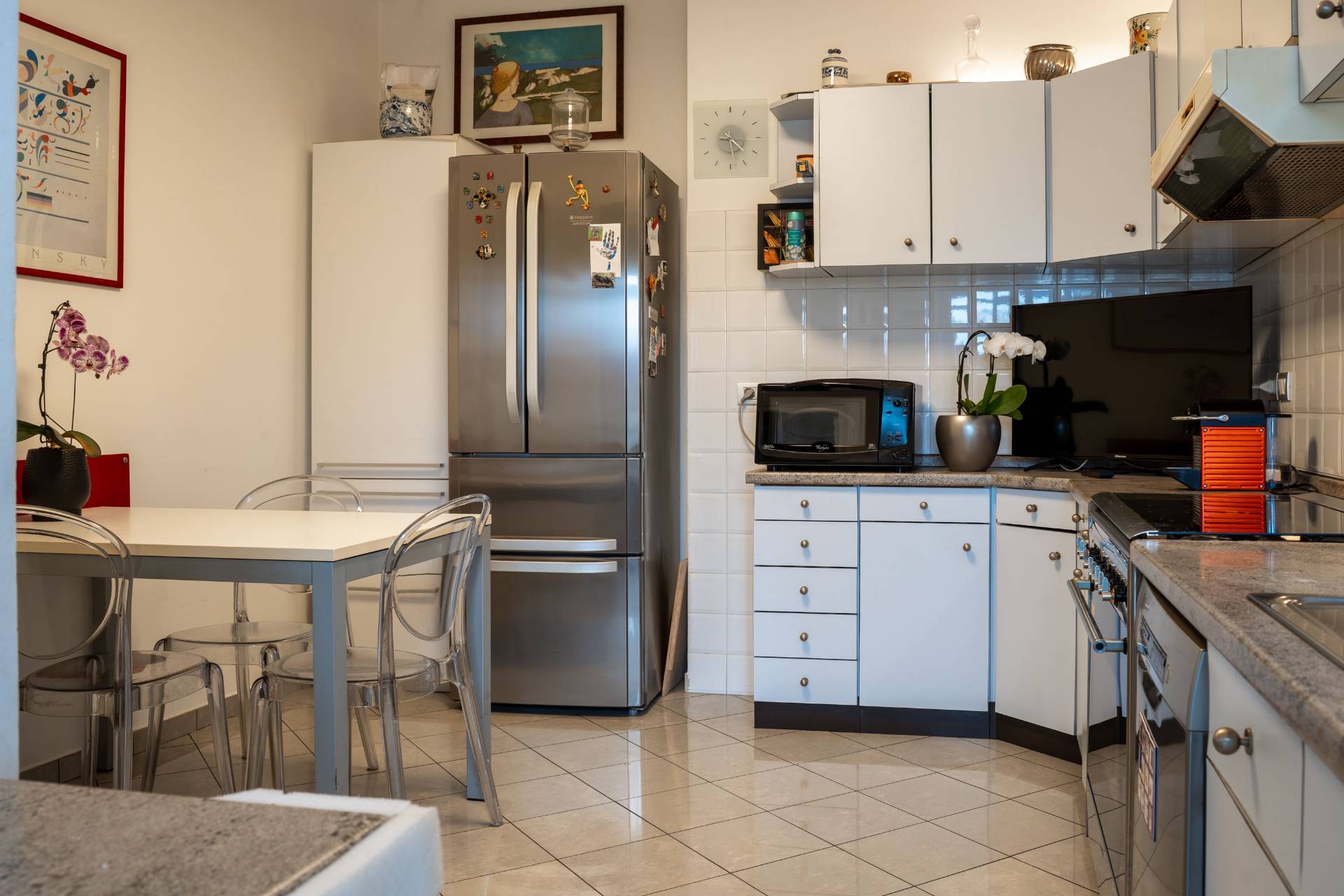 L'unit cosi composta: doppi ingressi, disimpegni, salone angolare, cinque camere, cucina, quattro servizi, ripostiglio, lavamano, lavanderia e veranda; completano la propriet una cantina al piano 2° sotterraneo e due soffitte al piano sottotetto.