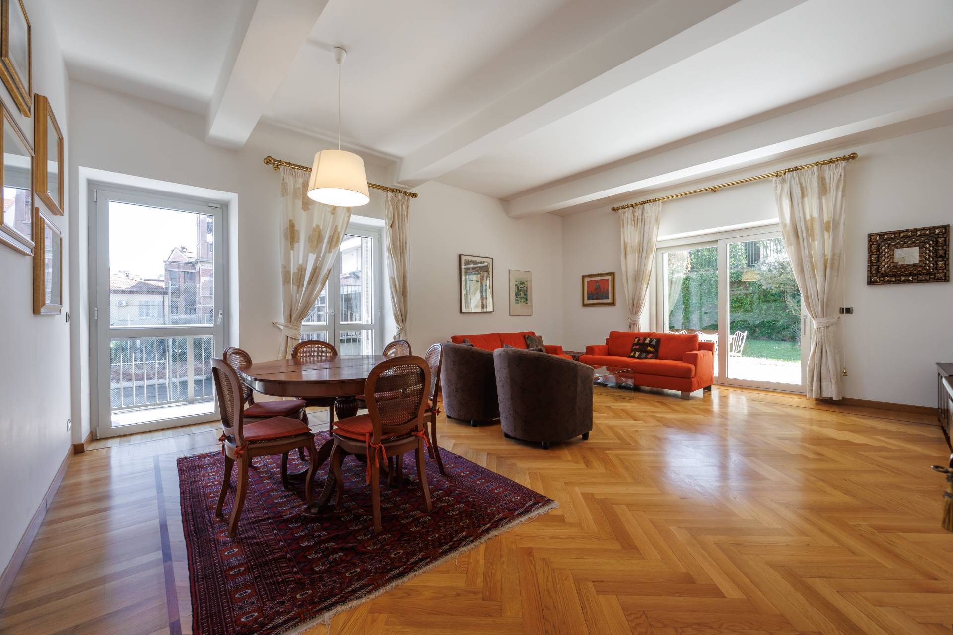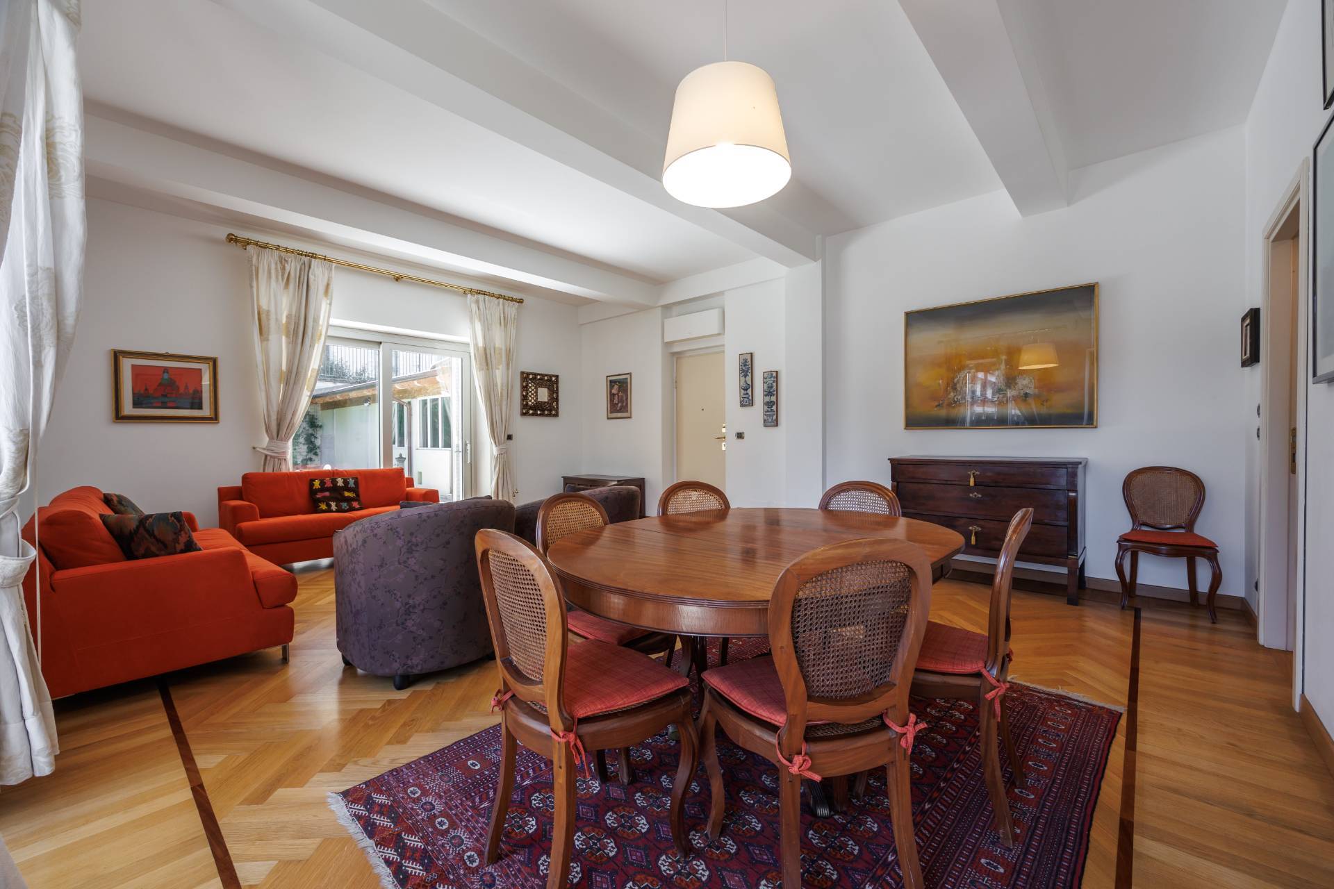 Lingresso conduce a un magnifico living di rappresentanza, impreziosito da una straordinaria luminosit naturale e da ampie aperture che accompagnano lo sguardo verso il terrazzo e il giardino privato.