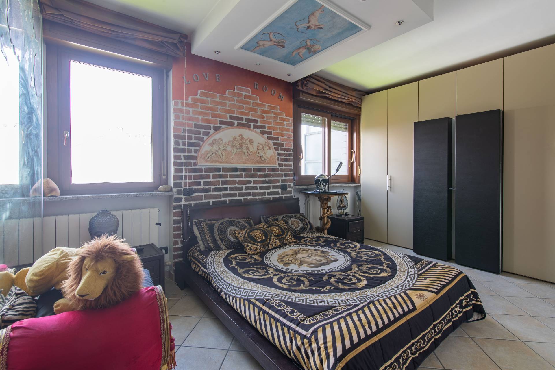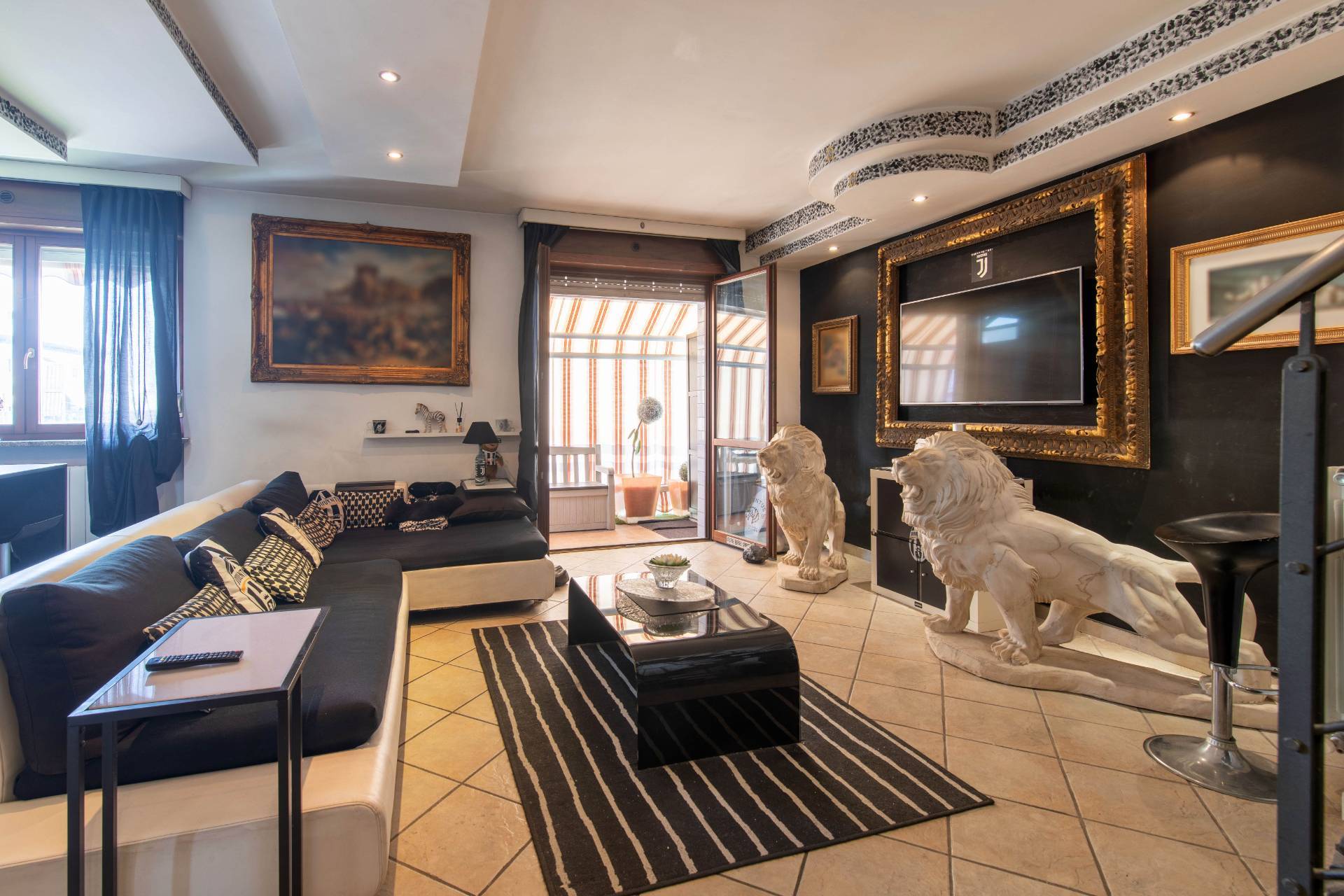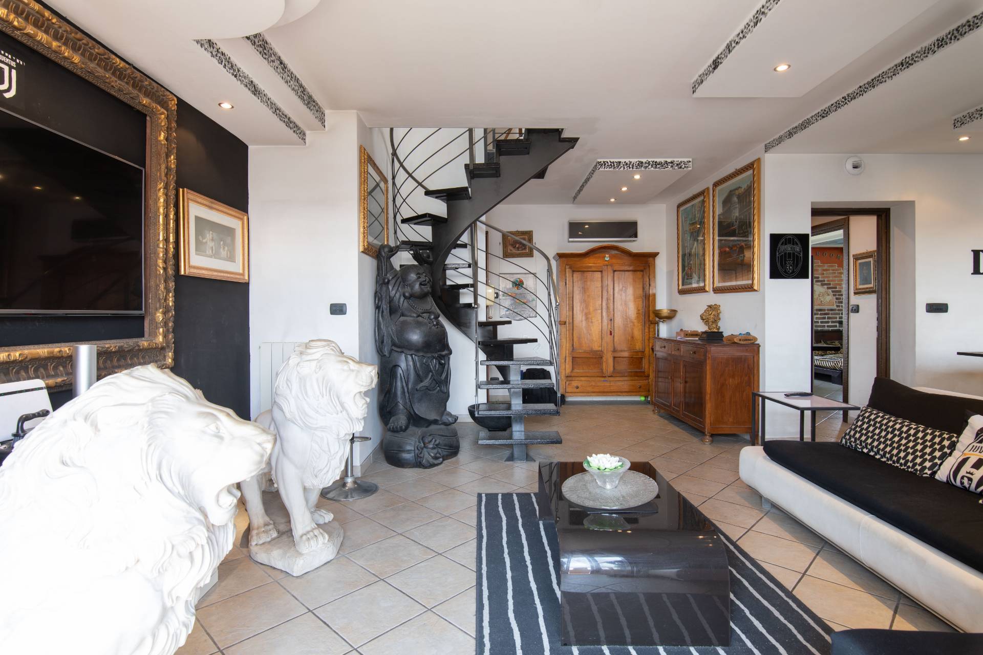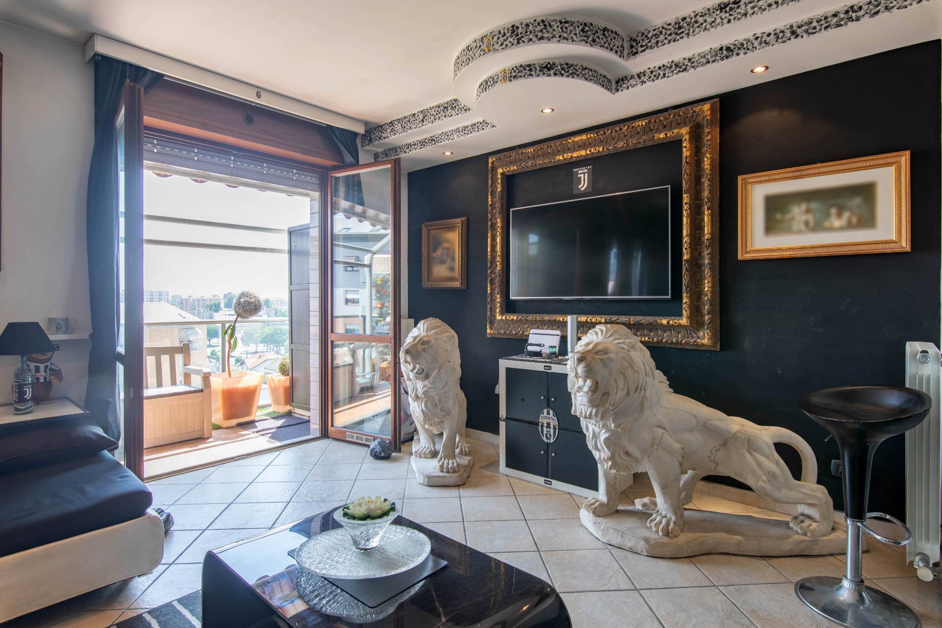Il piano principale (ottavo piano) si apre su un ampia zona giorno open space con cucina a vista, balcone con vista diretta sullAllianz Stadium perfetto per vivere da vicino latmosfera delle grandi partite, camera matrimoniale e un moderno bagno finestrato.