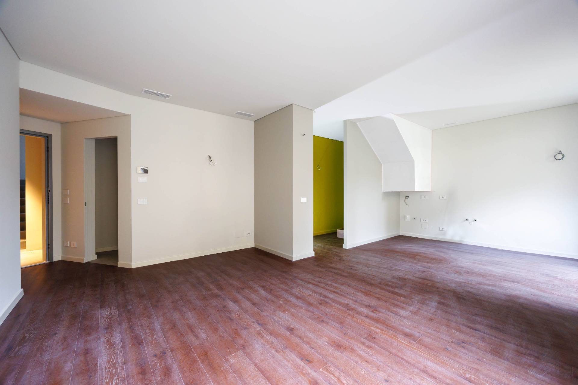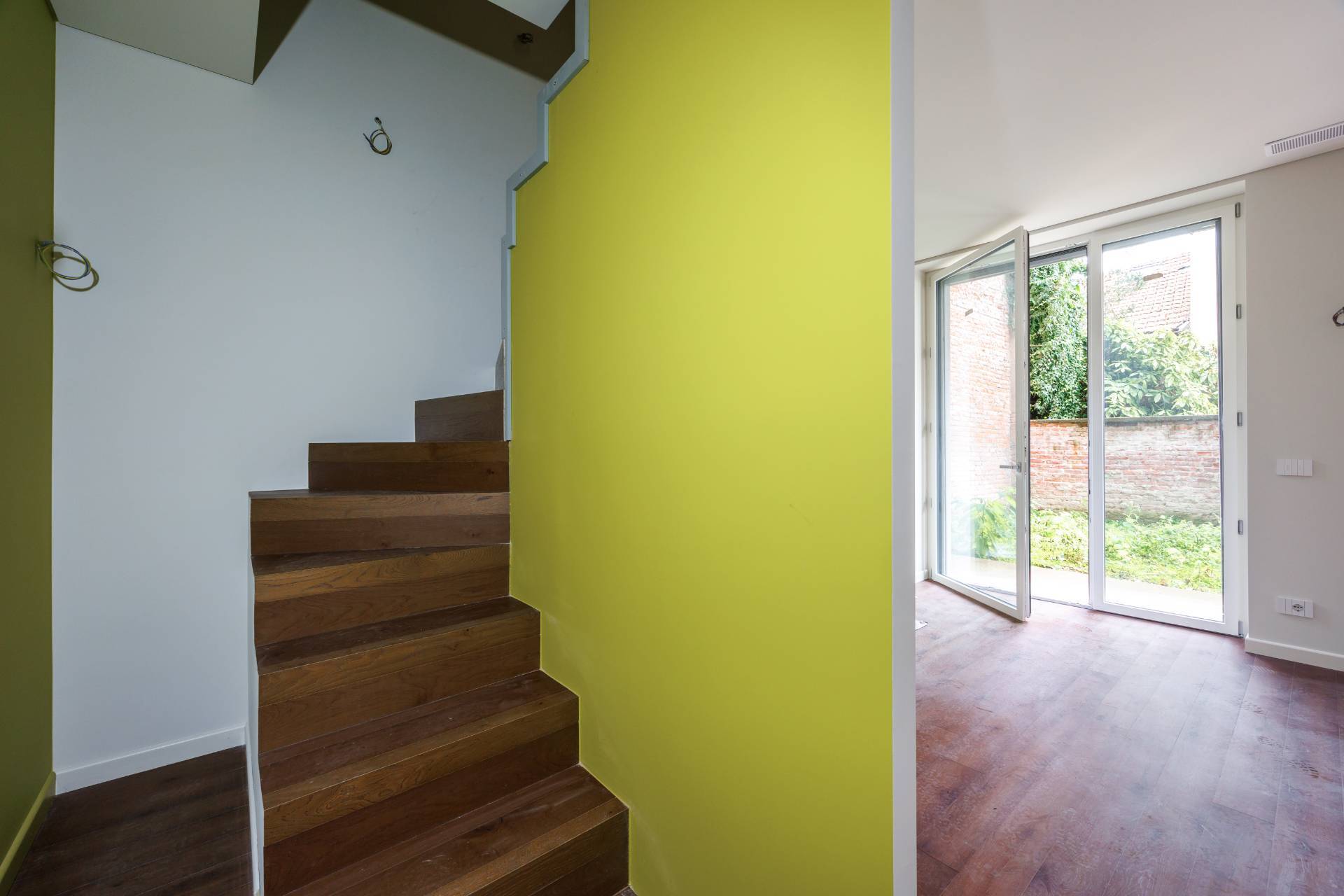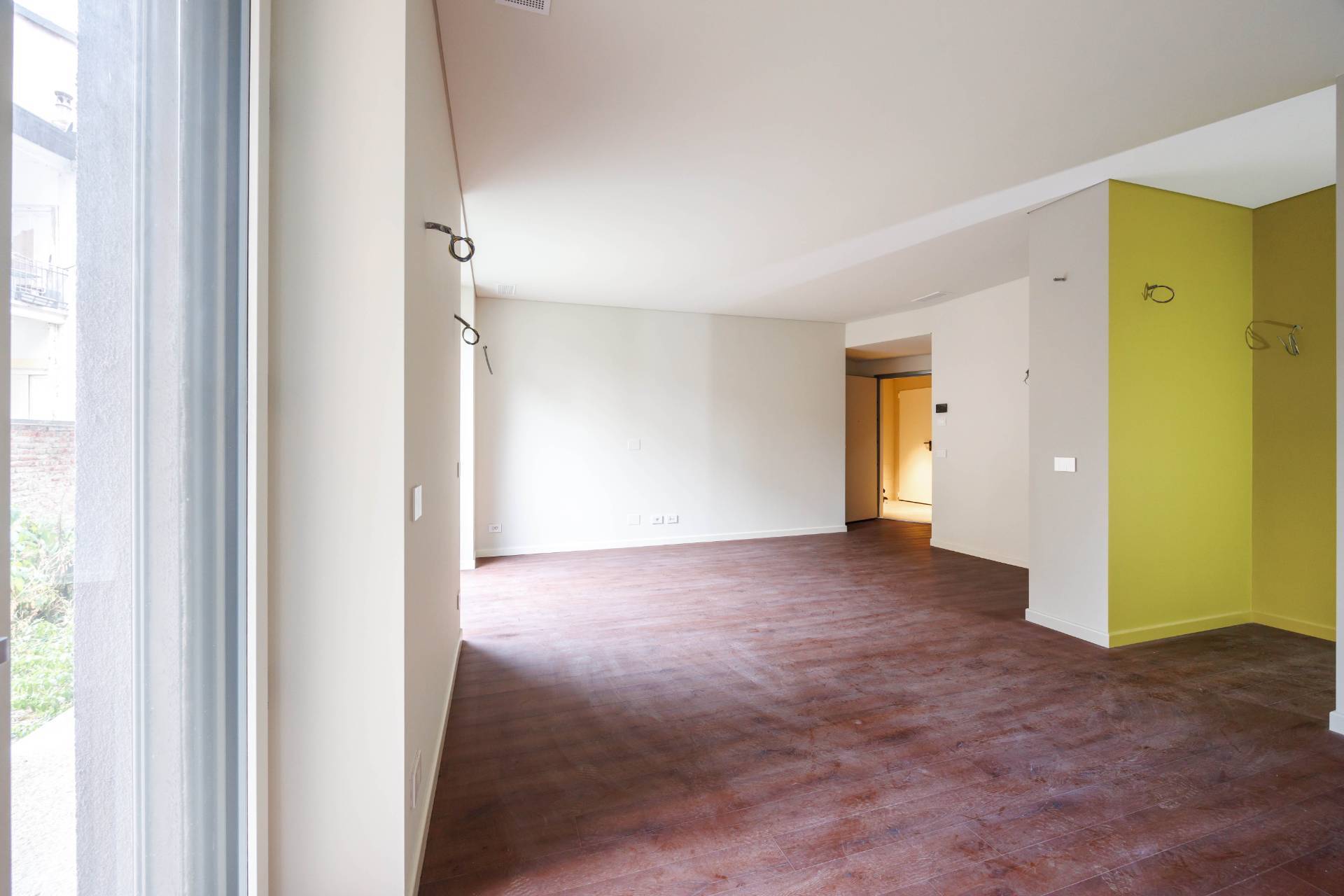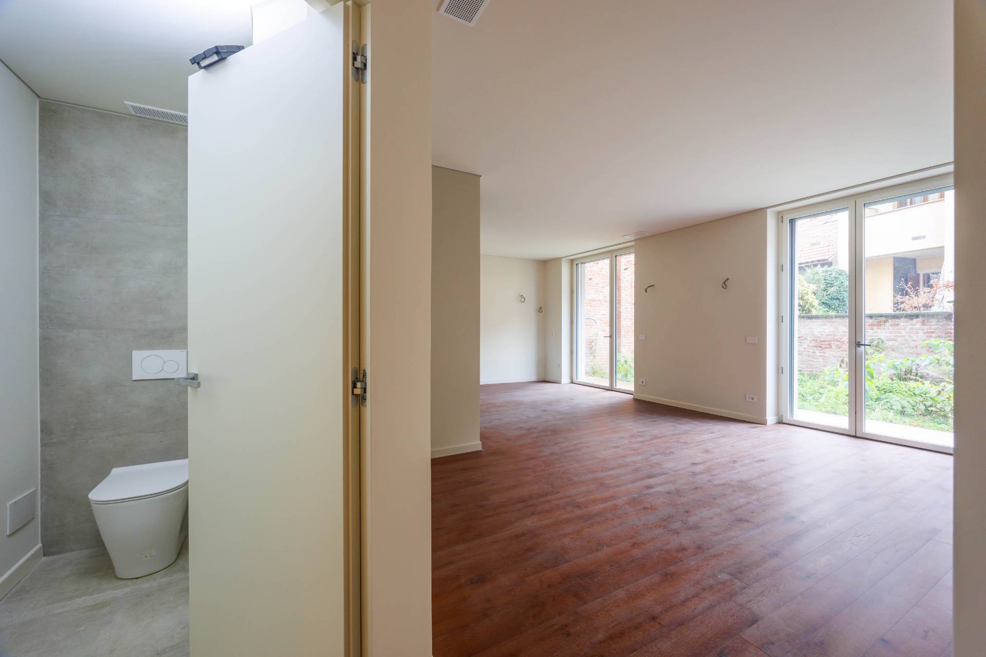 Lappartamento proposto un elegante bilivello: Piano terra: luminoso soggiorno con cucina a vista e affaccio sul giardino privato di 42 mq, bagno.