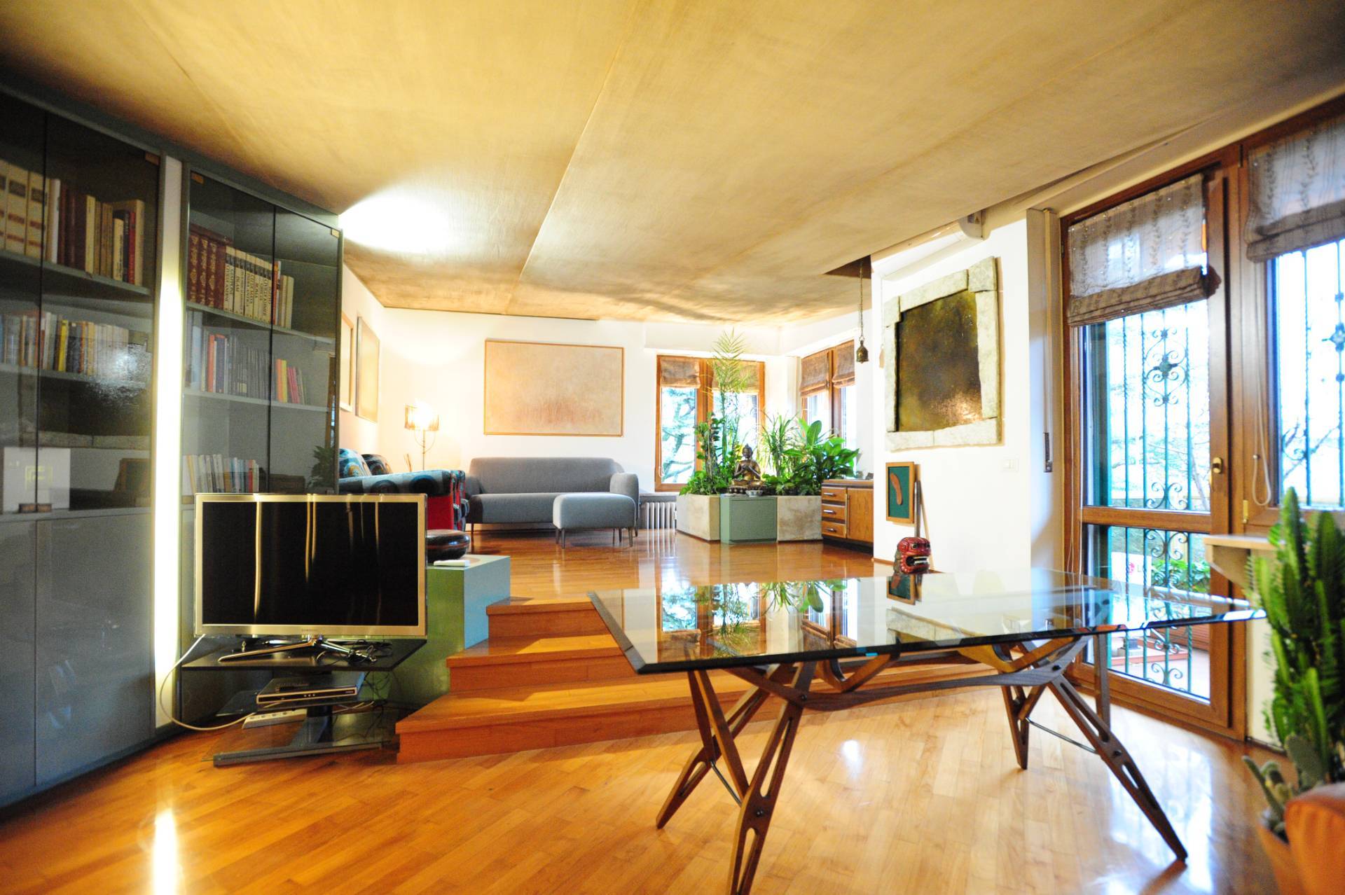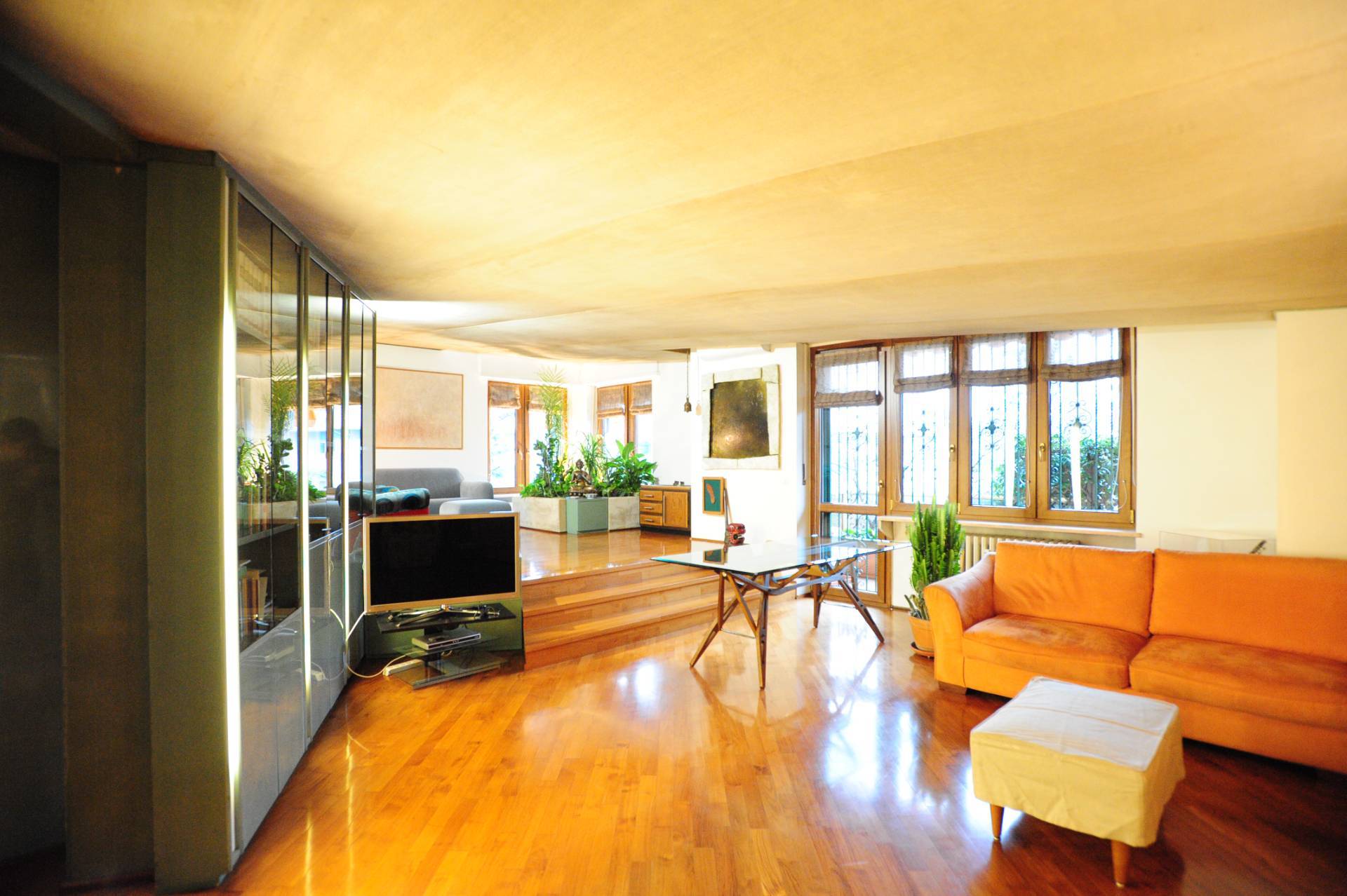 La zona notte comprende tre generose camere da letto con particolare bagno in mosaico di ceramica bisazza e doccia walk-in. Completa il compendio immobiliare un box auto doppio, cantina e soffitta.