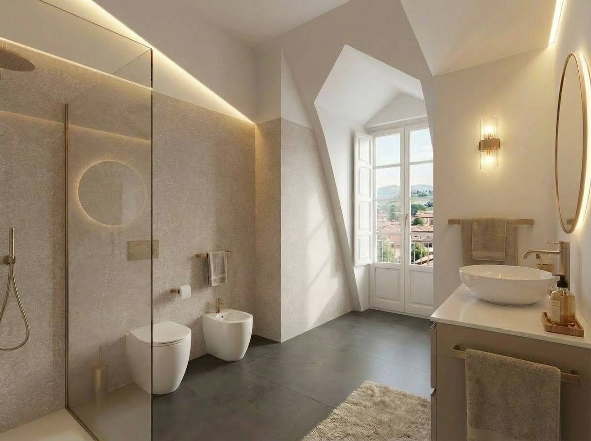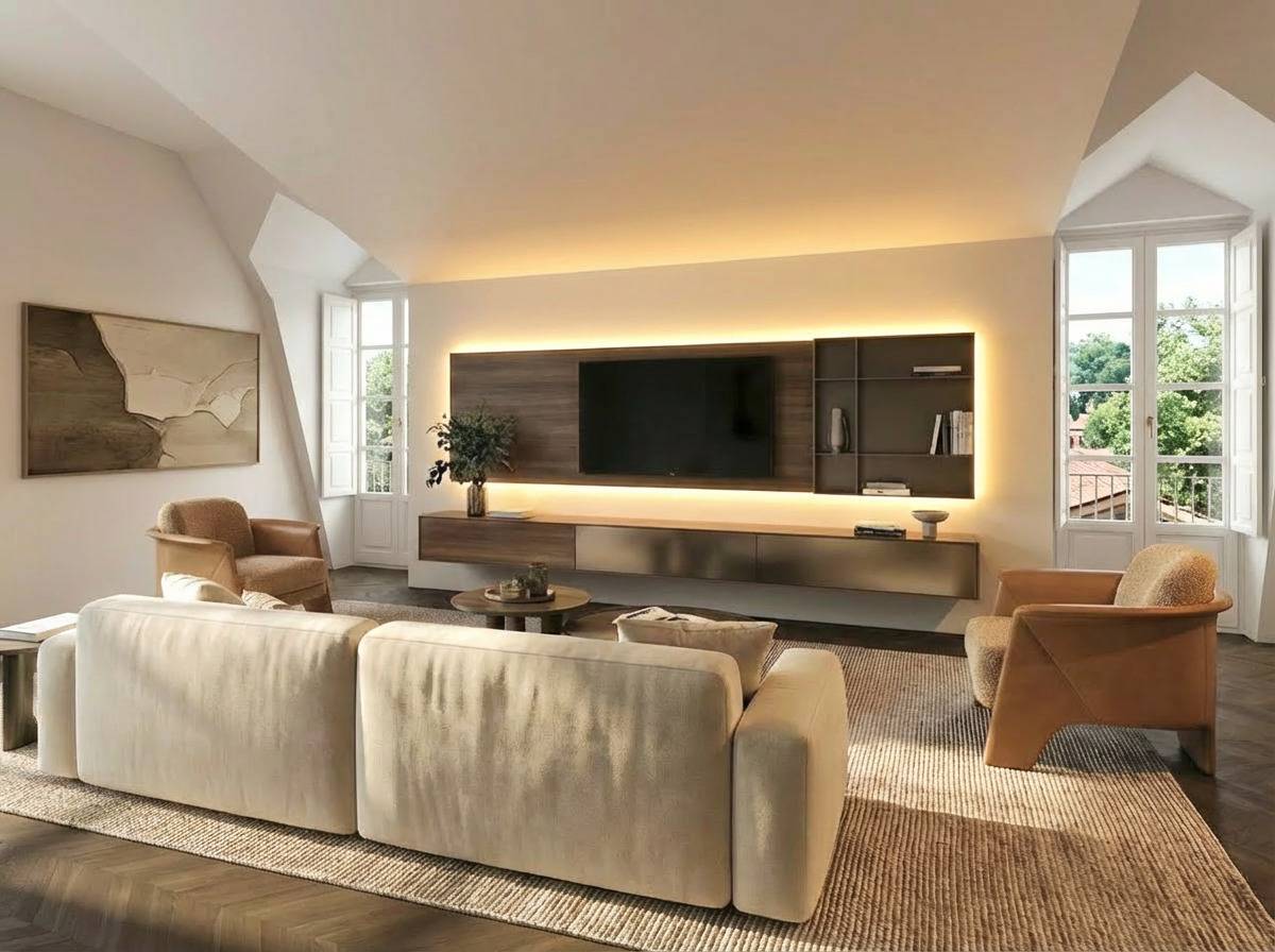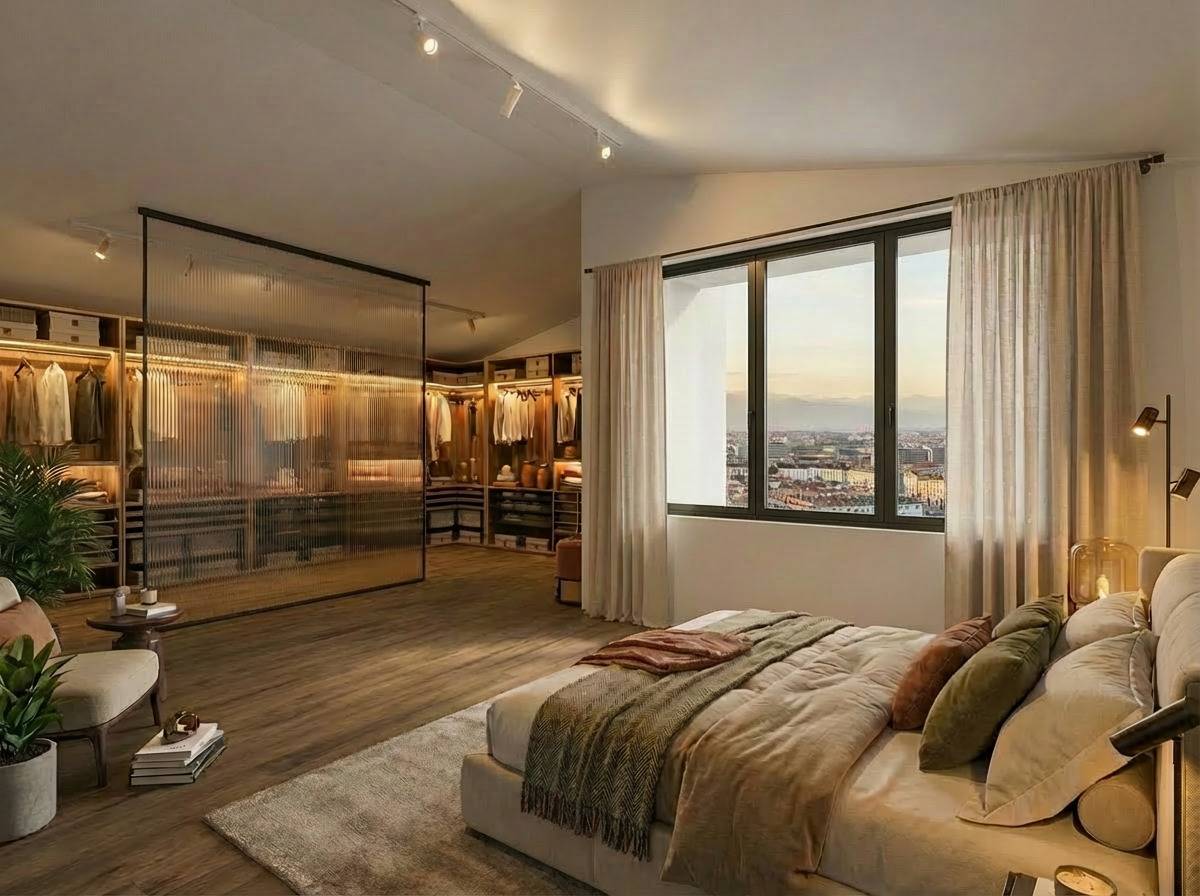 Al piano superiore mansardato, le cui altezze garantiscono la massima fruibilit degli ambienti, il progetto prevede una camera matrimoniale con cabina armadio e bagno privato ed una master room, anchessa con bagno e zona armadi, che gode di una spettacolare vista sulla citt. Un ulteriore ampia zona, pu essere organizzata come zona relax tv e studio o in alternativa possibile creare la zona cucina con sala da pranzo e bagno di cortesia, qualora si preferisse realizzare una camera al piano sottostante.