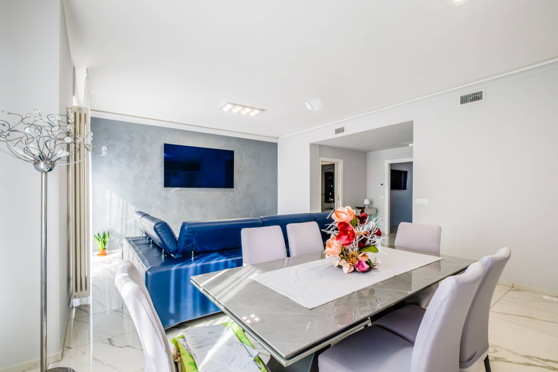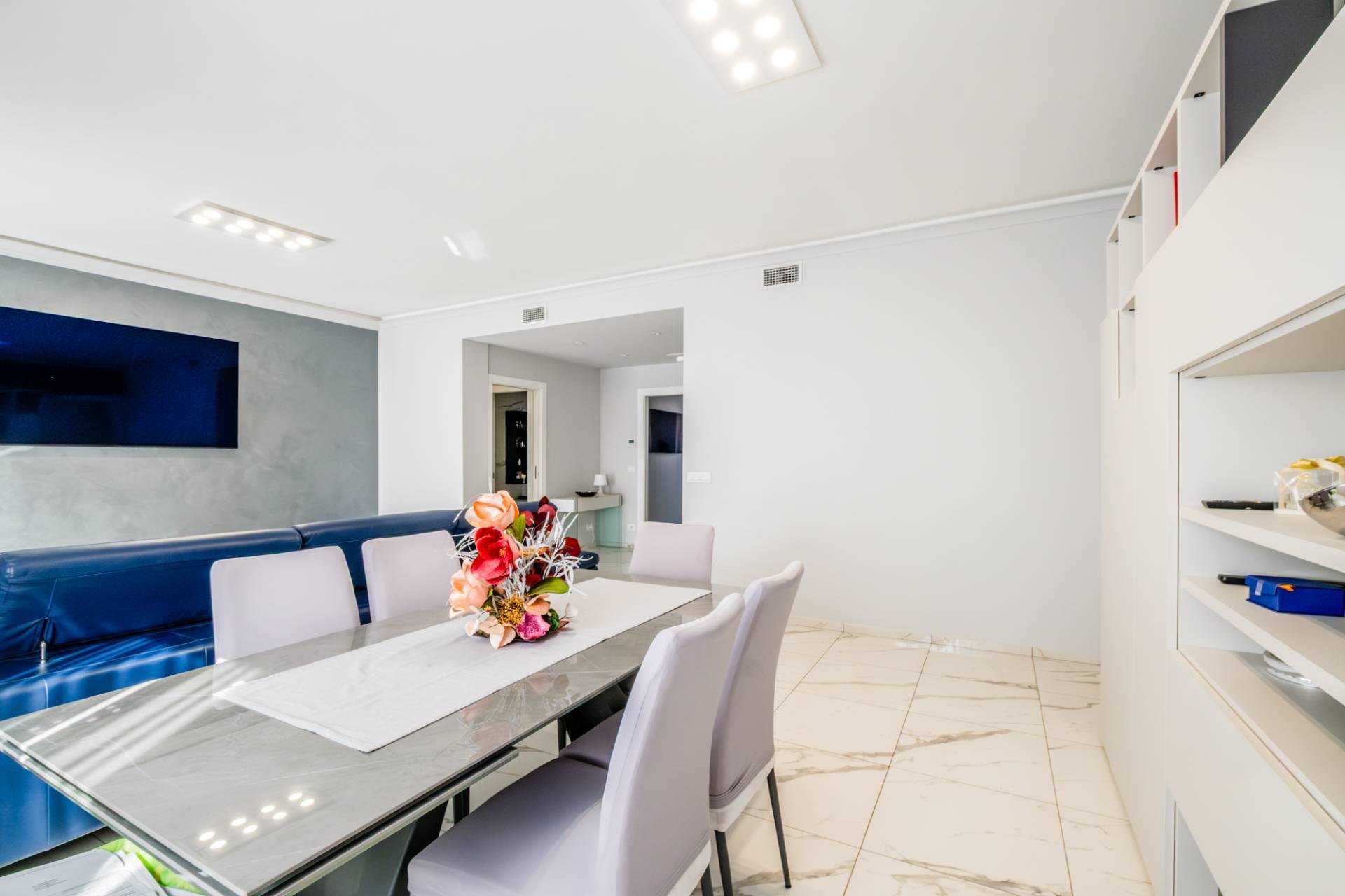 L'unit immobiliare si presenta con tripli ingressi, salone doppio, cucina abiltabile, quattro camere da letto matrimoniali di cui due con cabine armadi, tre bagni ed una comoda lavanderia.
