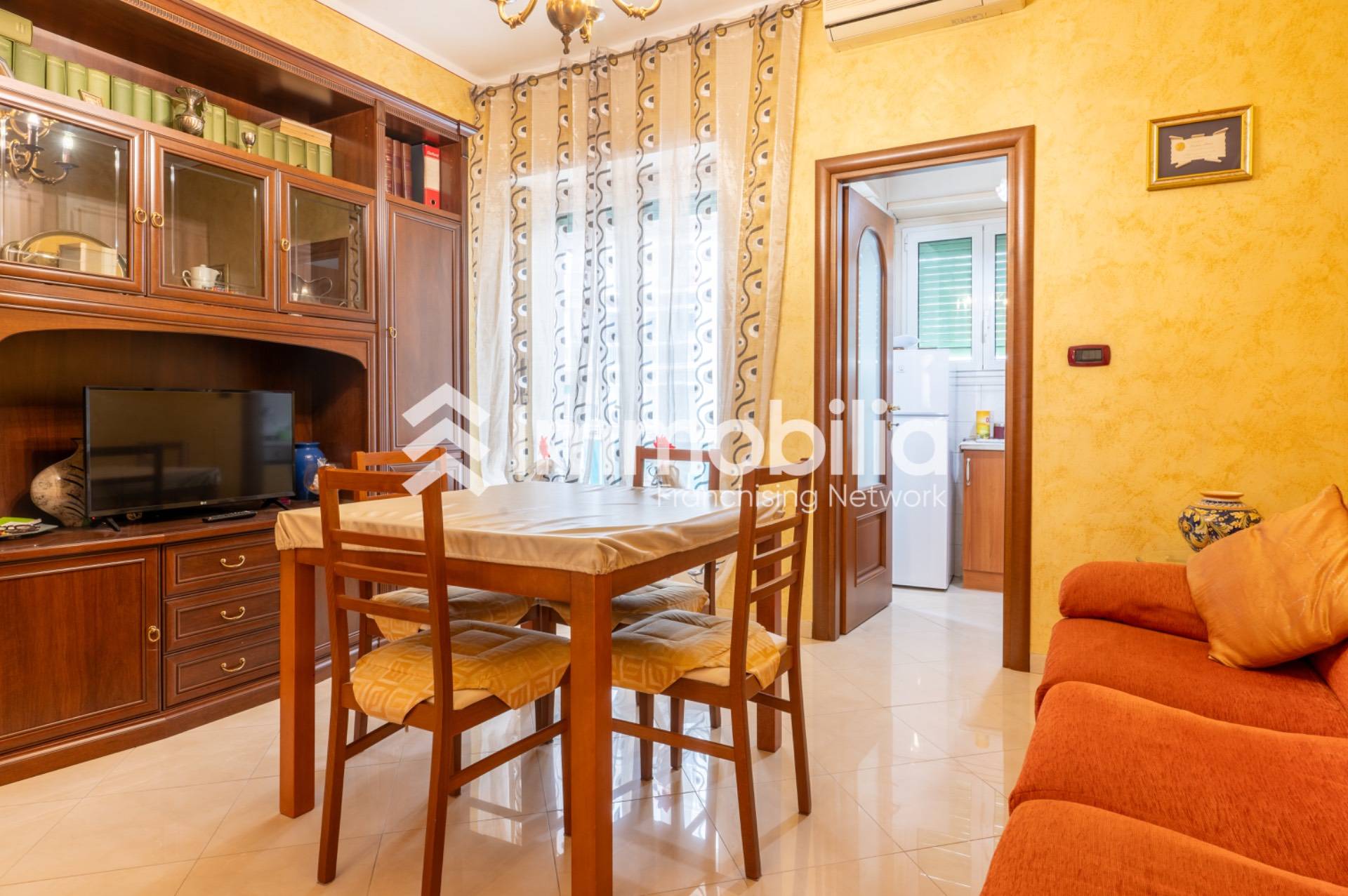 Lingresso si apre su un ampio disimpegno che distribuisce in modo funzionale i diversi ambienti della casa. La zona giorno composta da un spazioso salone e da un cucinotto separato; entrambi gli ambienti godono dellaccesso diretto al balcone, rendendo larea living ariosa e ben illuminata.