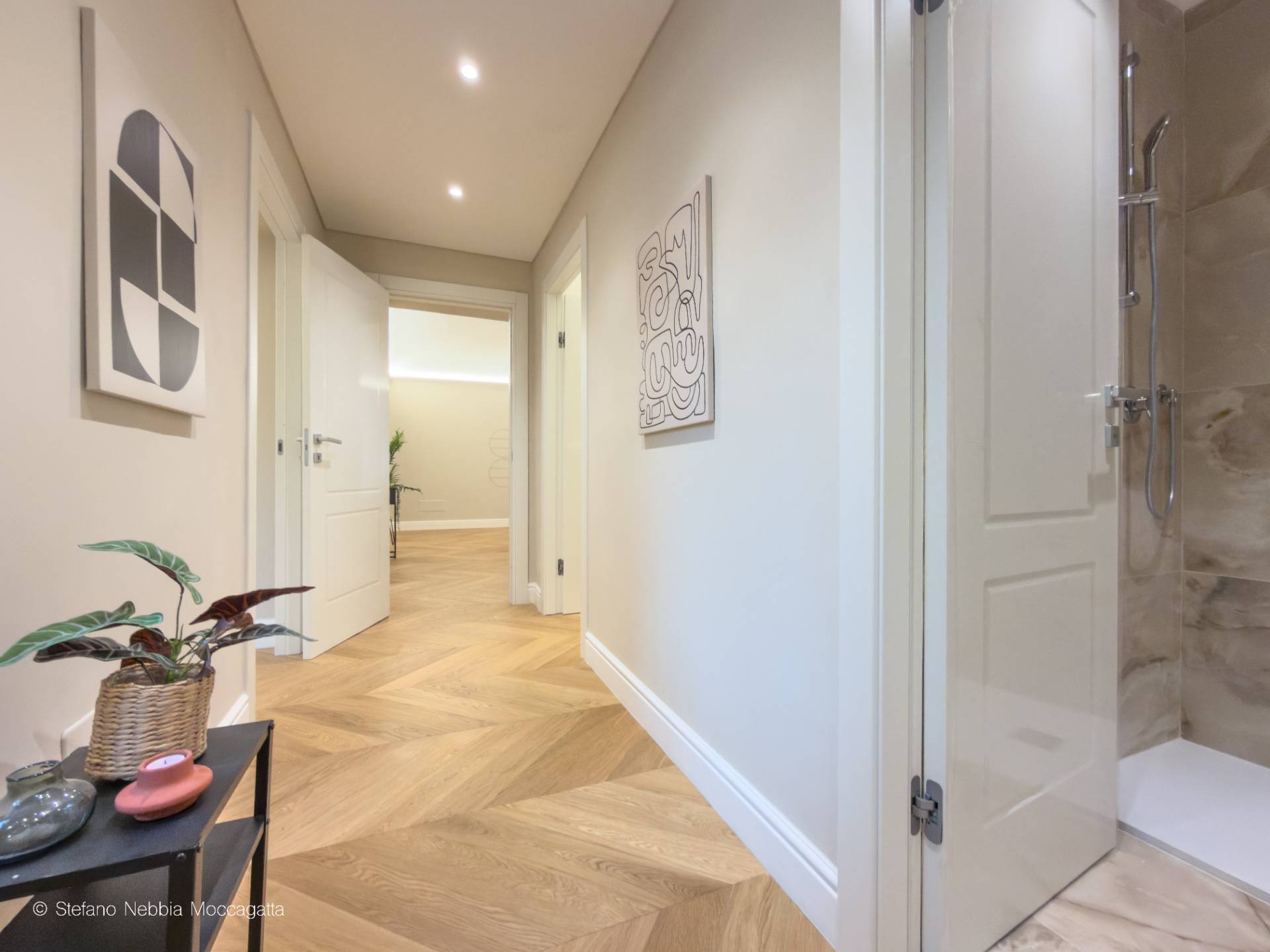 I pavimenti in legno naturale a spina italiana, le ceramiche di grande formato e una palette di colori accuratamente studiata donano ad ogni ambiente uneleganza raffinata e un calore contemporaneo.