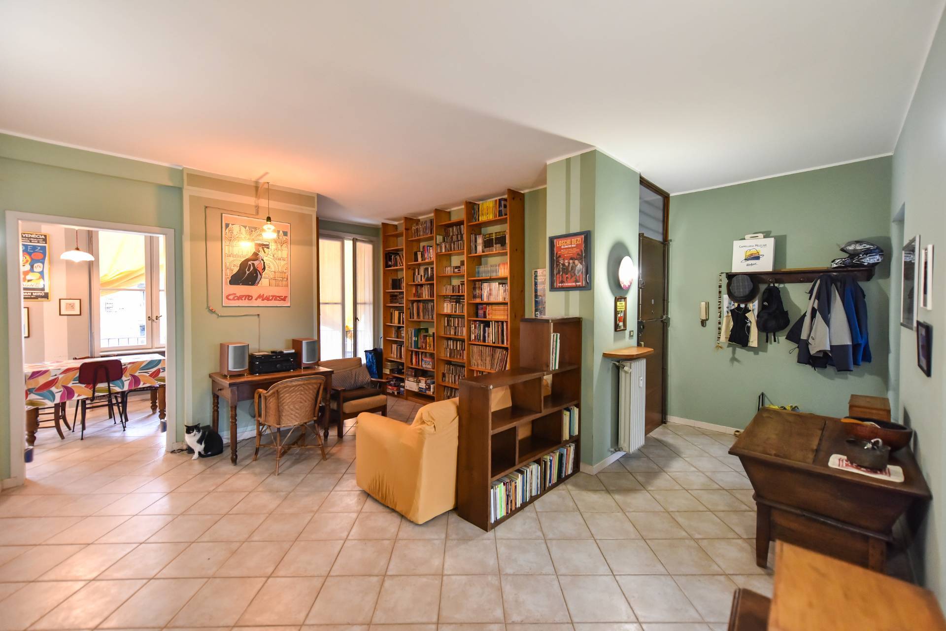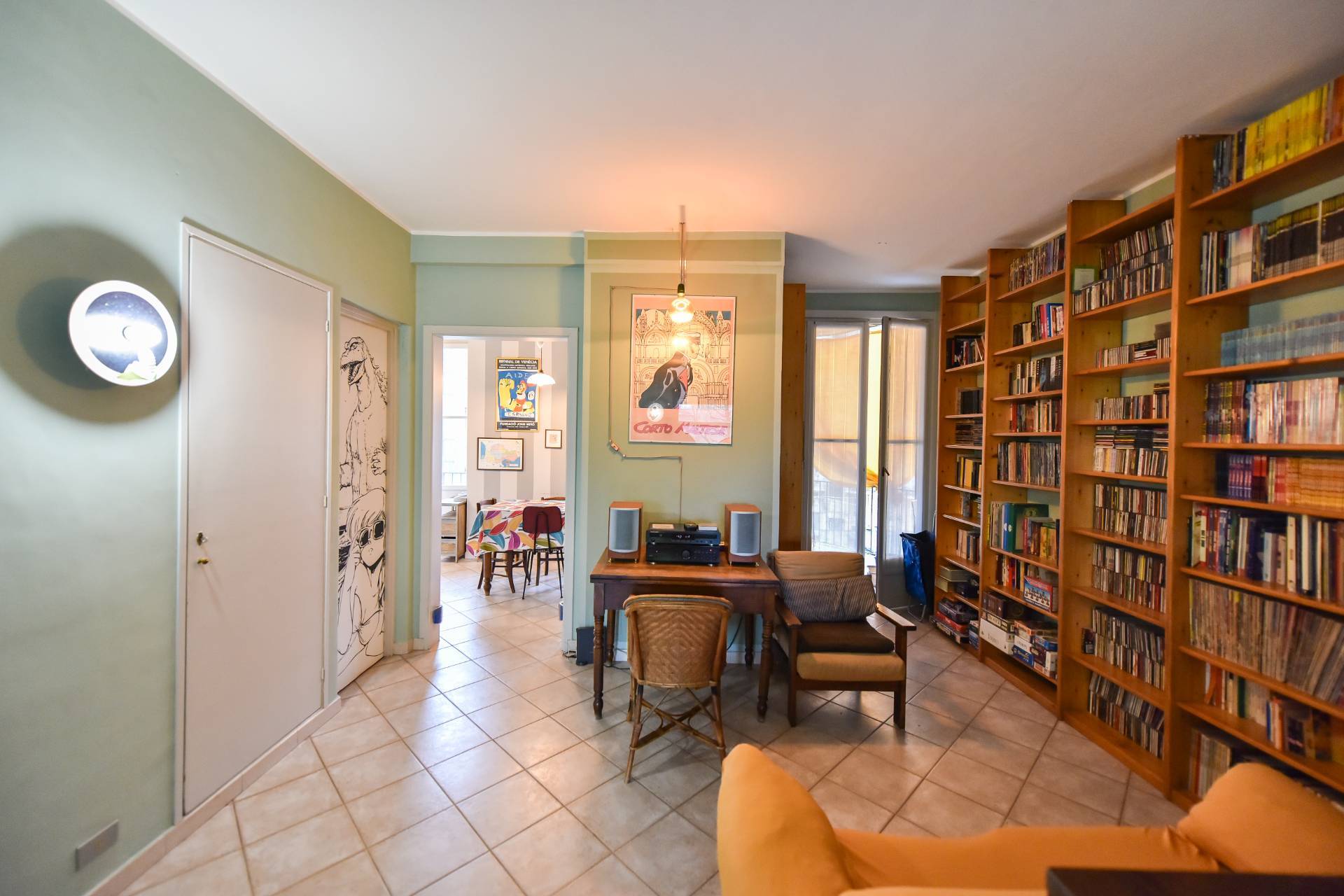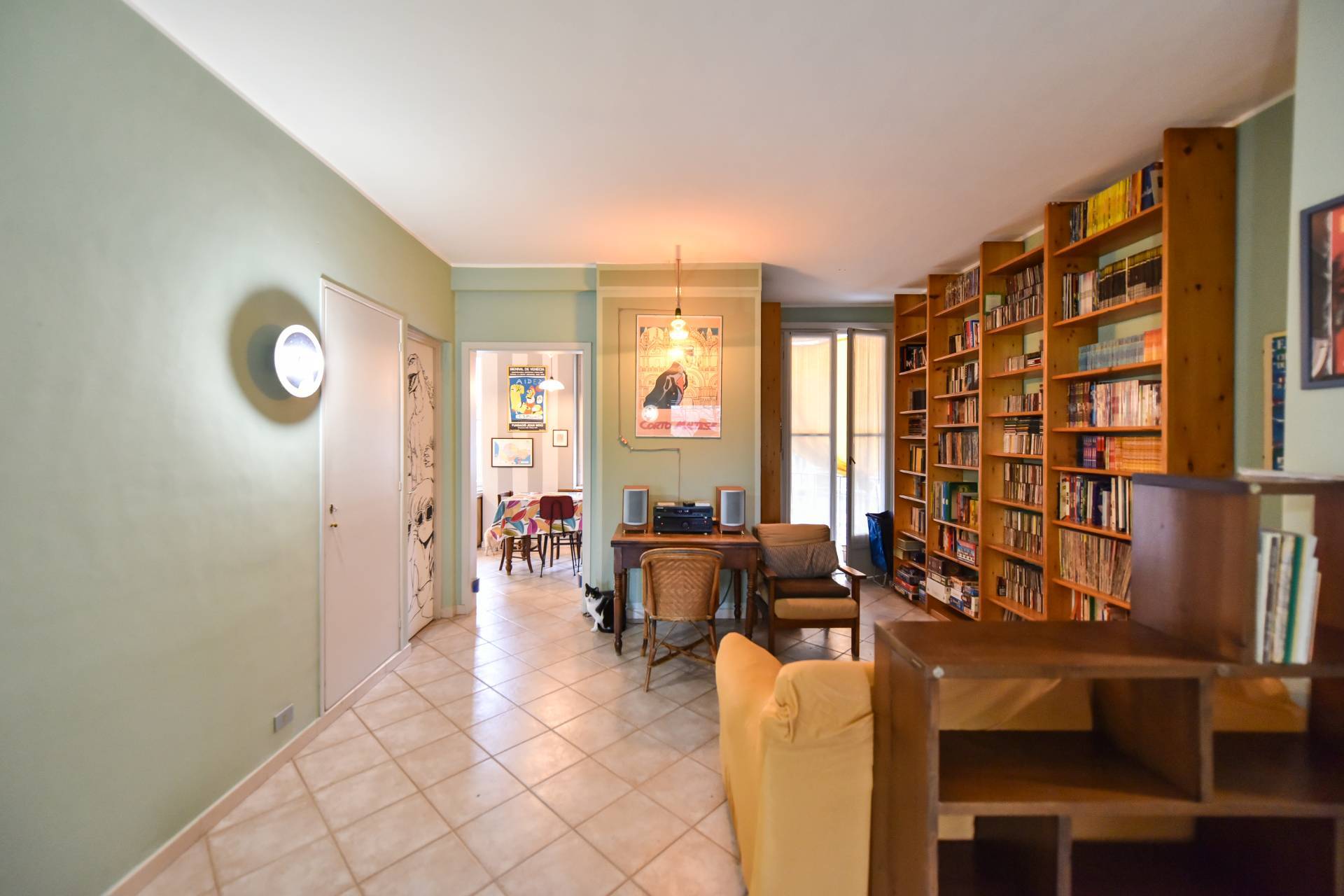 L'ampio soggiorno si collega alla cucina abitabile dotata di finestra e porta finestra con accesso al balcone lato cortile interno.