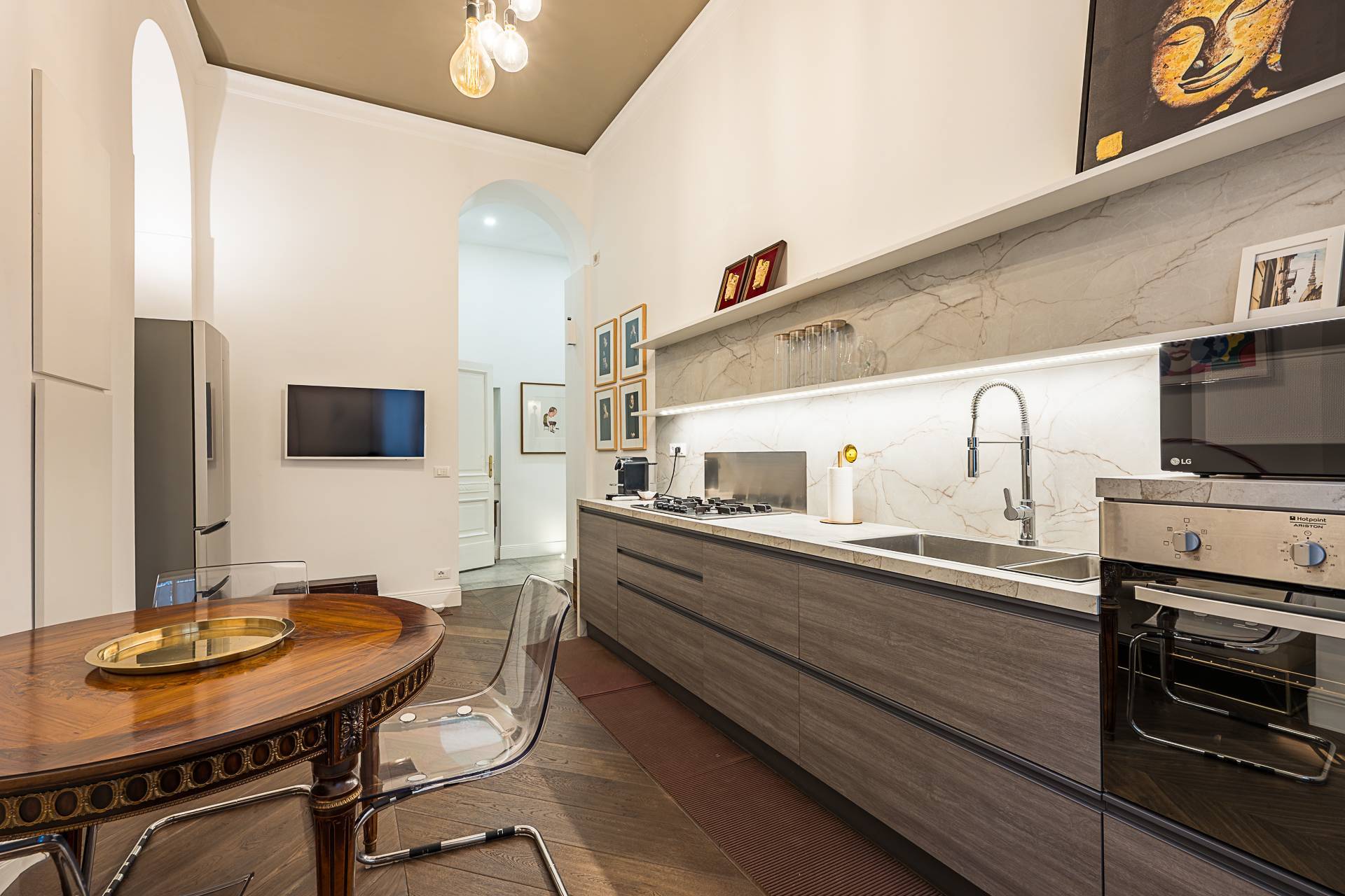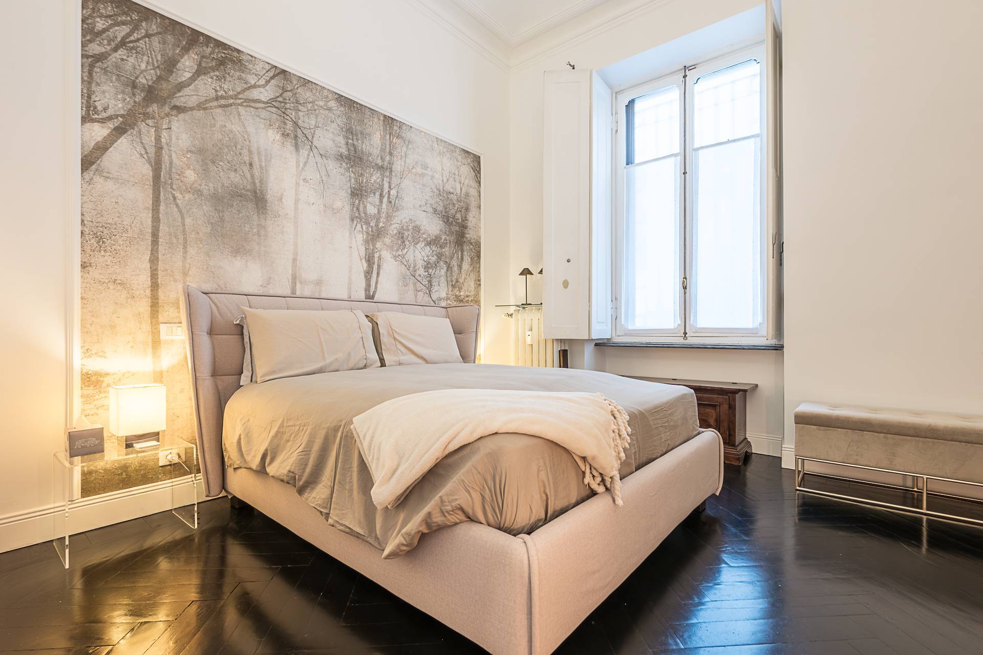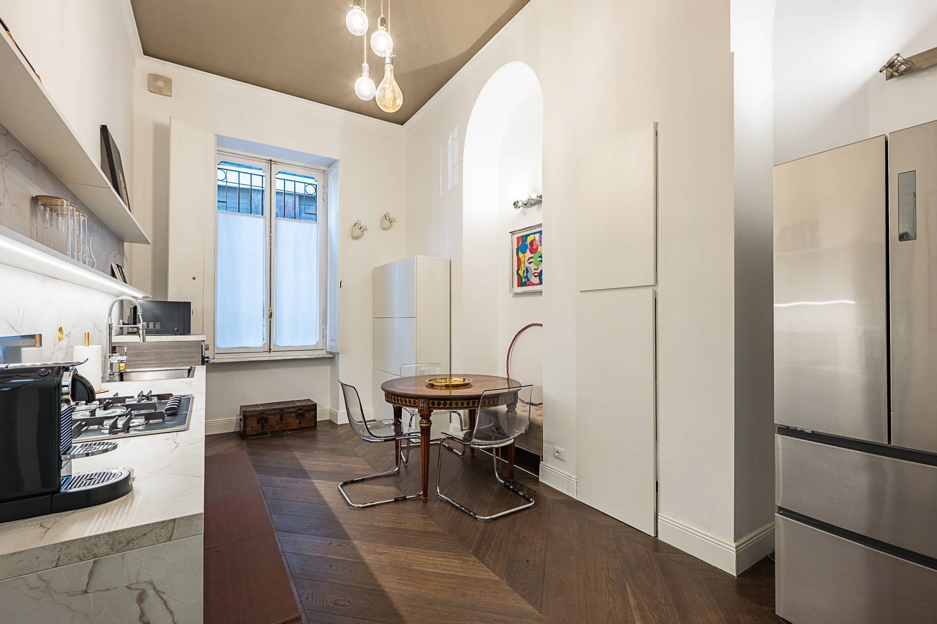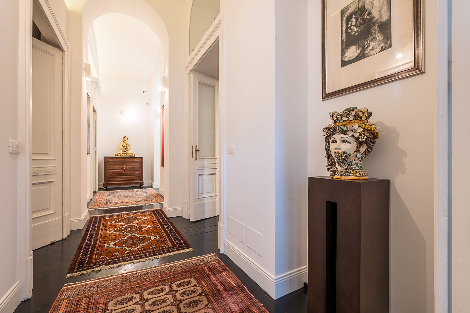 L'appartamento curato nei minimi dettagli, risulta molto luminoso data l'altezza dei soffitti, parquet uniforme in tutti gli ambienti, impianto di filodiffusione, impianto di antifurto volumetrico, inferriate alle finestre, serramenti con doppi vetri.