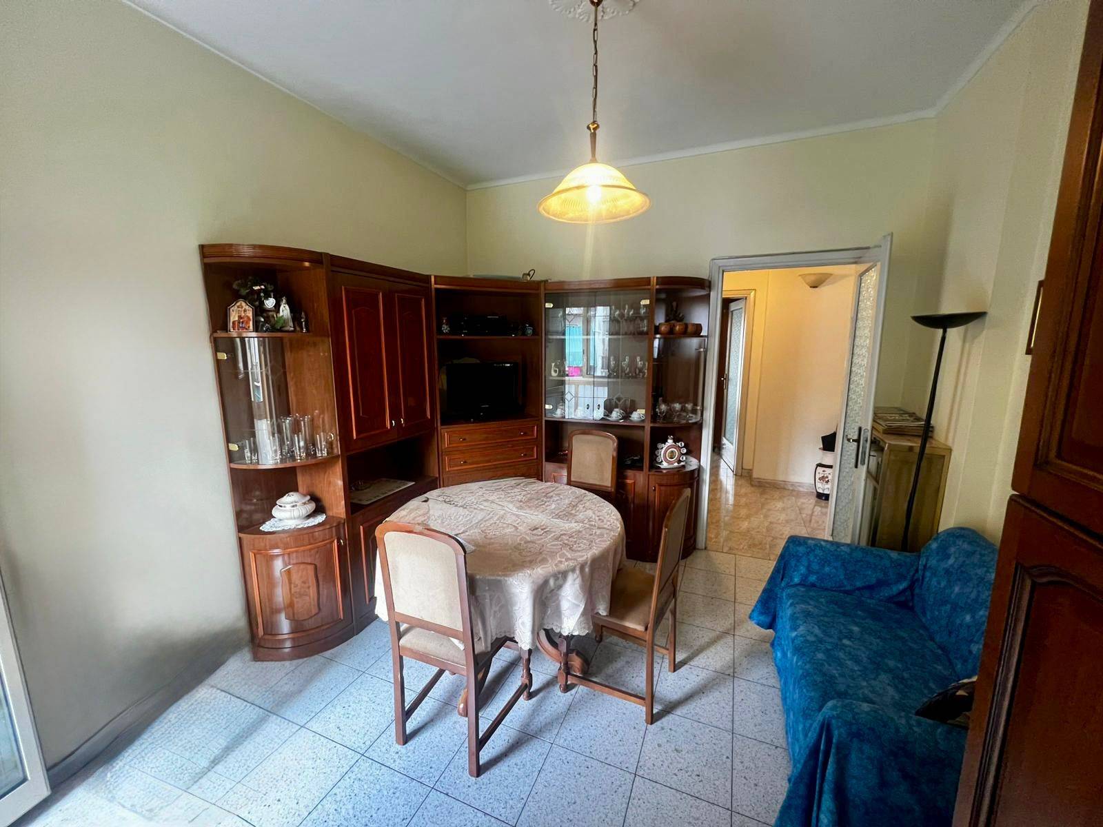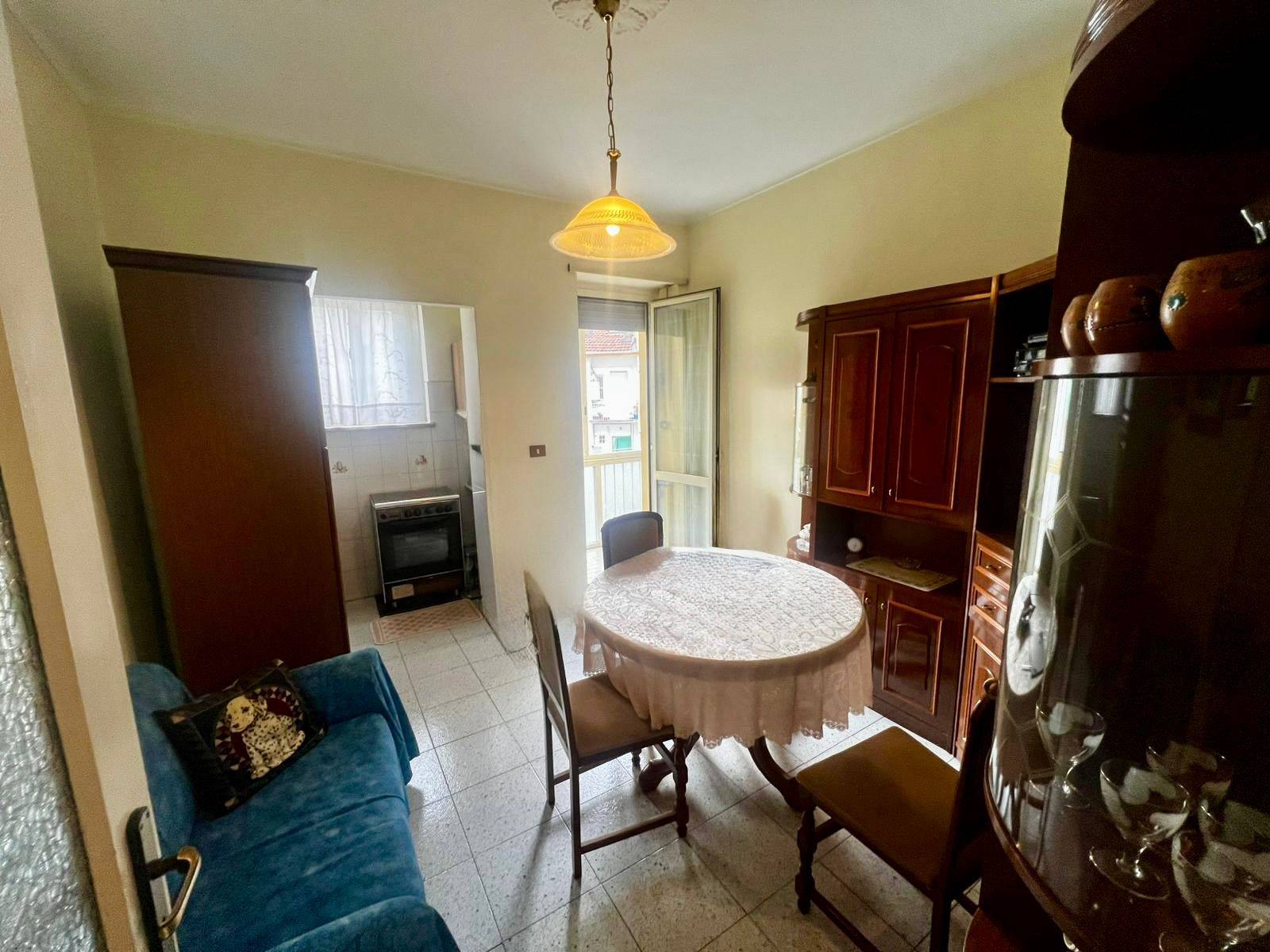 Lingresso si apre su un comodo disimpegno, che accompagna in una zona giorno luminosa con tinello spazioso e cucinino separato.