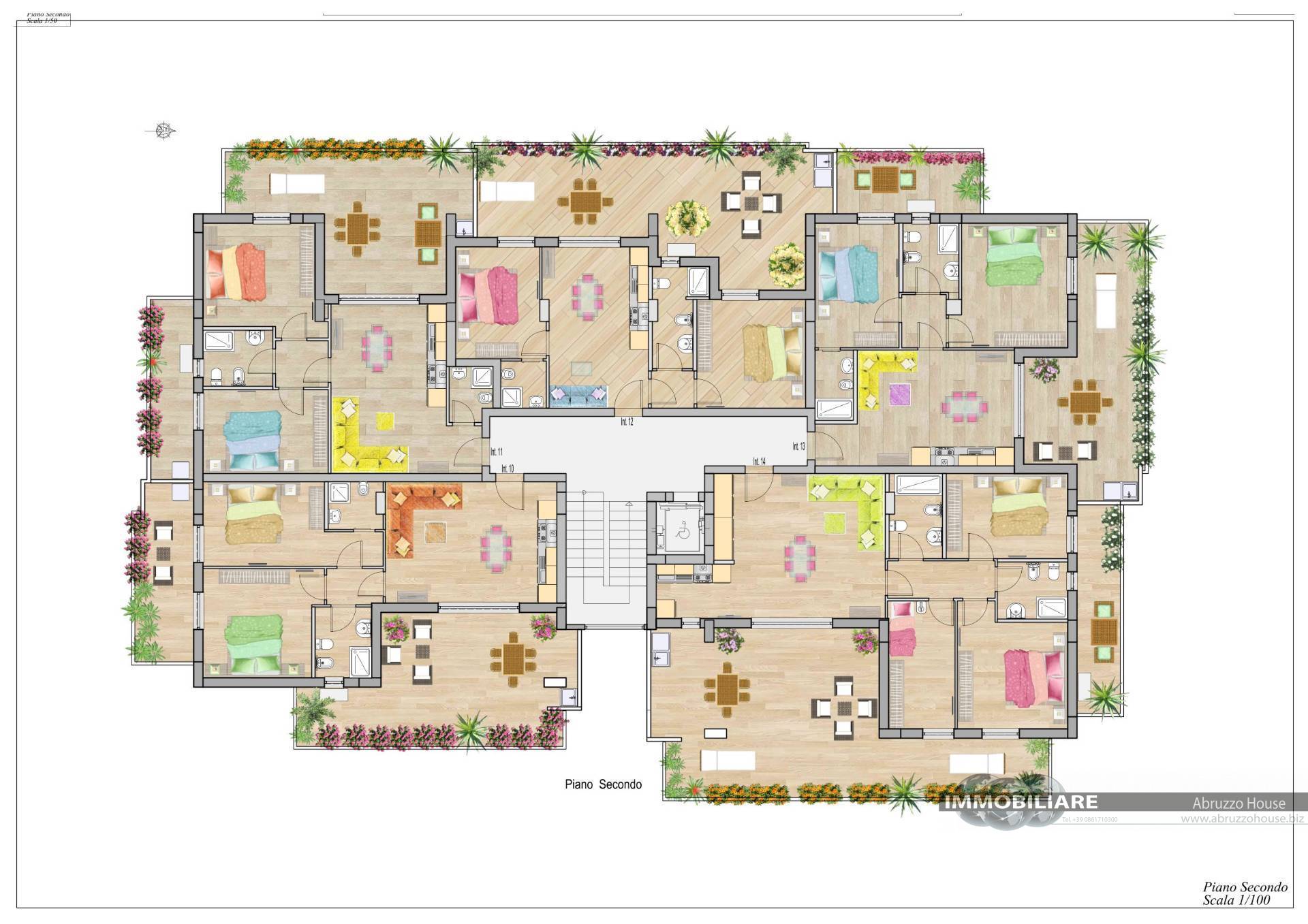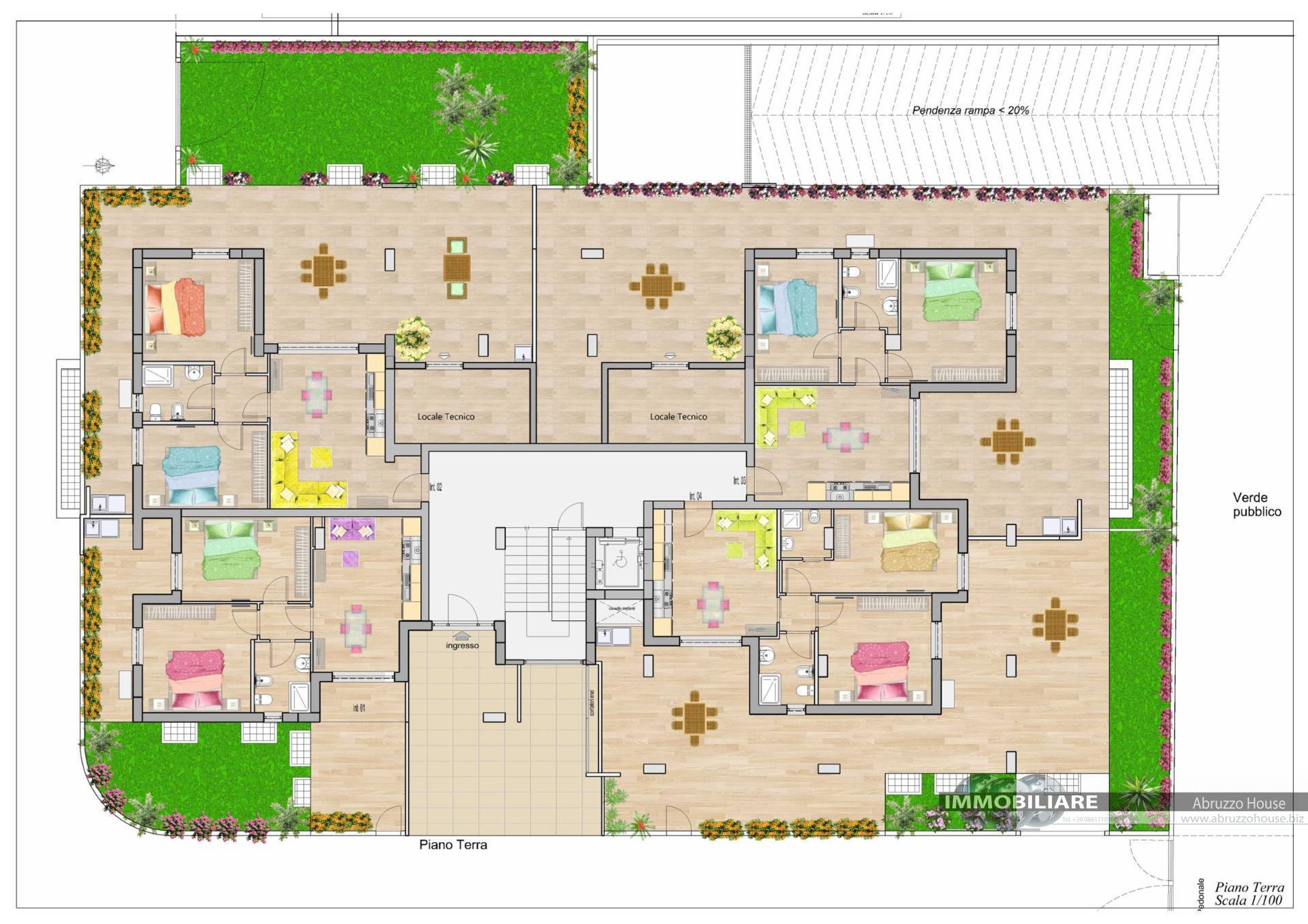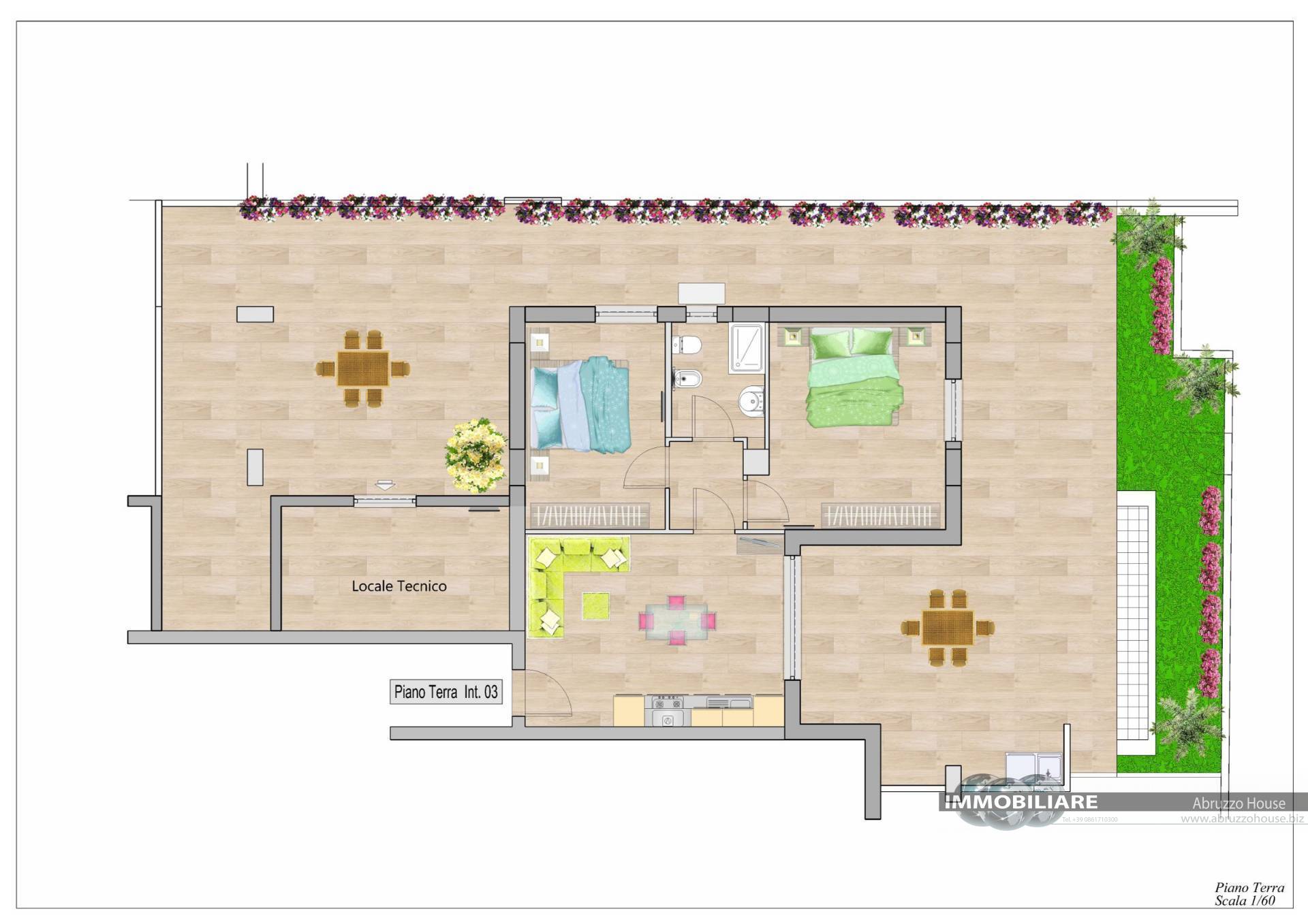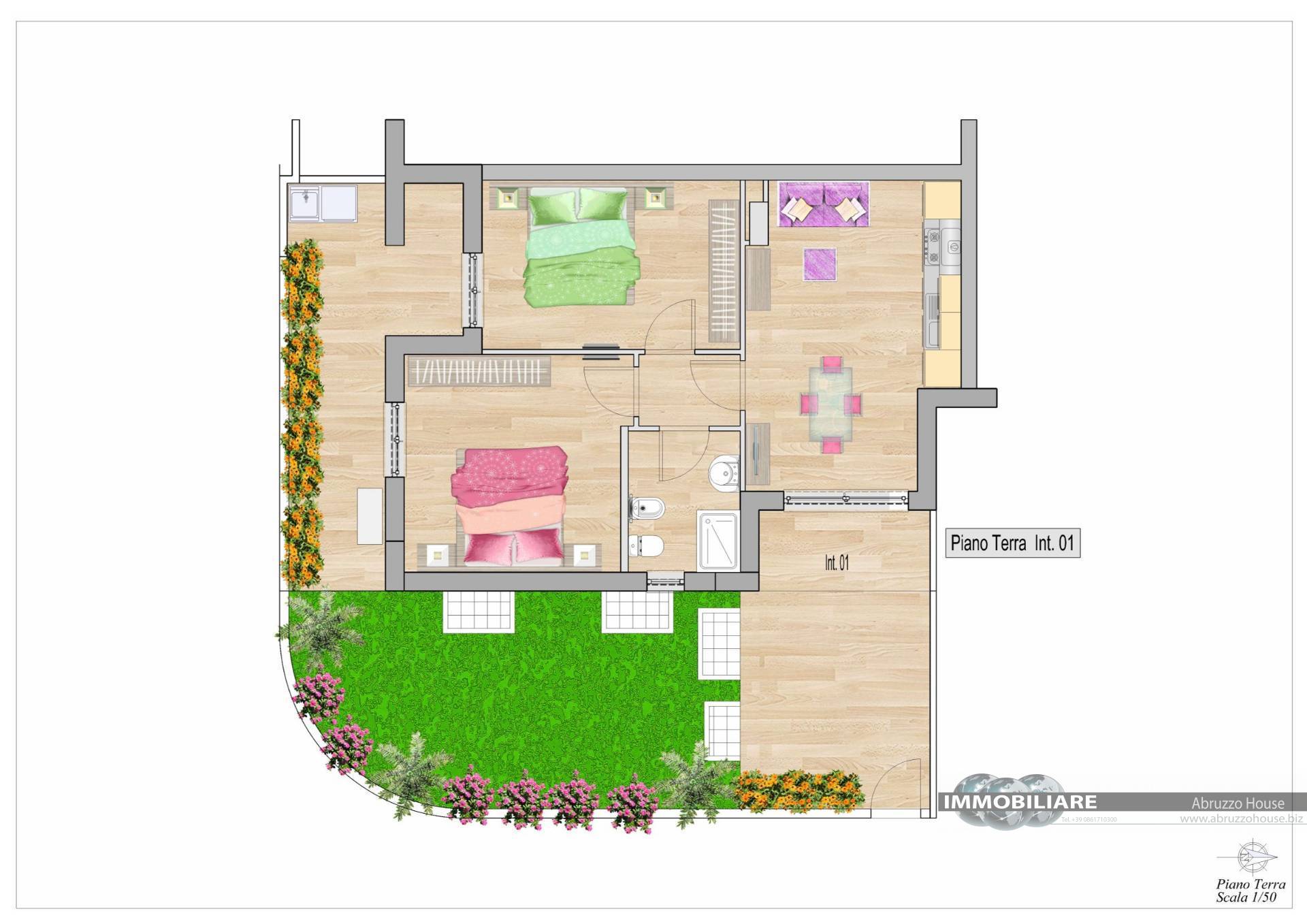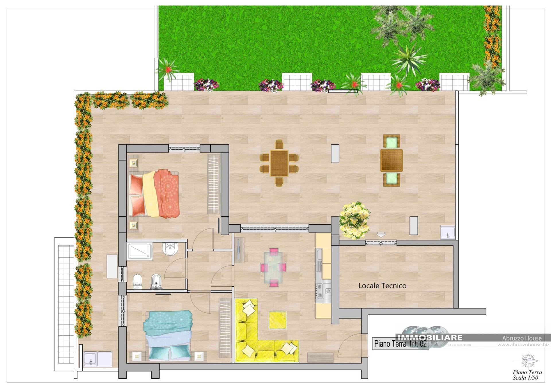 Appartamento in vendita a Tortoreto Lido in elegante e rifinita palazzina in fase di realizzazione a soli 400 metri dal mare. L'appartamento sito al piano terra ha una metratura di circa 56 mq ed composto da ingresso su soggiorno con angolo cottura, disimpegno, due camere matrimoniali, bagno e spazio esterno in parte pavimentato e in parte adibito a giardino di circa 54 mq. La palazzina sar realizzata con elevata attenzione al risparmio energetico e sar dotata di struttura antisismica di ultima generazione.