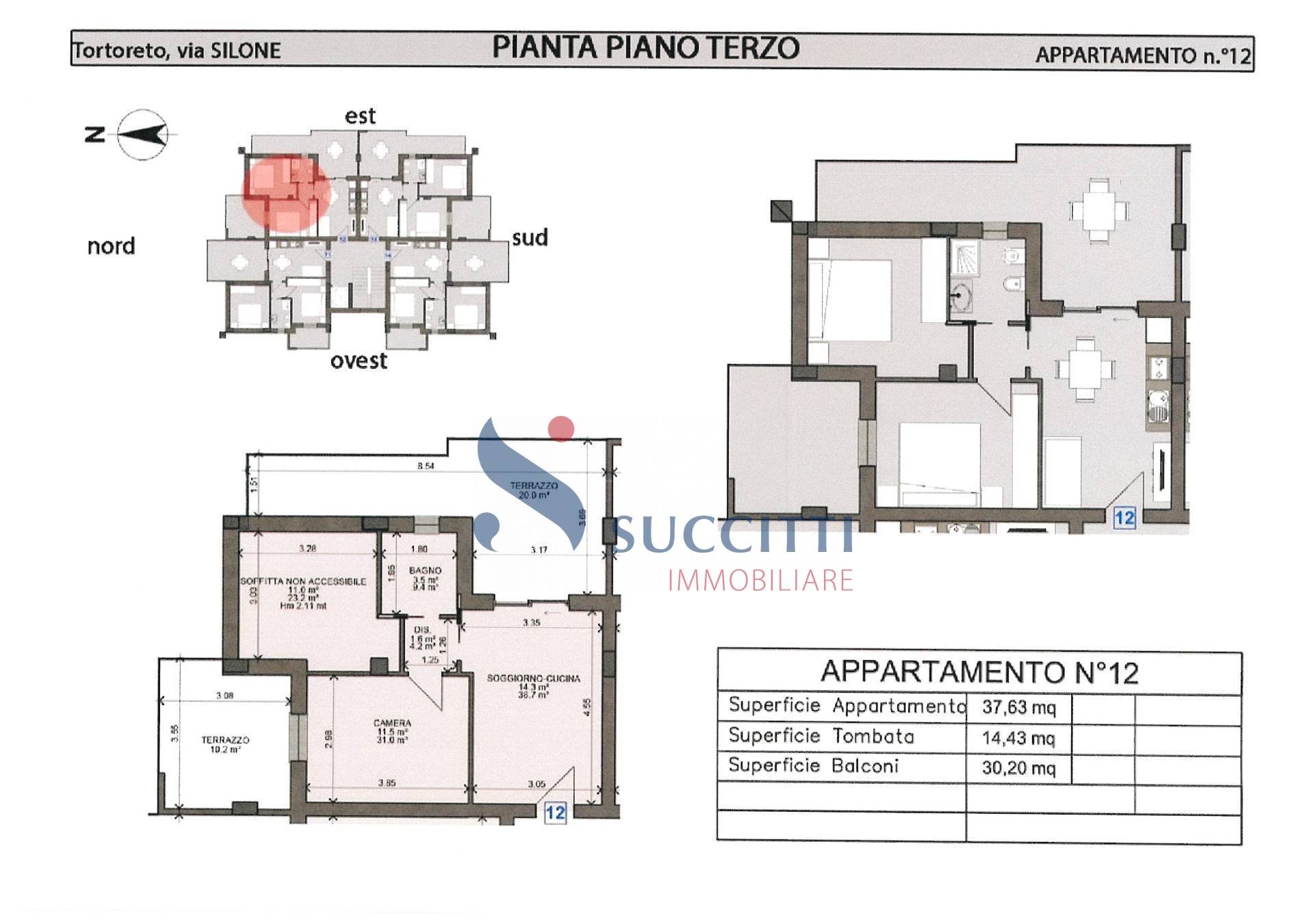 Questo annuncio dedicato all'appartamento con interno 12 al piano terzo, composto da soggiorno con angolo cottura e un terrazzo di circa 20 mq esposto ad est, una camera da letto matrimoniale con accesso ad un balcone esposto a nord di circa 10 mq, una camera doppia mansardata e un bagno finestrato.