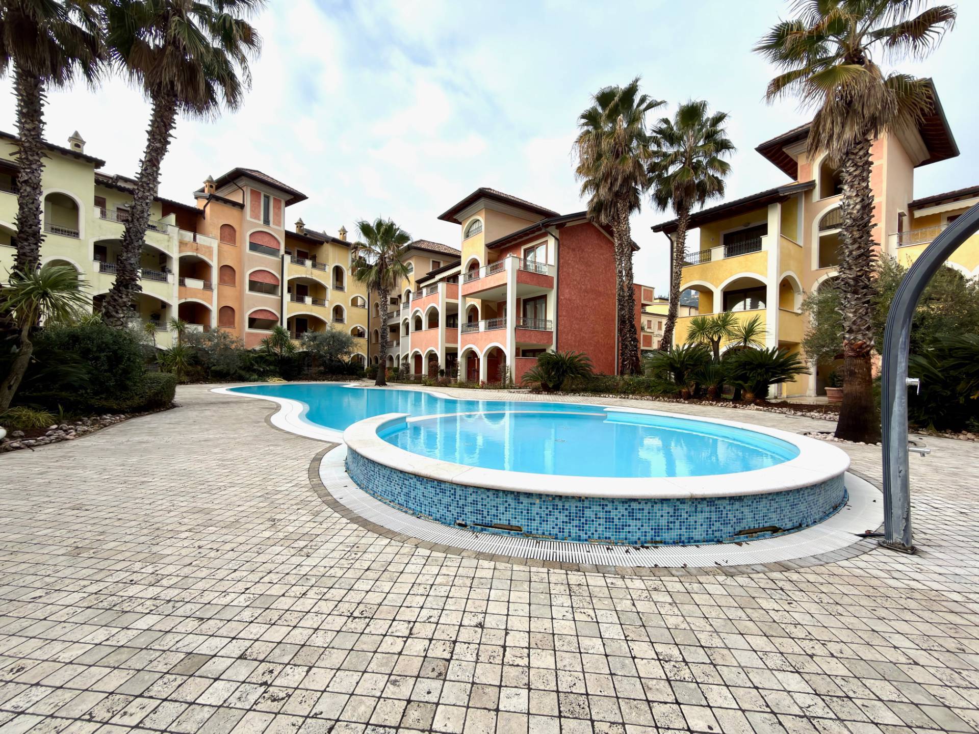 Ampia e graziosa la piscina, con forme tondeggianti e palme che richiamano le mete caraibiche.. . L'appartamento dotato di uno splendido giardino privato con ampio terrazzo vista piscina.