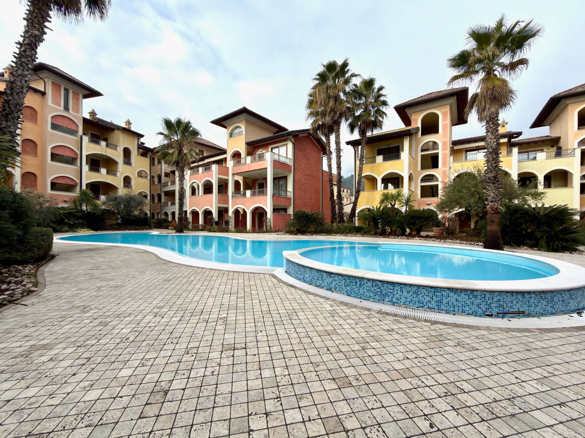 Il residence dotato di ampio spazio ornato da palme e dalla splendida piscina con forme esotiche.
