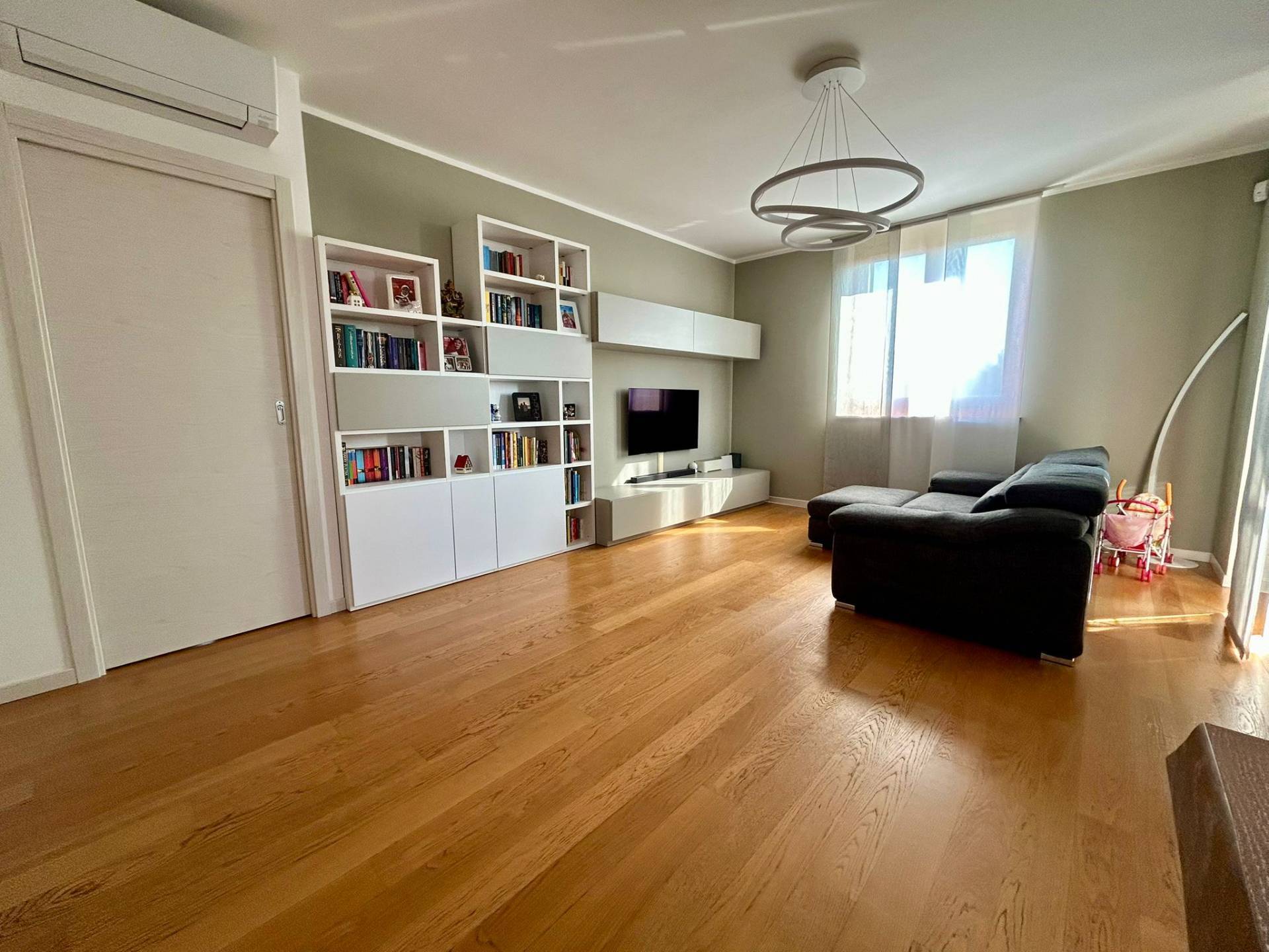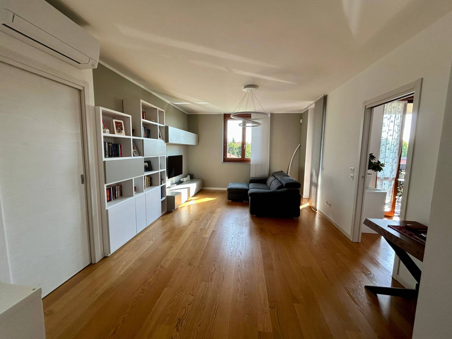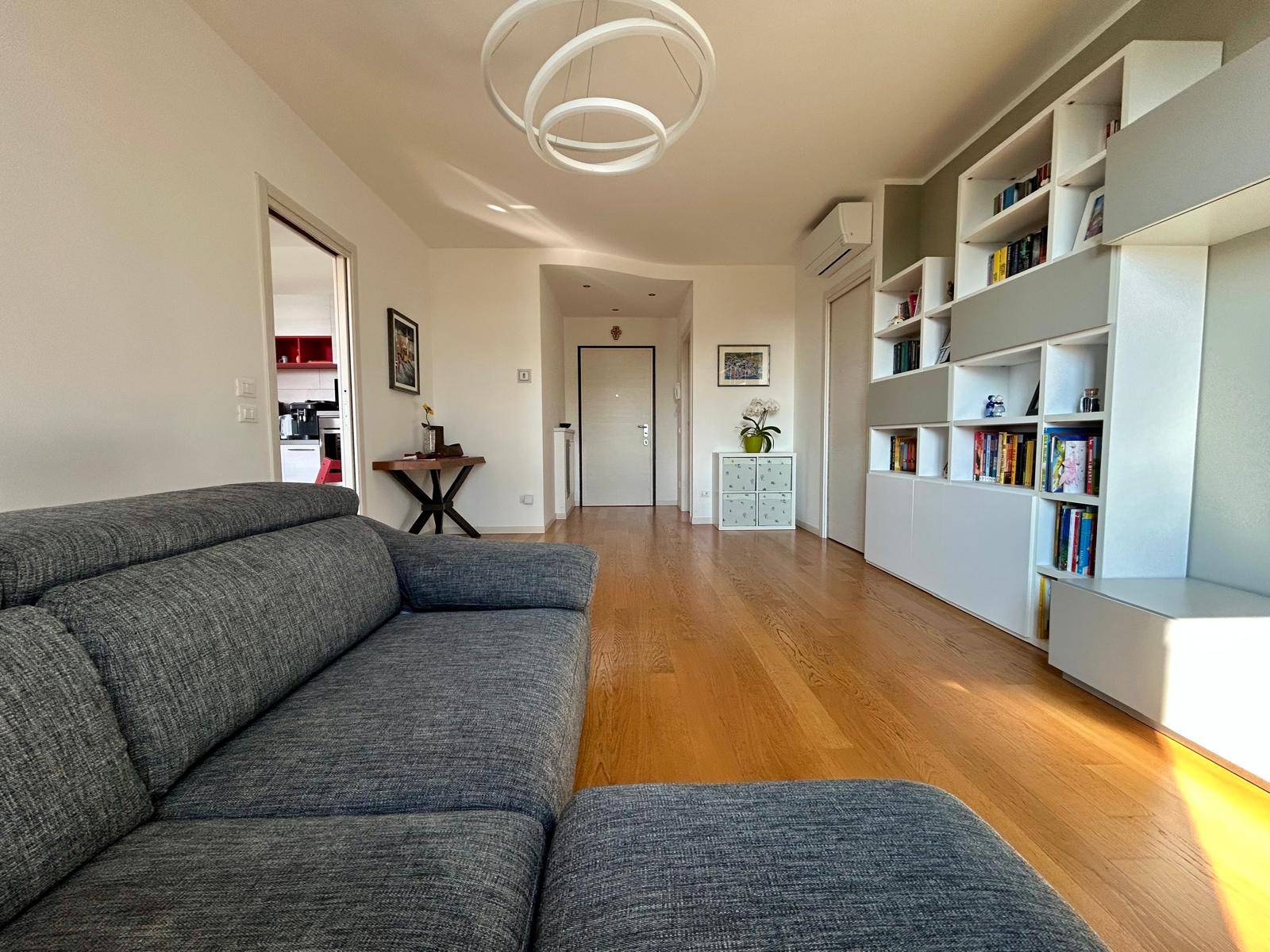 L' appartamento dotato di cappotto termico in facciata, riscaldamento a pavimento collegato a caldaia centralizzata con contabilizzatore personale, termostati ambiente in tutte le stanze, serramenti in legno con doppio vetro con persiane per le porte finestre in legno e per le finestre, parquet in tutta la casa e gres porcellanato nei bagni, zanzariere, impianto d'allarme perimetrale e volumetrico, impianto di climatizzazione in soggiorno e nelle due camere con gestione anche da remoto, impianto di pannelli solari per acqua calda sanitaria collegati alla caldaia centralizzata.