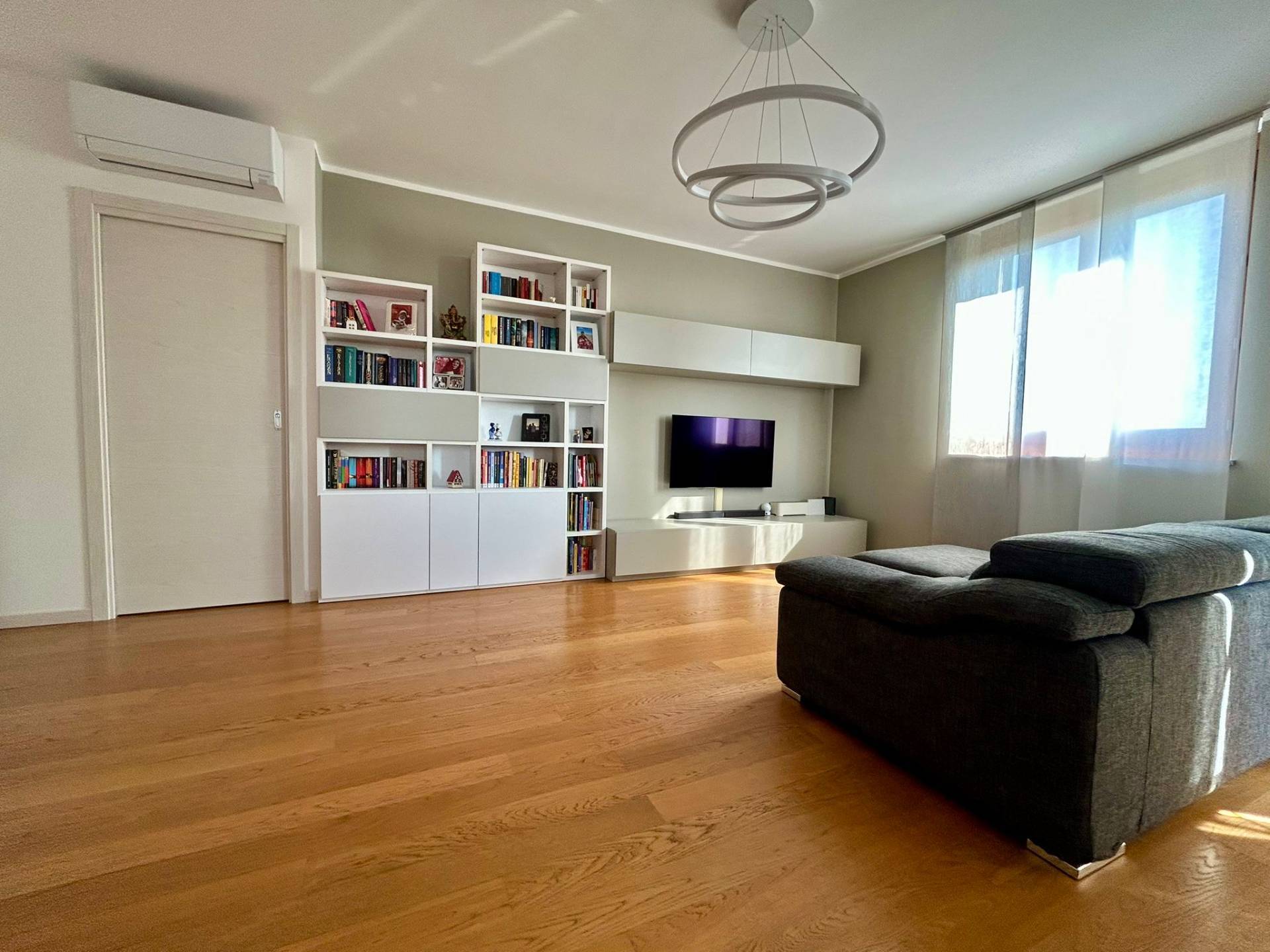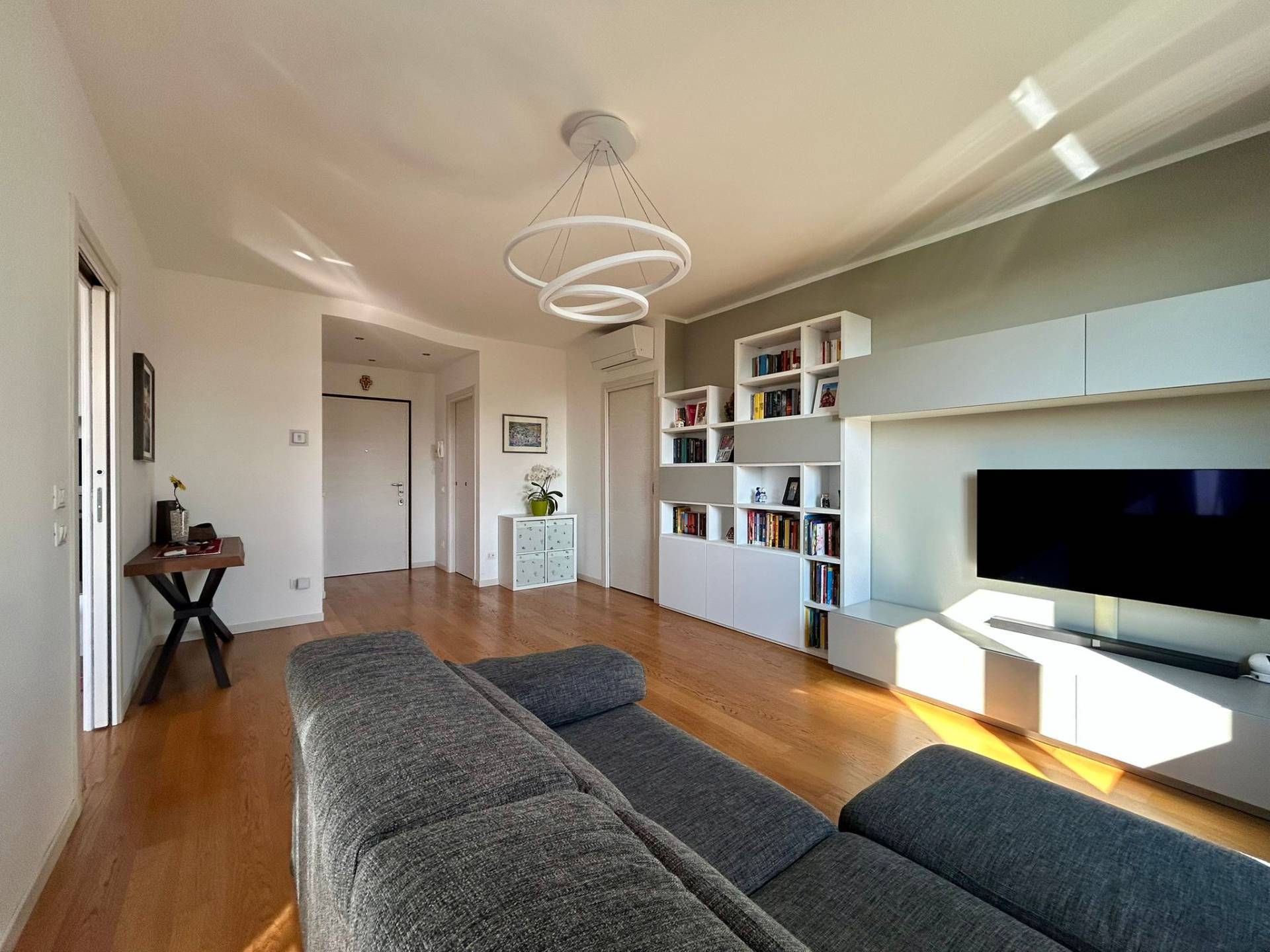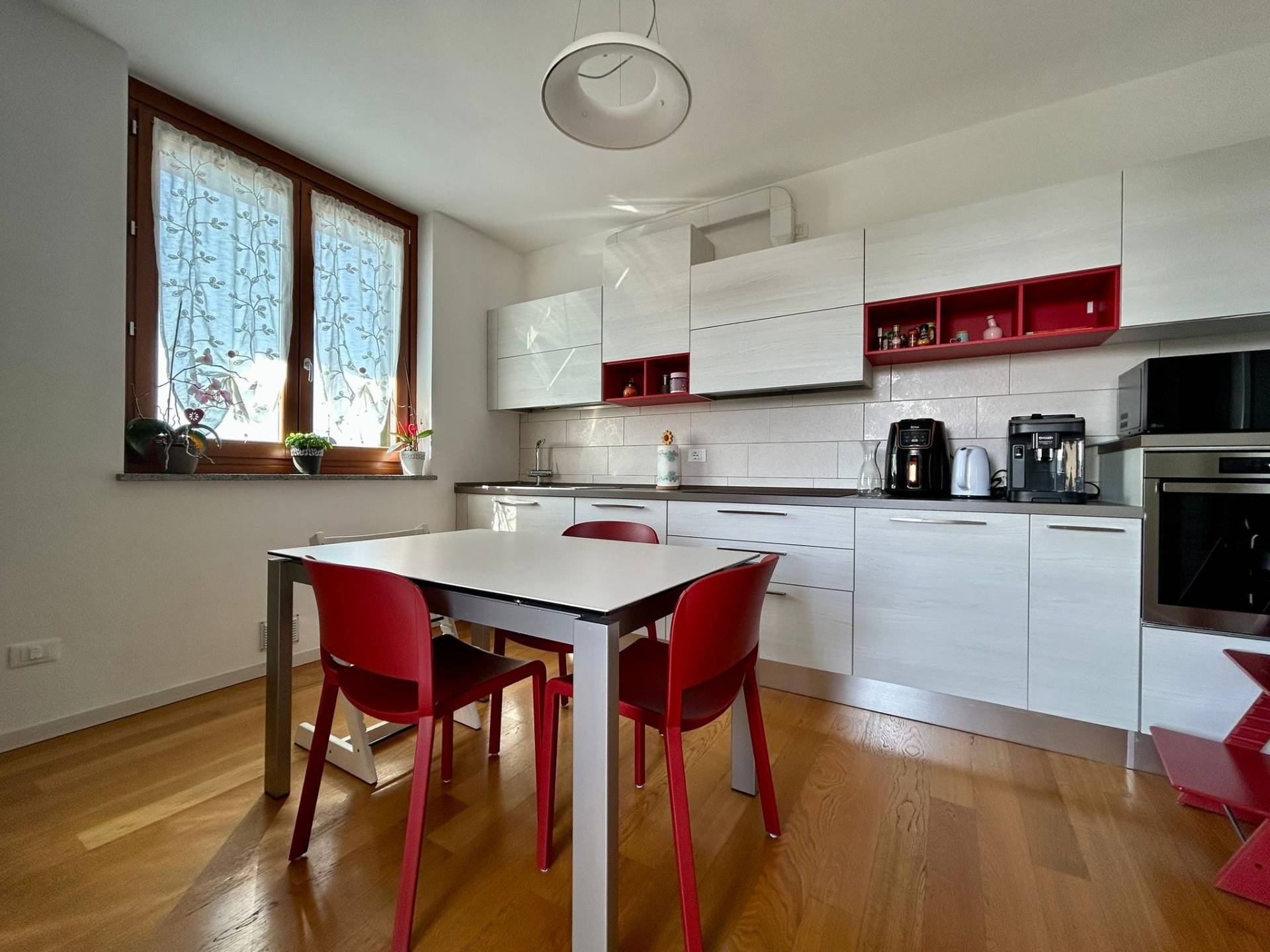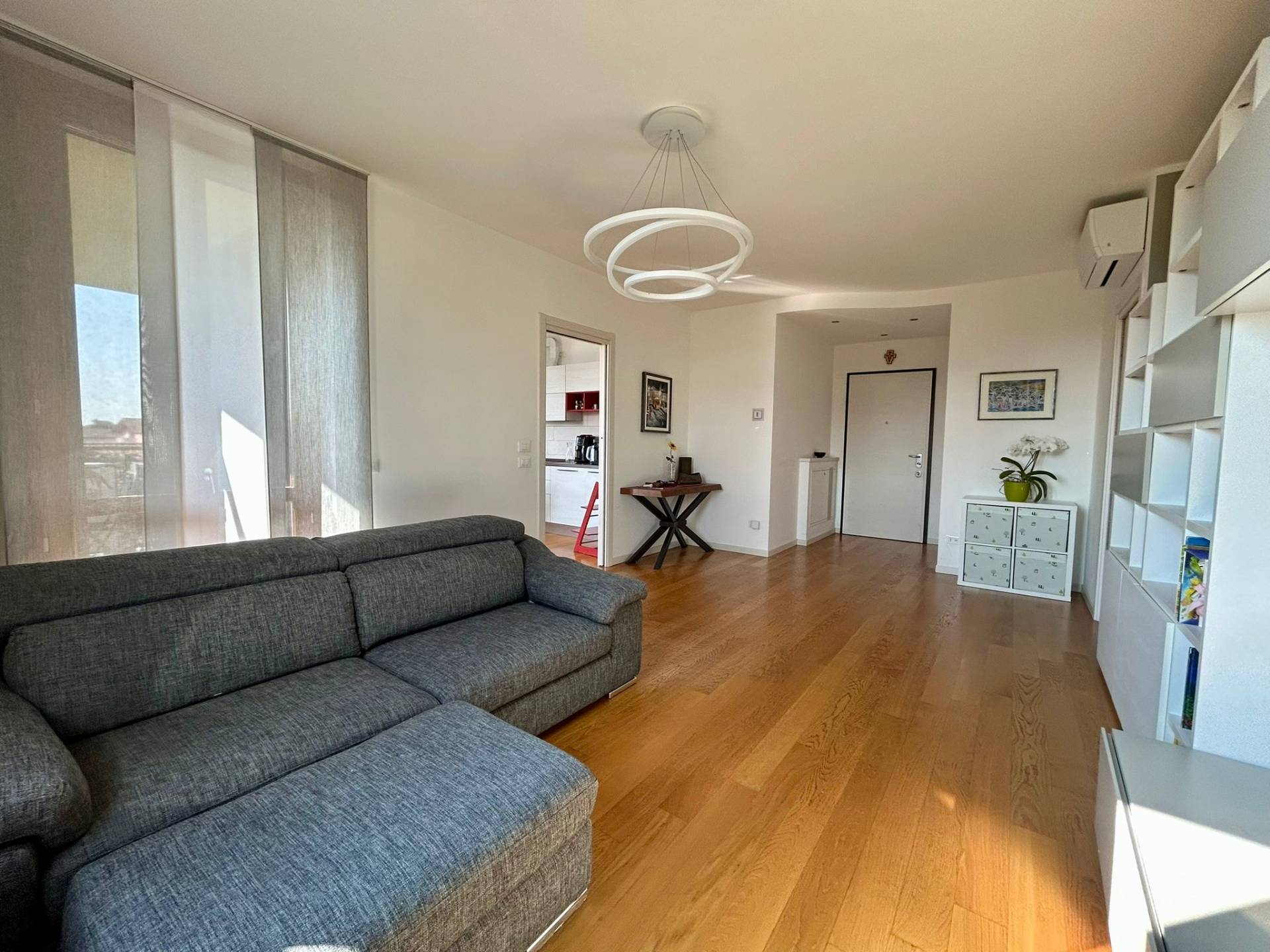 L' appartamento dotato di cappotto termico in facciata, riscaldamento a pavimento collegato a caldaia centralizzata con contabilizzatore personale, termostati ambiente in tutte le stanze, serramenti in legno con doppio vetro con persiane per le porte finestre in legno e per le finestre, parquet in tutta la casa e gres porcellanato nei bagni, zanzariere, impianto d'allarme perimetrale e volumetrico, impianto di climatizzazione in soggiorno e nelle due camere con gestione anche da remoto, impianto di pannelli solari per acqua calda sanitaria collegati alla caldaia centralizzata.