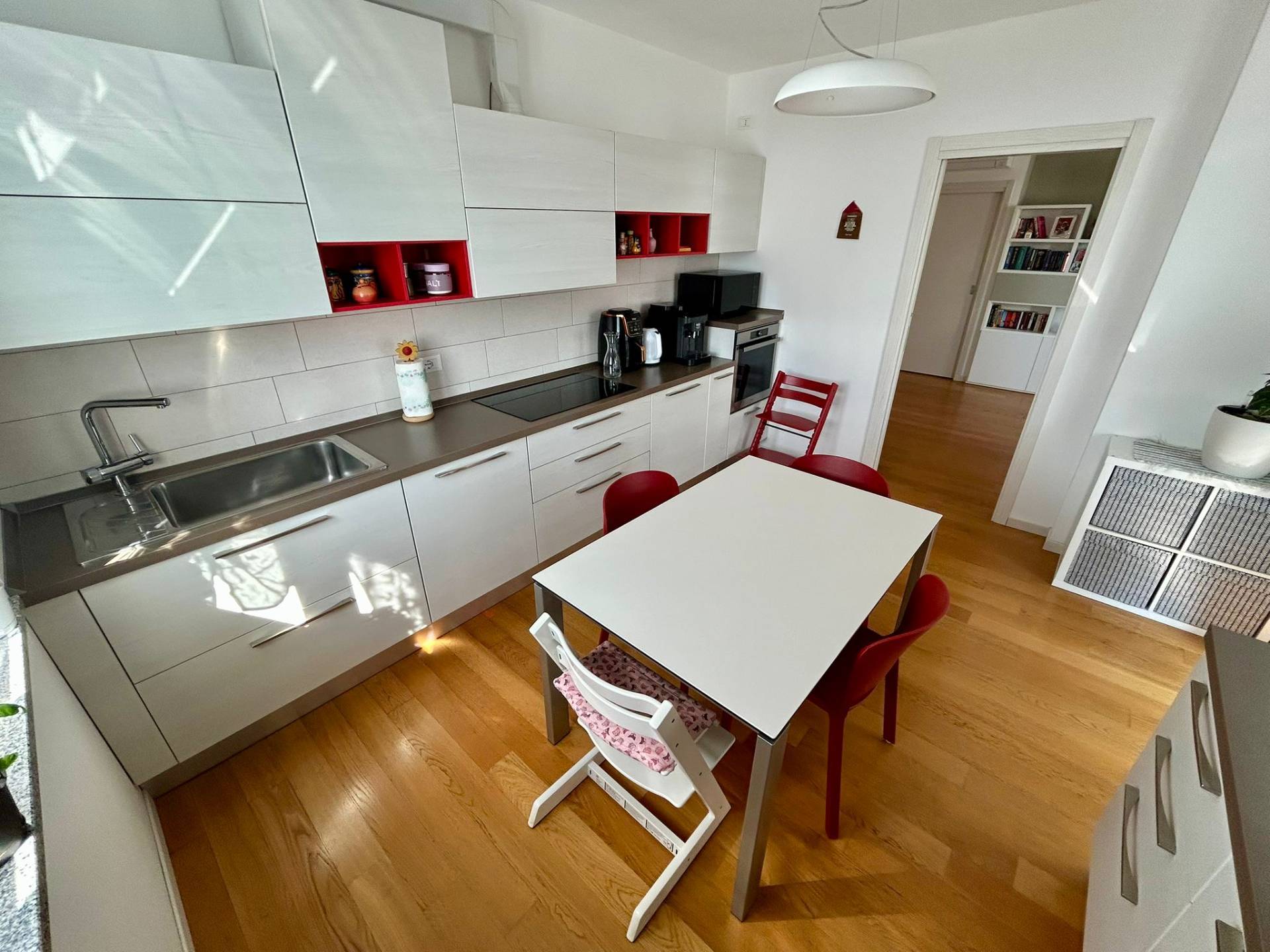Superando la porta blindata si accede alla zona giorno composta da soggiorno ed ampia cucina, dalle quali si accede al terrazzo coperto sul quale possibile posizionare un tavolo per poter pranzare e rilassarsi godendo di una vista libera da caseggiati e immobili.