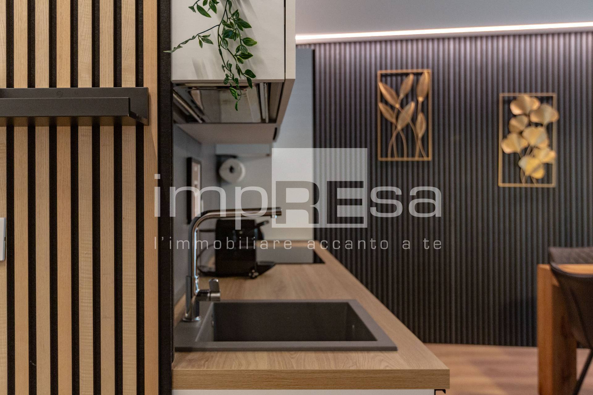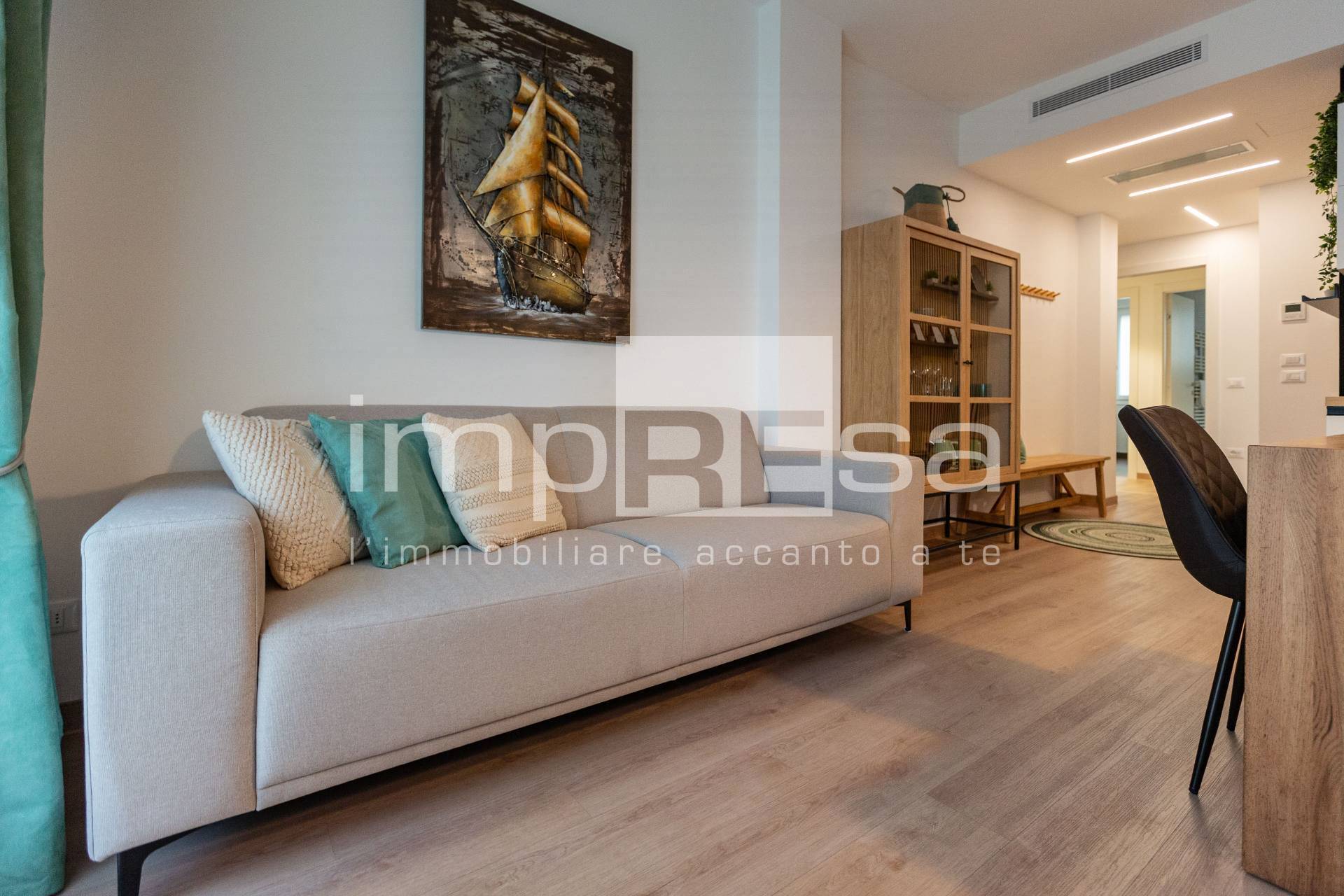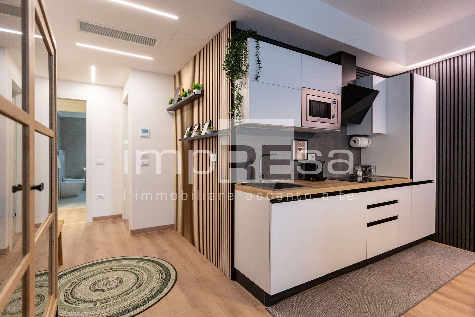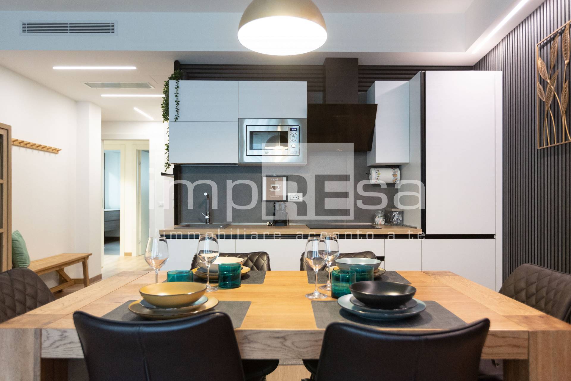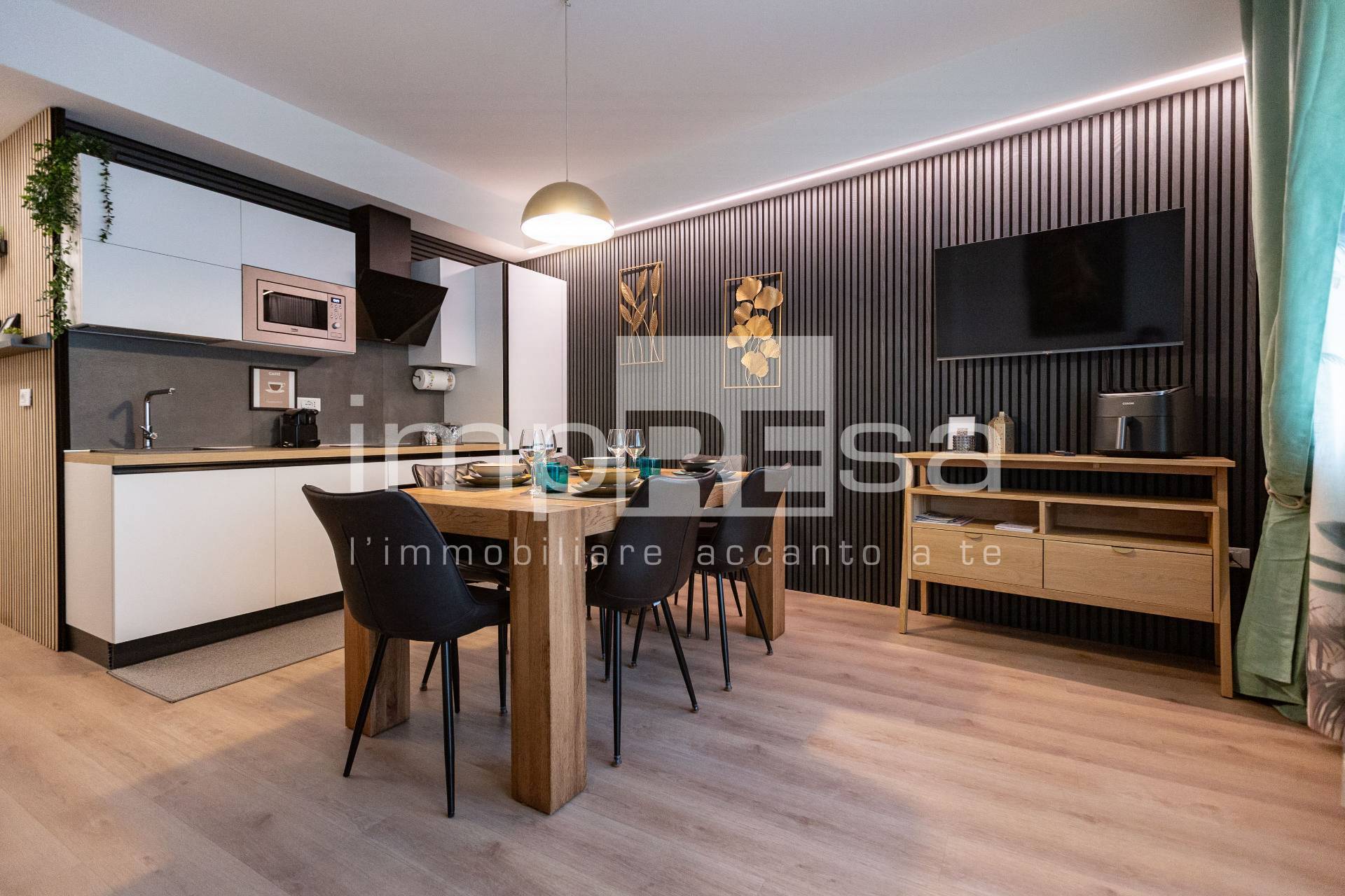 L'ampia zona giorno con cucina open space si affaccia sul terrazzino e si compone da cucina attrezzata di ogni comfort, piano cottura ad induzione, forno.