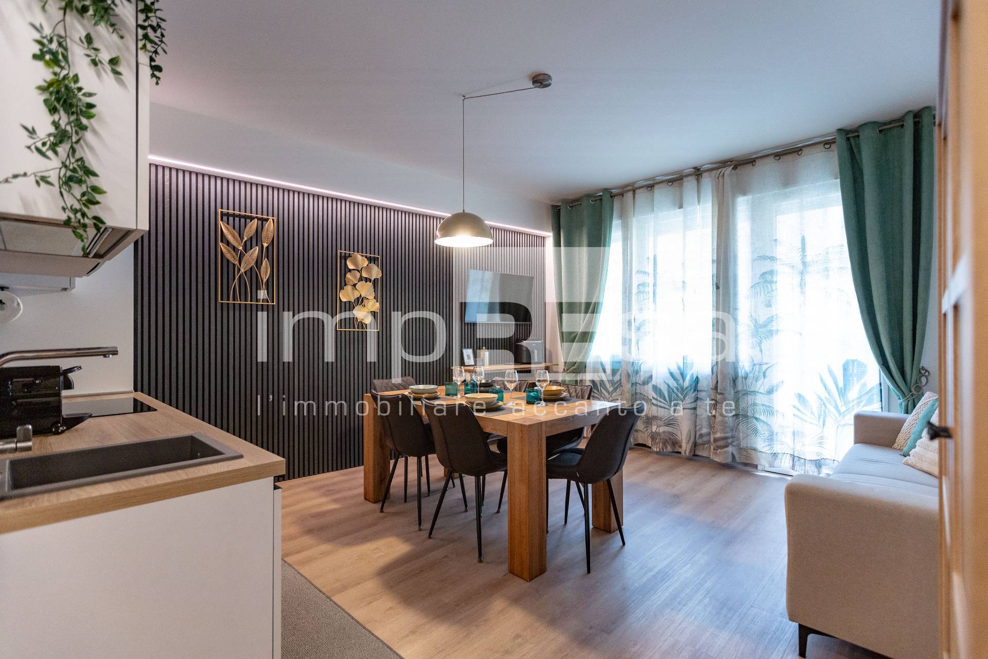 L'immobile stato completamente ristrutturato nel 2024. Carta da parati alle pareti delle camere da letto, parquet, tende, armadiature, poltrone, tappeti, illuminazione e complementi di arredo.