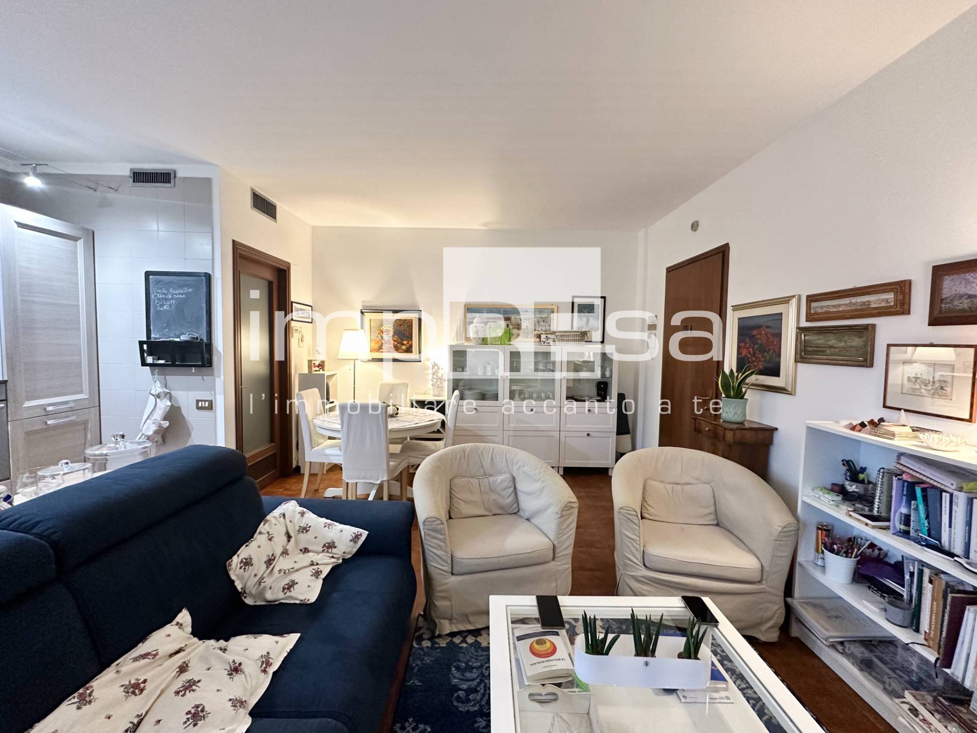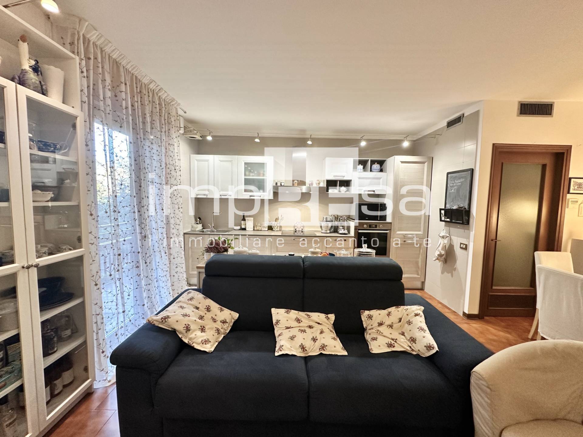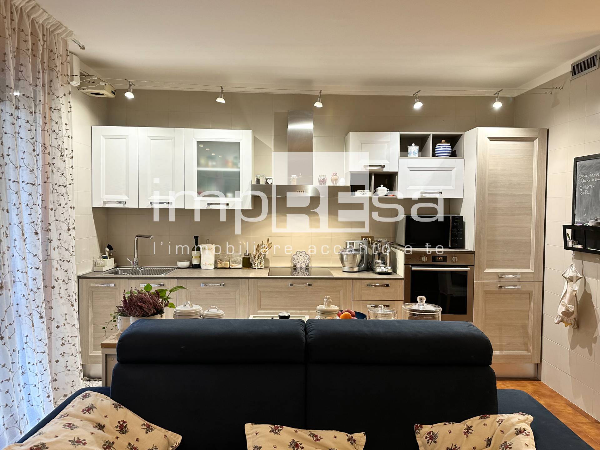 L'immobile di mq. 60 circa, composto da ingresso, ampio salotto con cucina a vista e angolo pranzo con affaccio su terrazziono a Nord con tenda parasole esterna, lungo corrdoio completo di armadiatura a muro, bagno con vasca e camera matrimoniale.