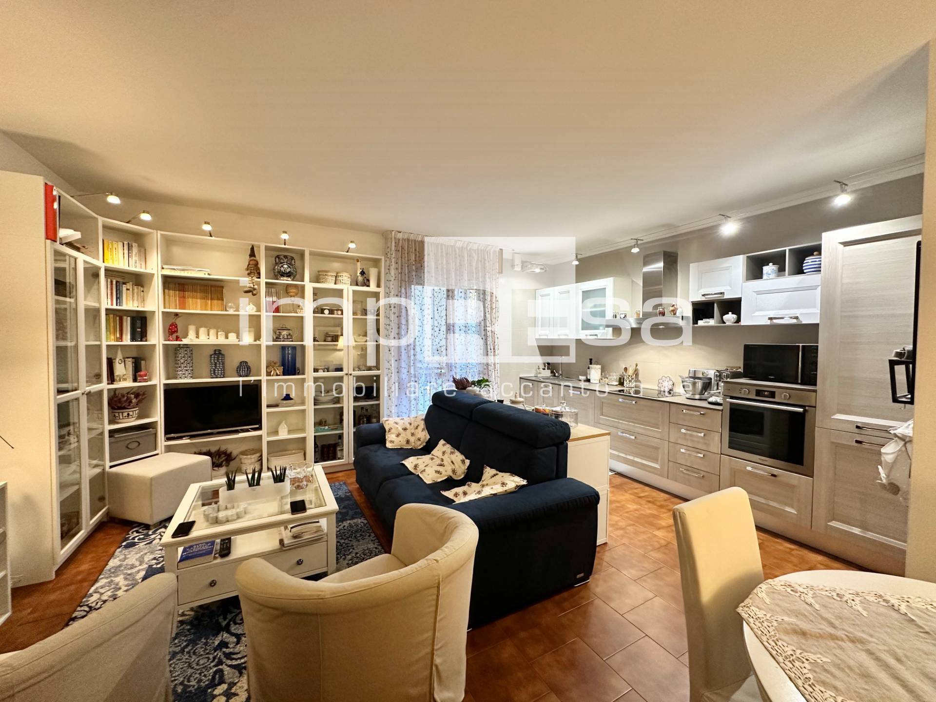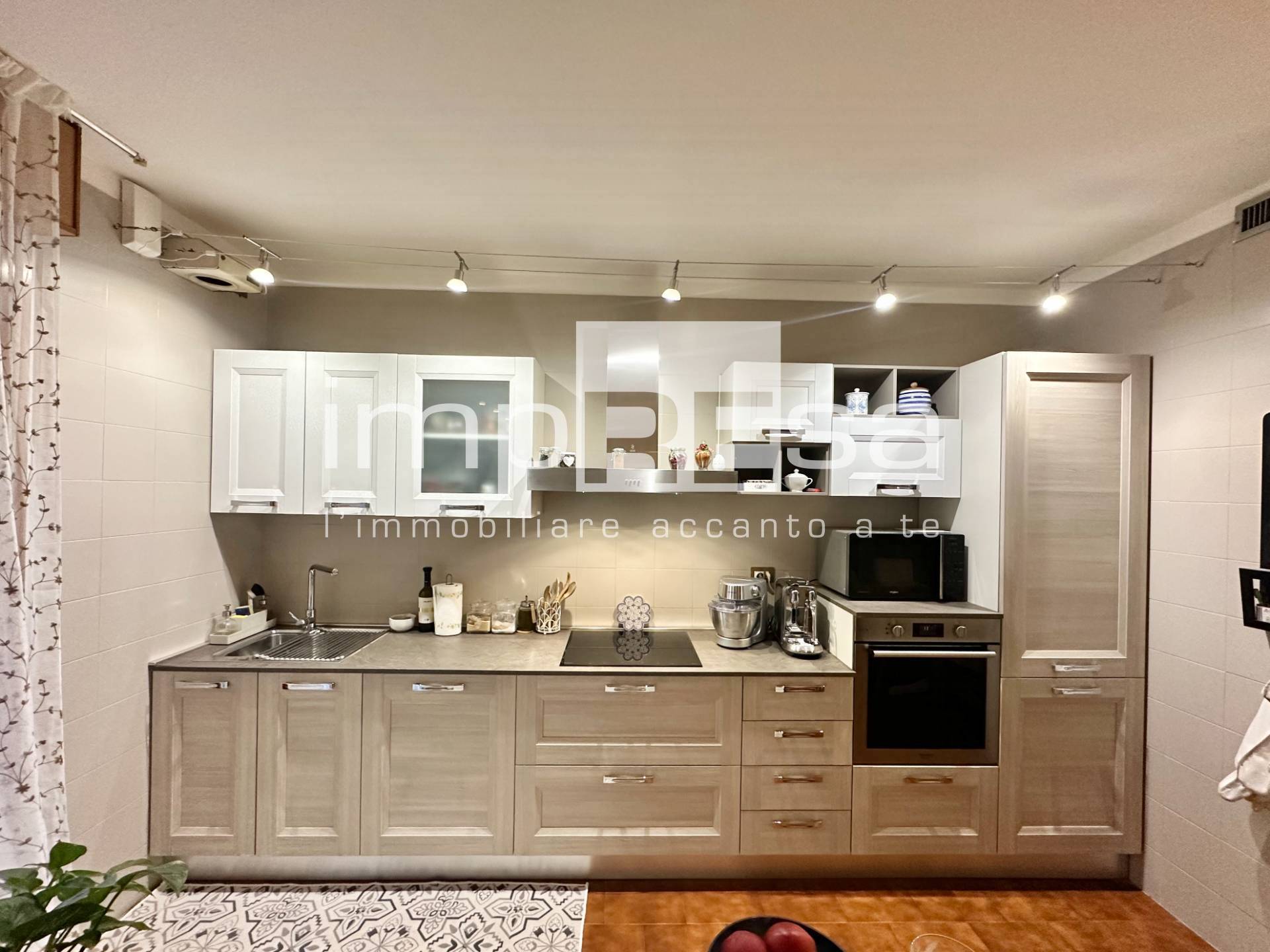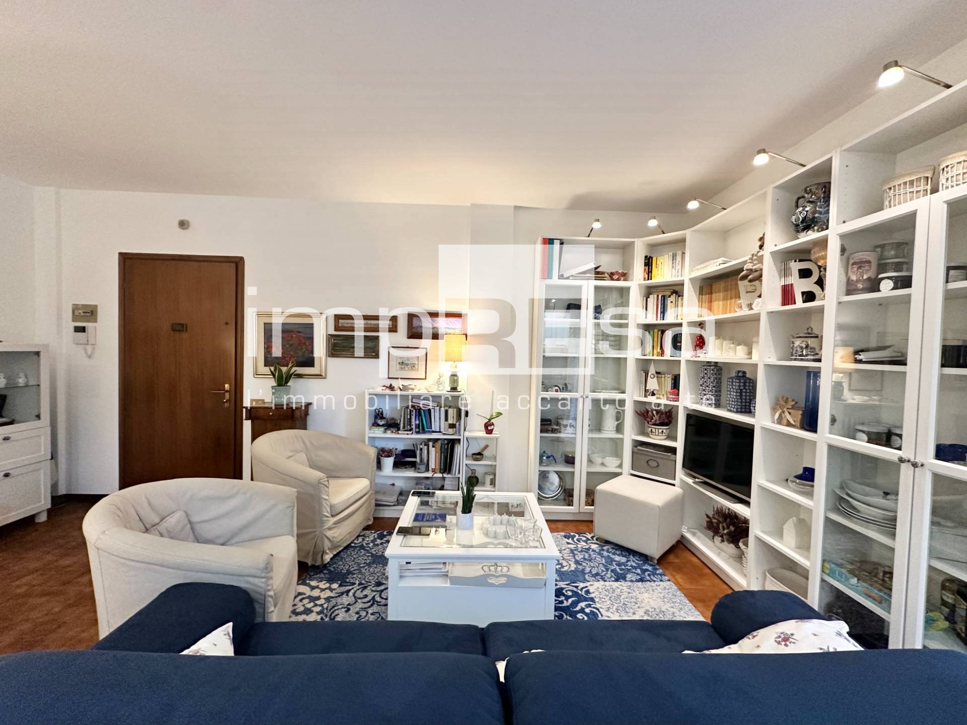 L'immobile di mq. 60 circa, composto da ingresso, ampio salotto con cucina a vista e angolo pranzo con affaccio su terrazziono a Nord con tenda parasole esterna, lungo corrdoio completo di armadiatura a muro, bagno con vasca e camera matrimoniale.