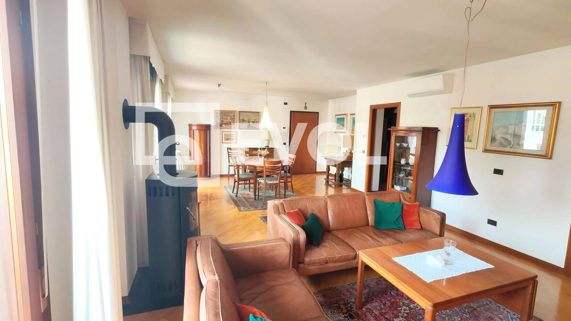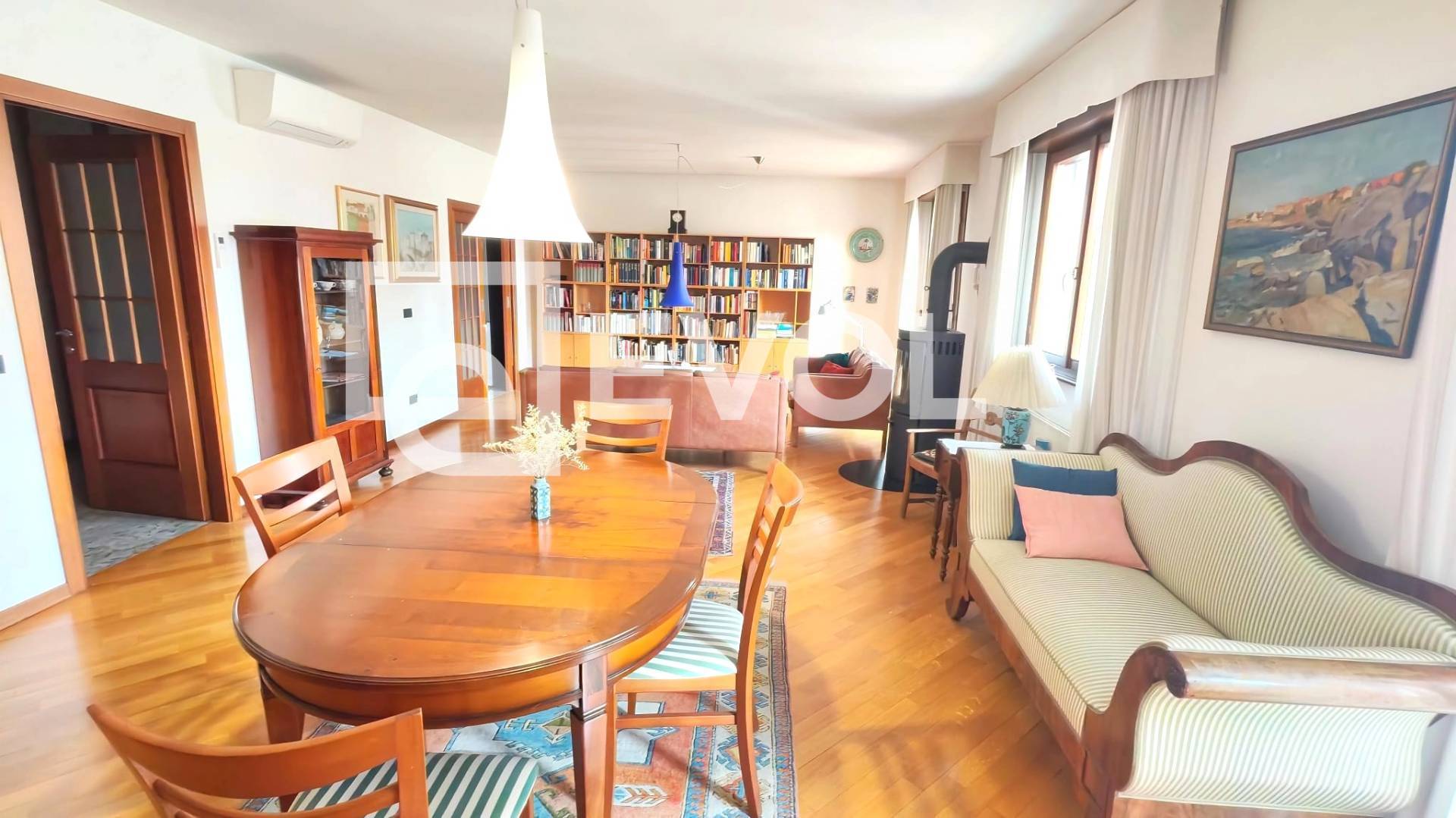 Lingresso si apre su un ampio e luminoso soggiorno, con due porte finestre e una finestra, valorizzato da una stufa e da una splendida terrazza che si sviluppa per tutta la lunghezza della zona living.