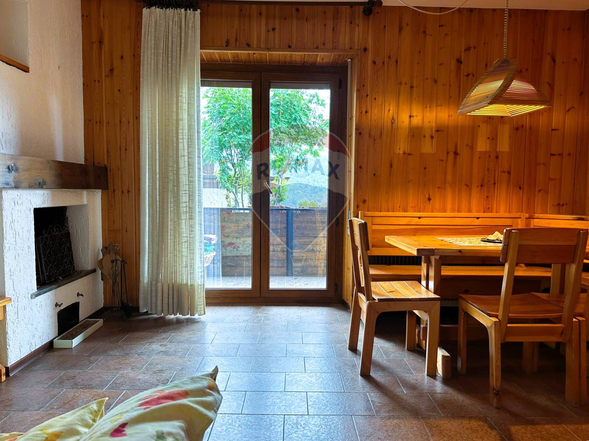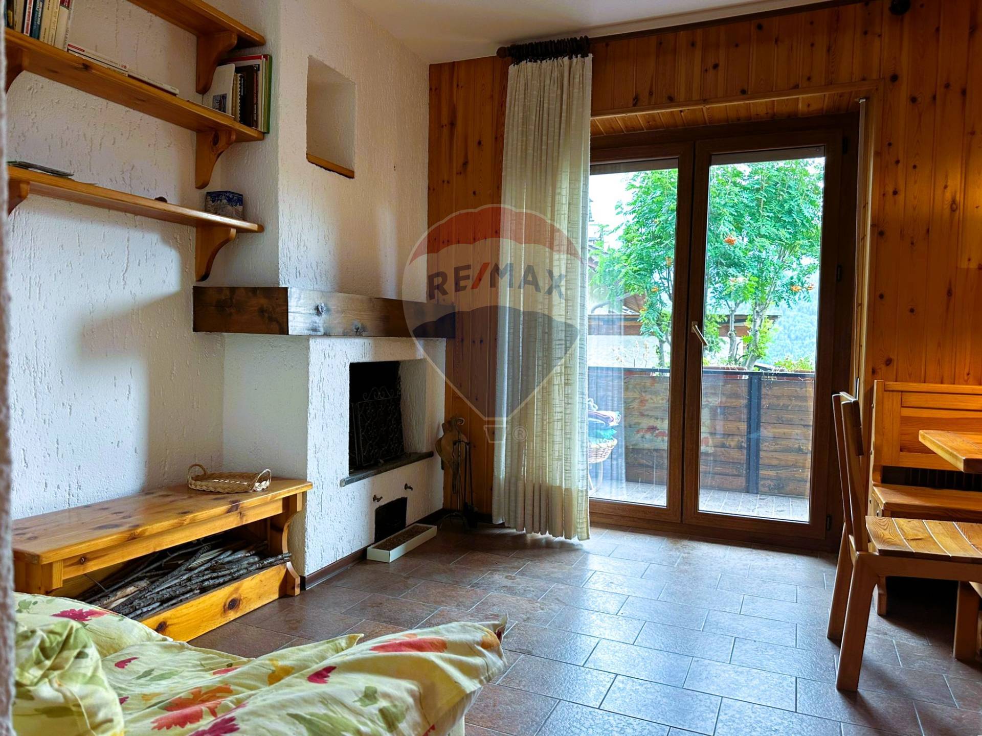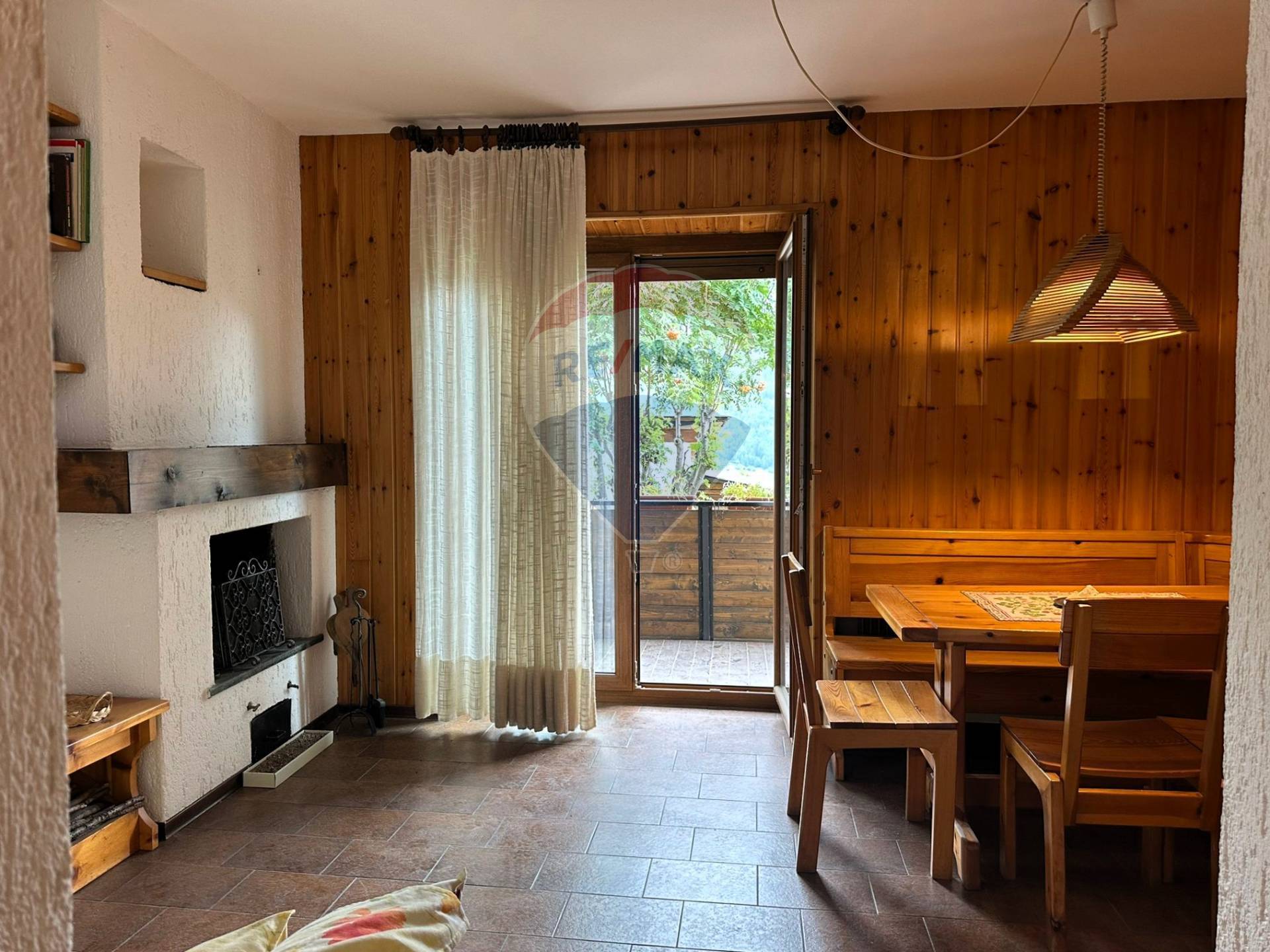 La zona living resa accogliente dalla presenza di un camino e dall'accesso al balcone che si affaccia sulle montagne di casa. Qui troviamo anche l'angolo cottura e la zona pranzo comoda e funzionale e un bagno con doccia.