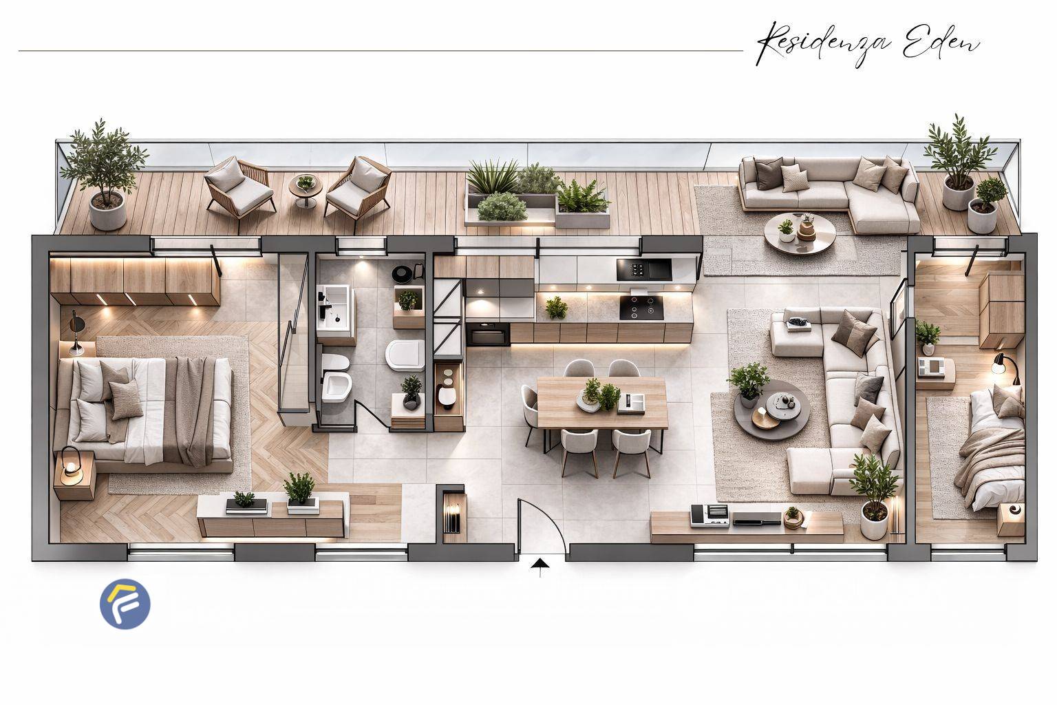 Le unit si compongono di ingresso su luminoso soggiorno con cucina a vista e accesso diretto al terrazzo, cameretta, camera da letto padronale e servizi.