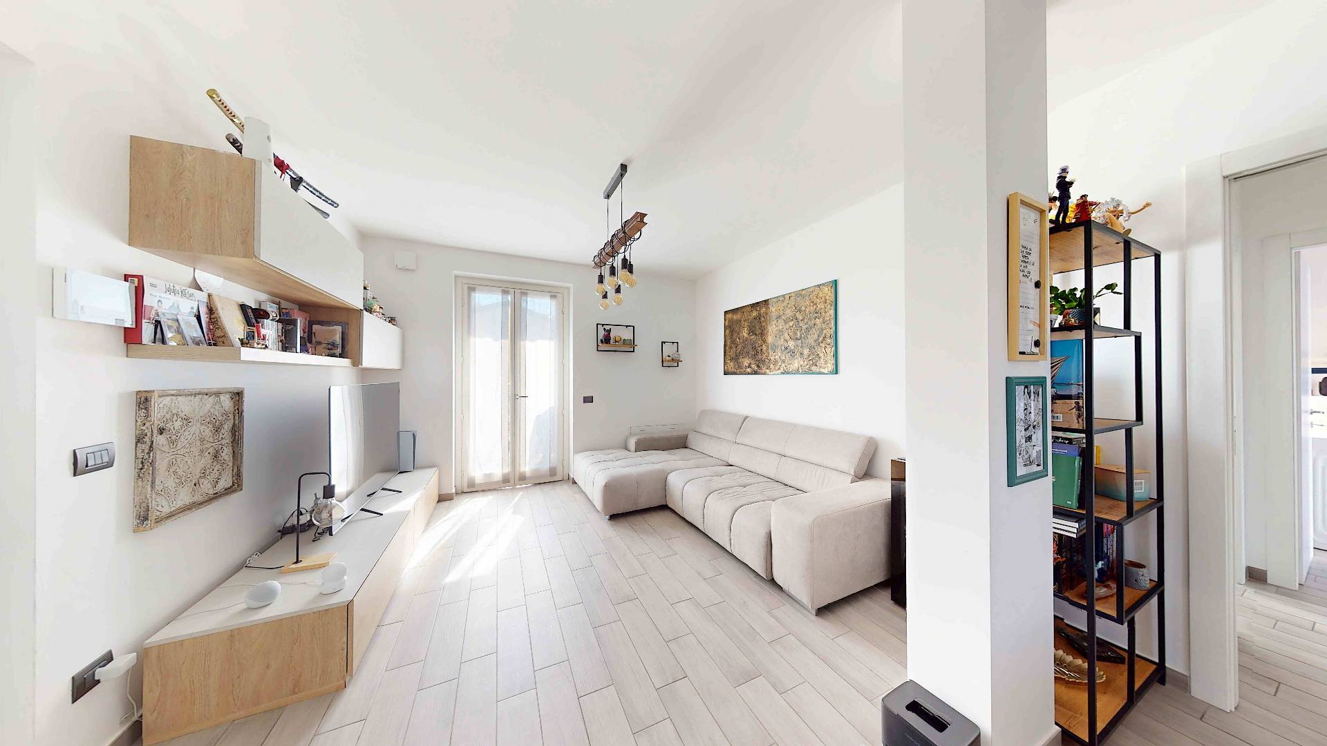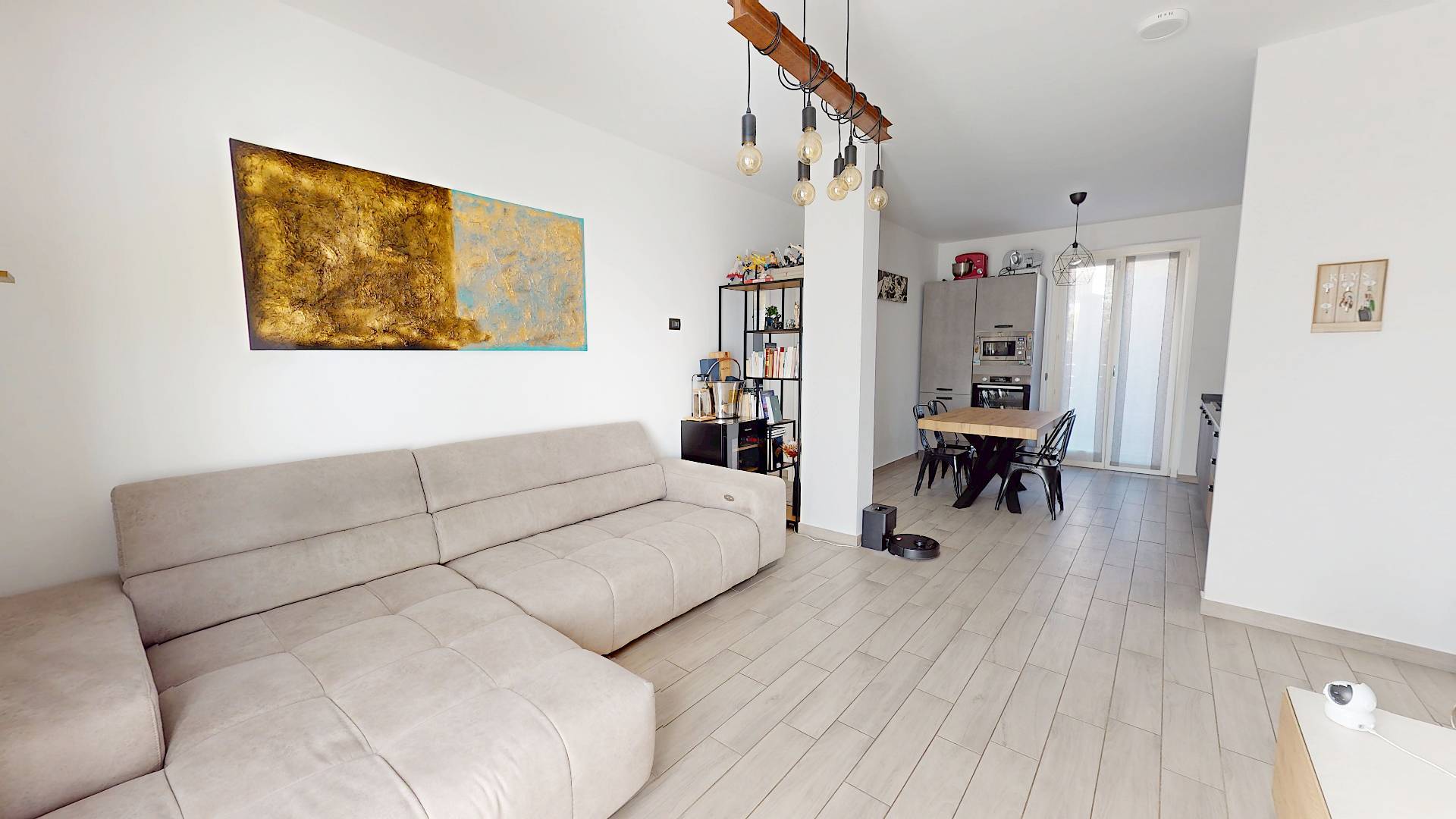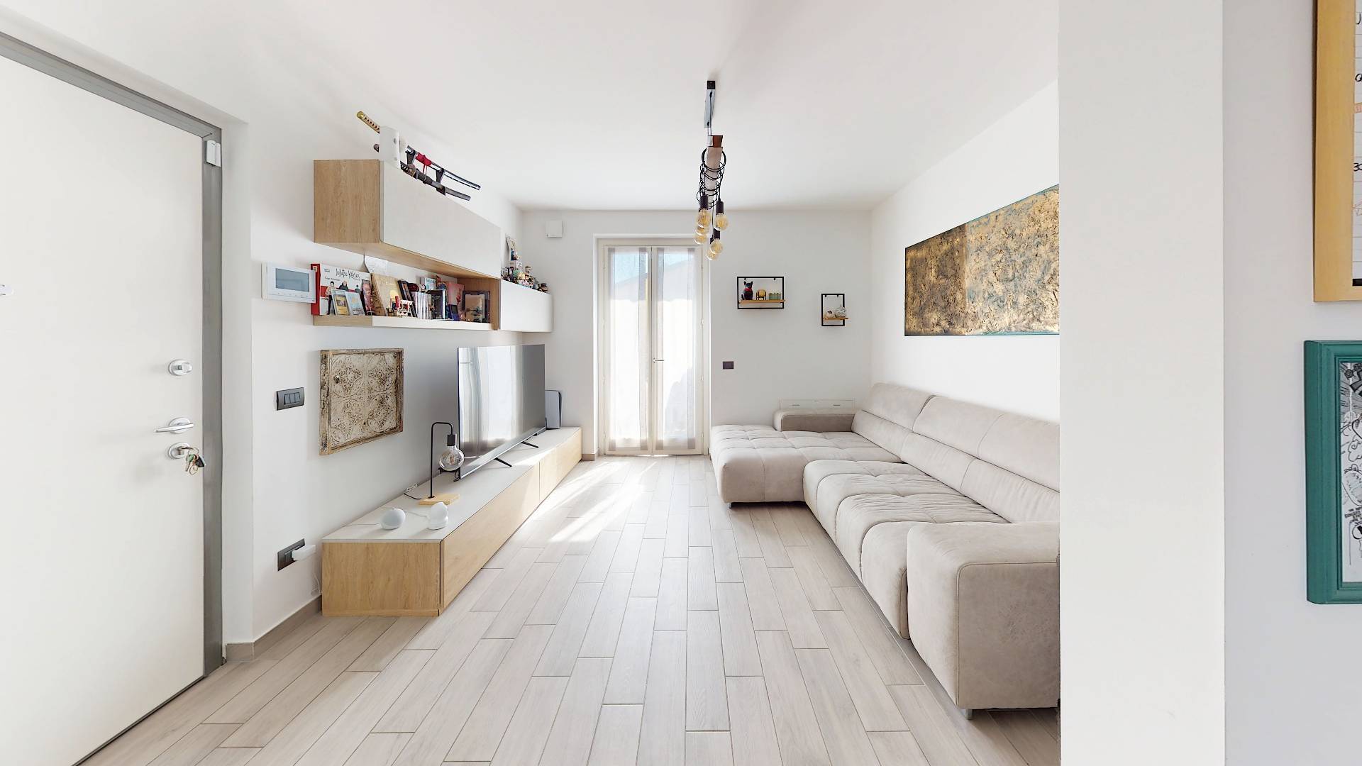 La casa intelligentemente suddivisa, la porta blindata si apre su un MODERNO LIVING OPEN SPACE con soggiorno e cucina a vista.