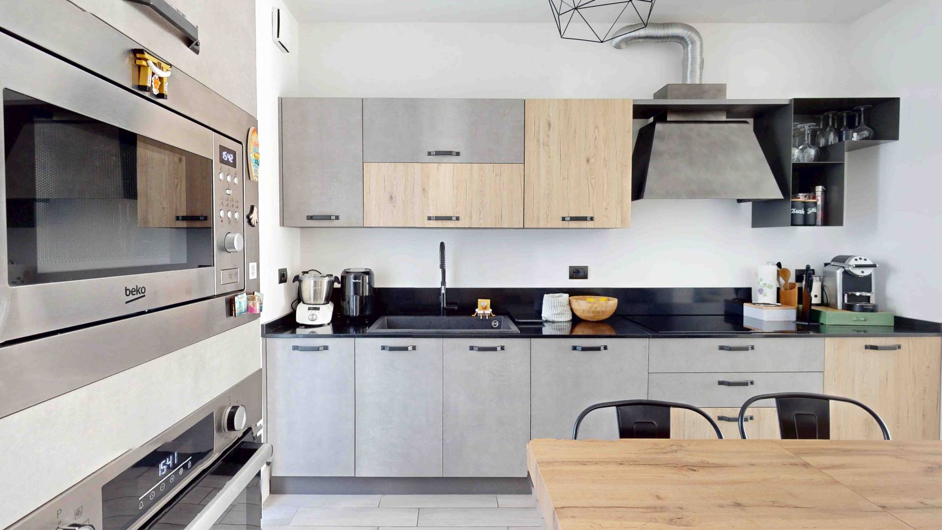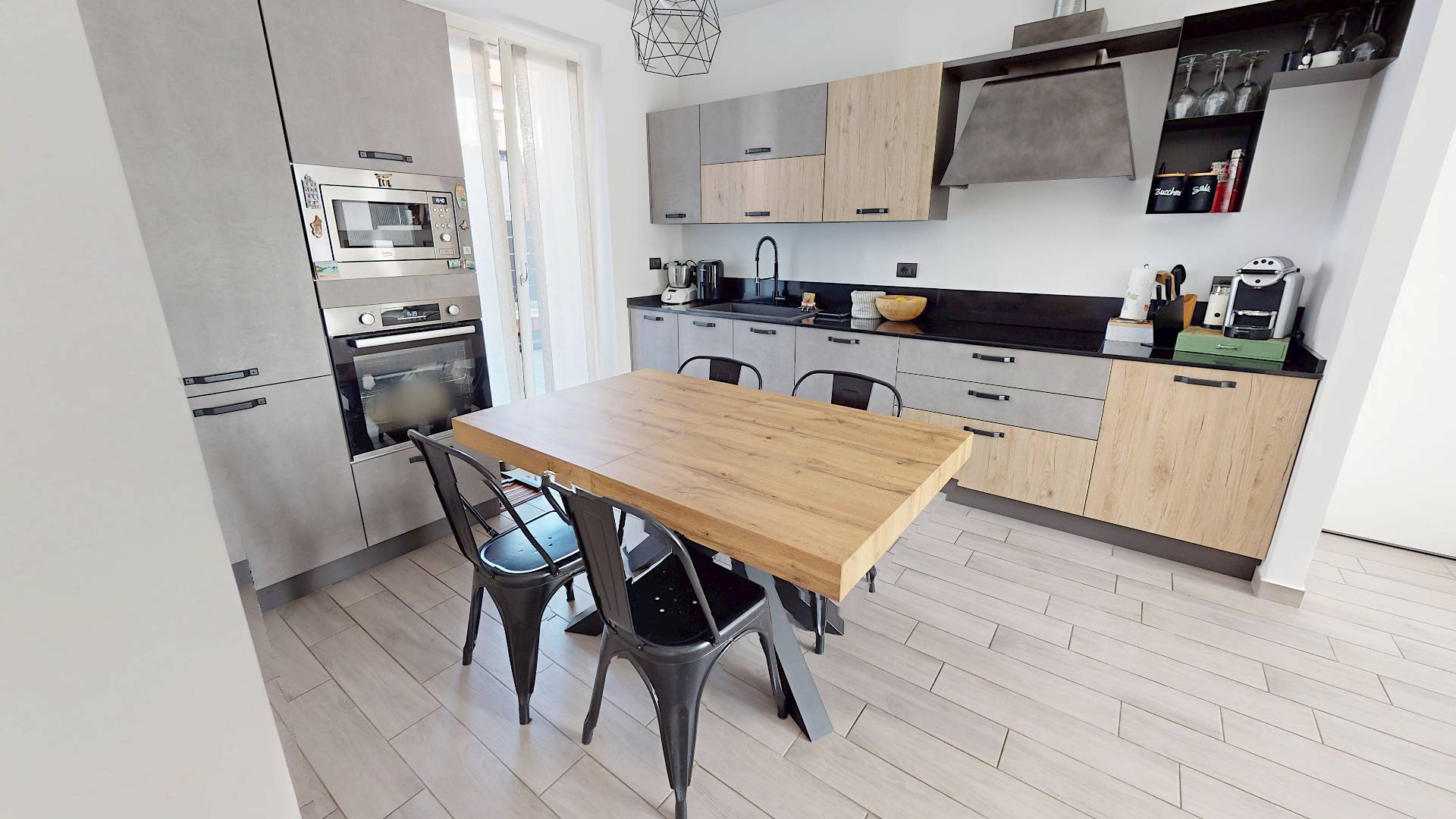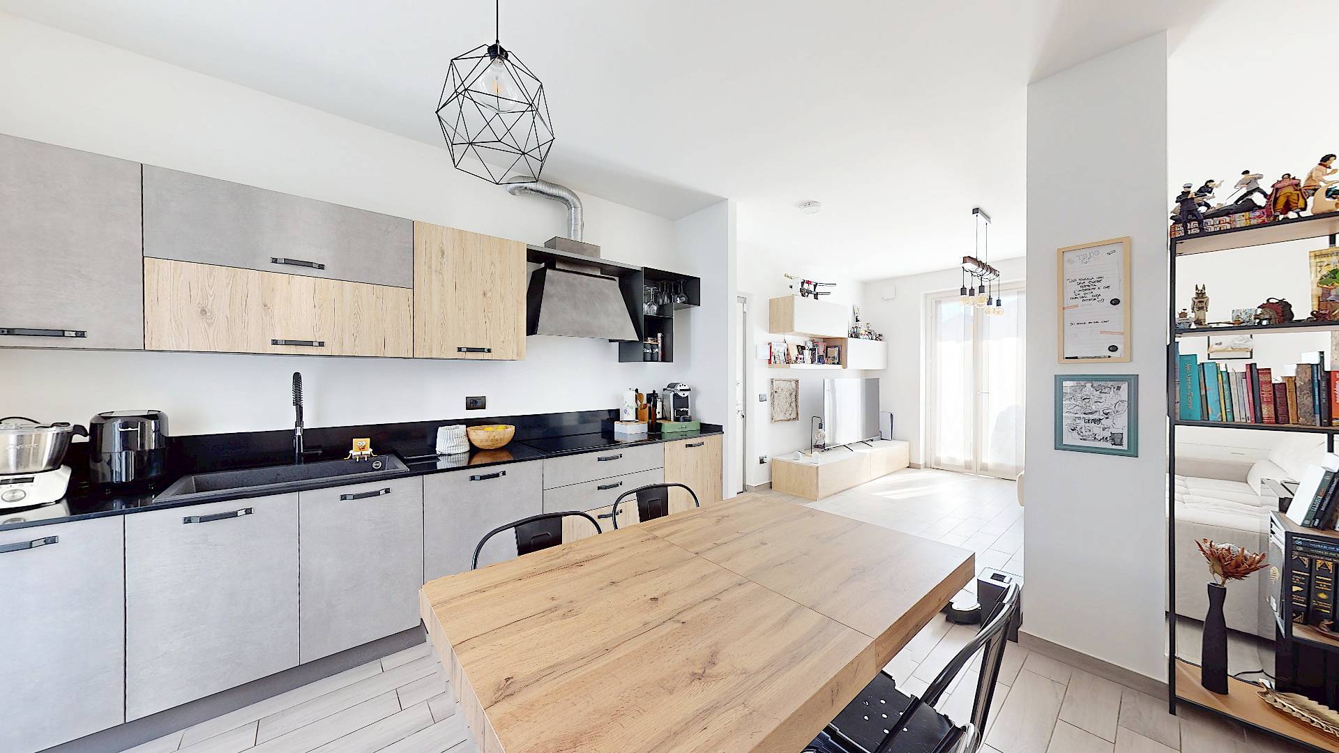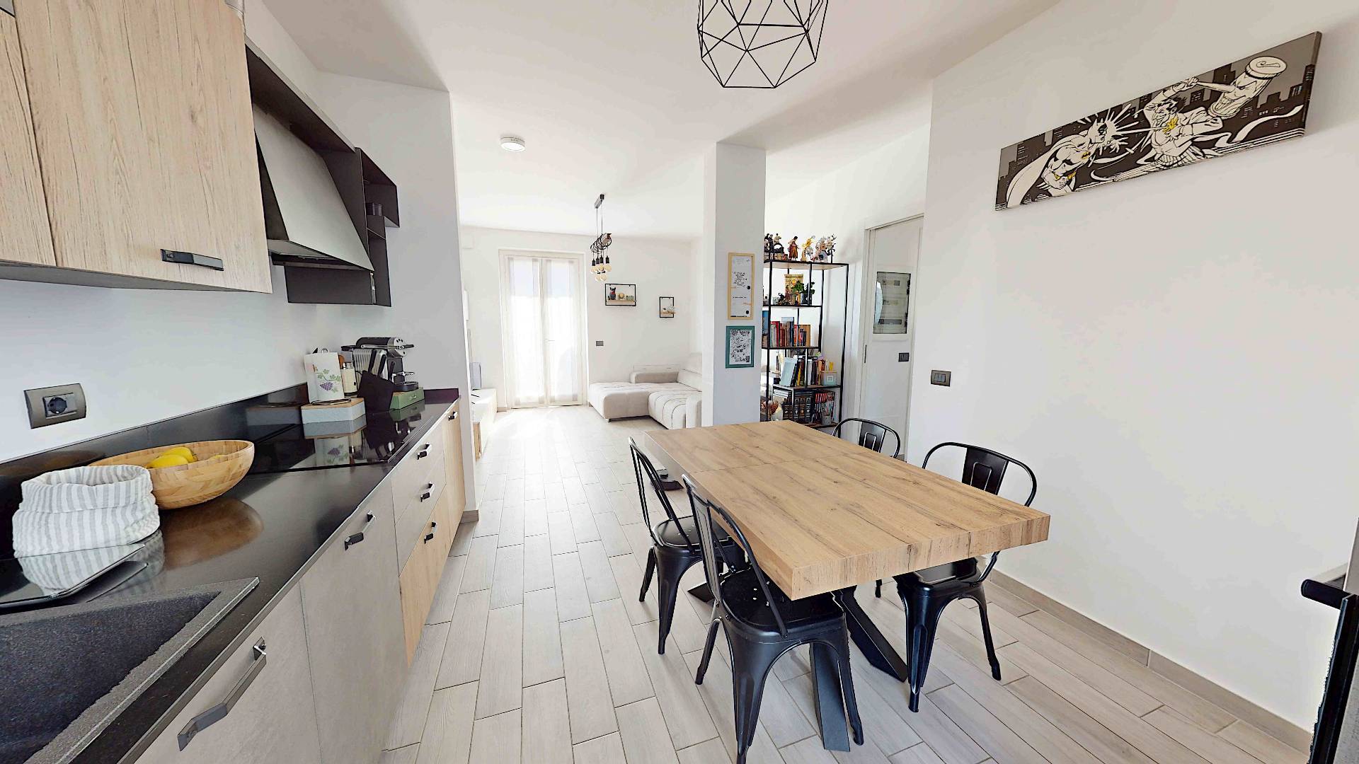 La casa intelligentemente suddivisa, la porta blindata si apre su un MODERNO LIVING OPEN SPACE con soggiorno e cucina a vista.