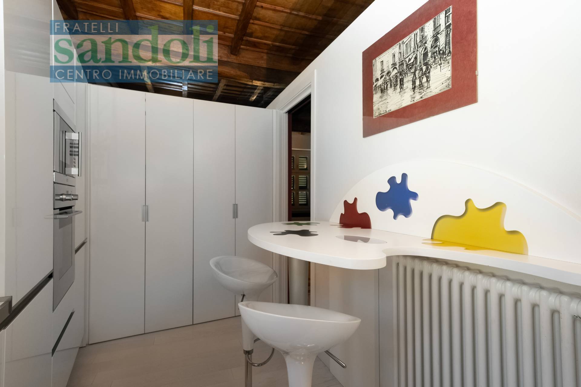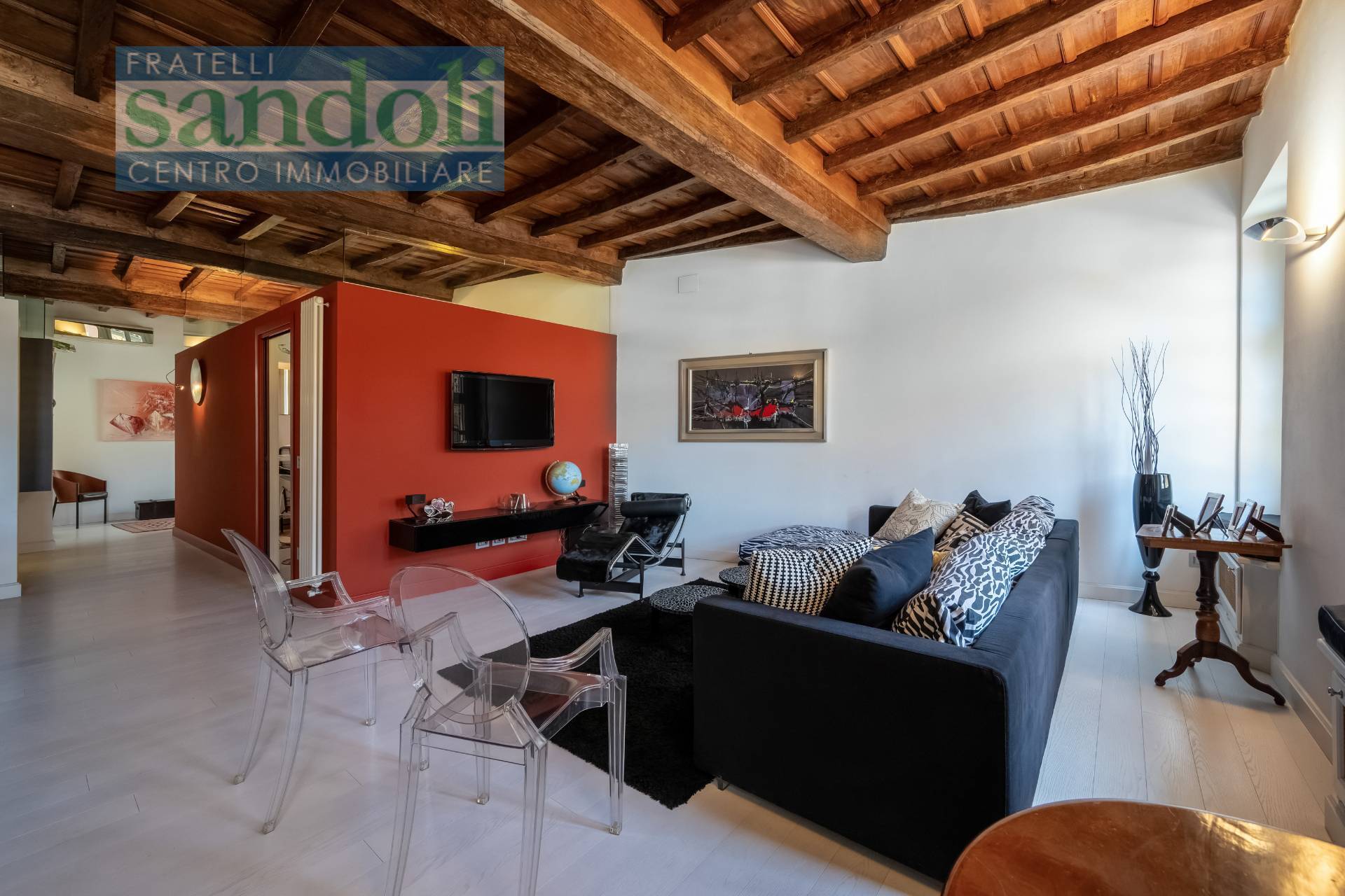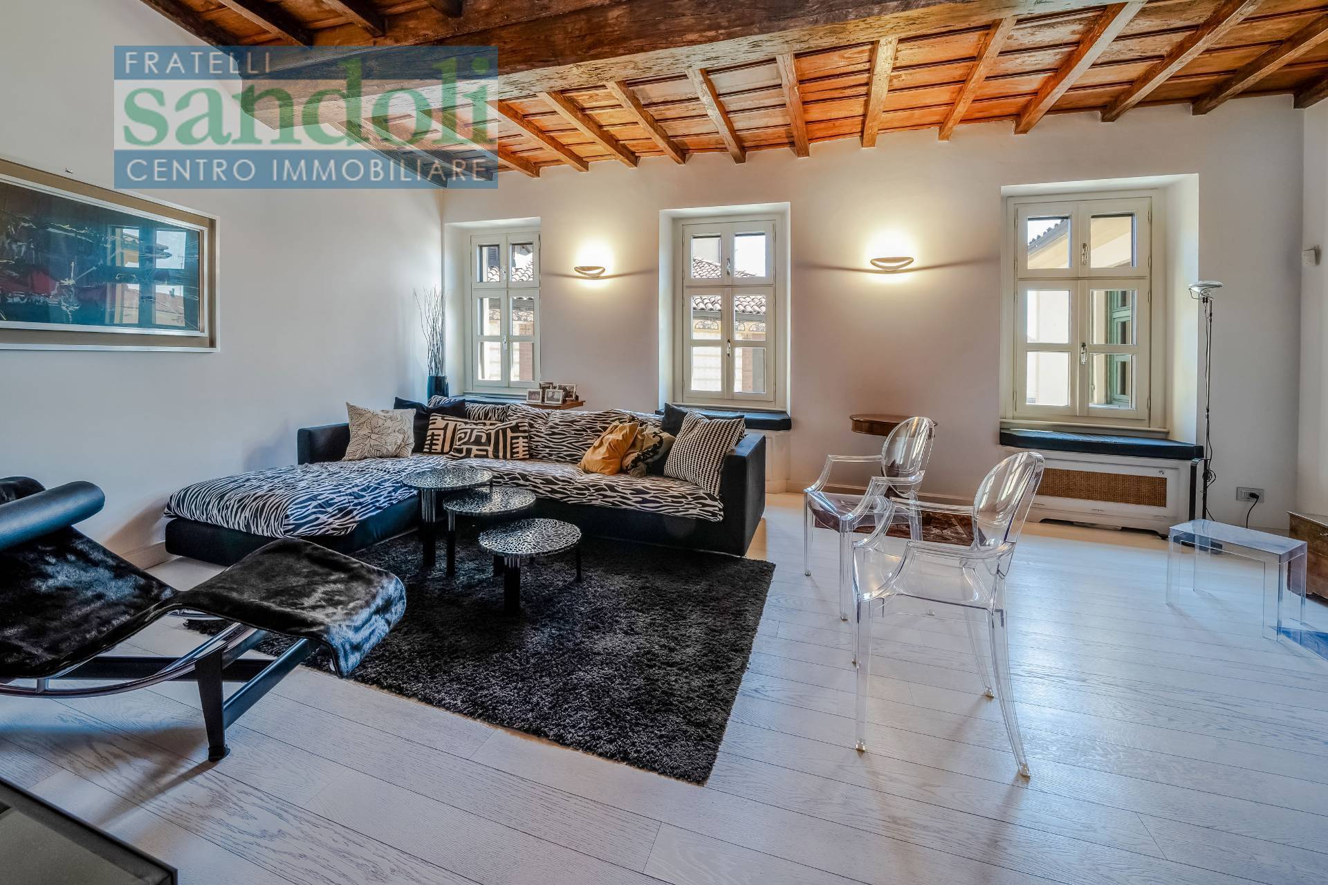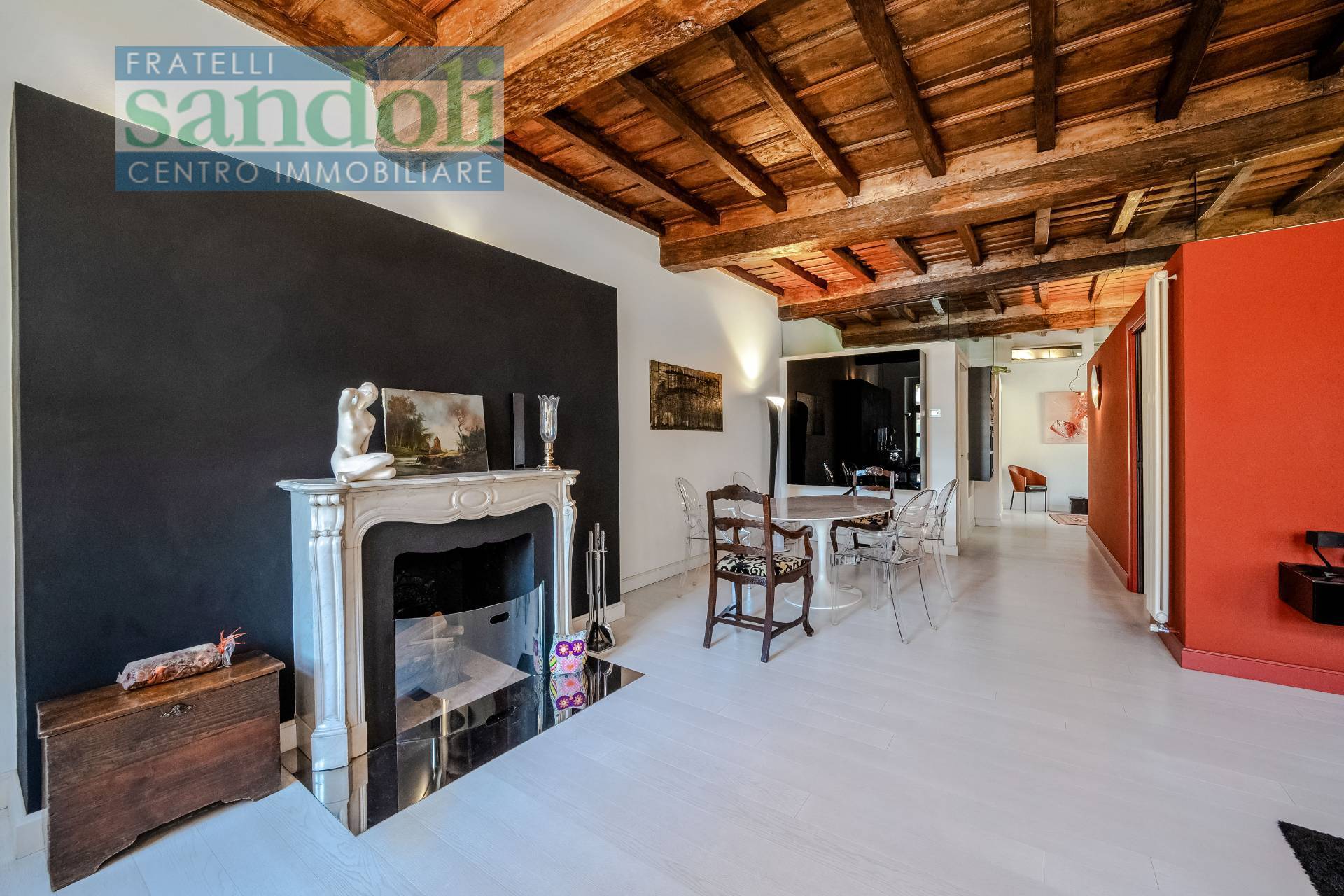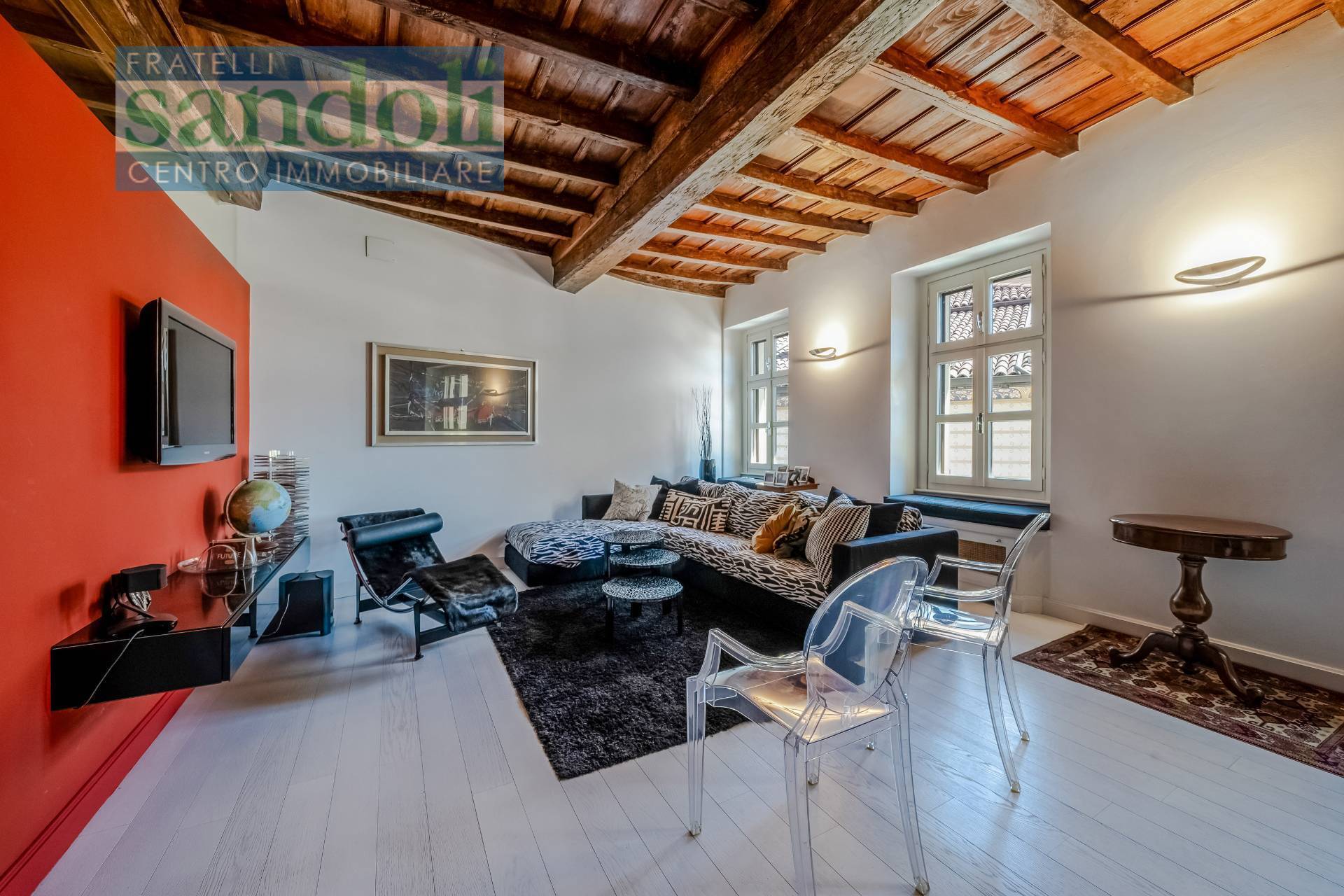 Di recente e signorile ristrutturazione l'appartamento ha degli stupendi soffitti a cassettoni antichi totalmente restaurati, i locali sono stati suddivisi per recuperare intelligentemente tutti gli spazi, dal piccolo disimpegno all'ingresso contraddistinto da un armadio a muro con porta in legno finemente cesellata, infatti accediamo direttamente alla stupenda zona giorno con ampio soggiorno molto luminoso con un impagabile vista sulla piazza Cavour e camino con cornice in marmo chiaro.
