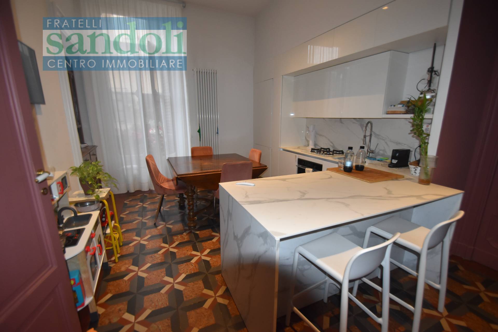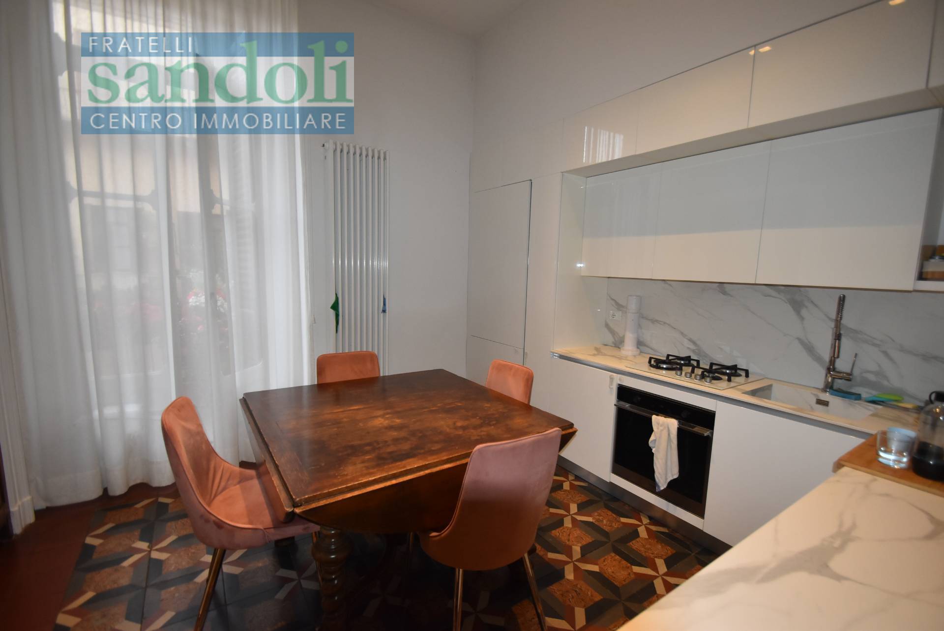 Proseguendo nella zona giorno, tramite un caratteristico disimpegno, arriviamo nella cucina, molto spaziosa, contraddistinta da una moderna controsoffittatura a faretti suddivisa in zona pranzo e e zona attrezzata per la cottura ed il lavaggio, pavimento d'epoca e portafinestra che da accesso al relativo balcone.